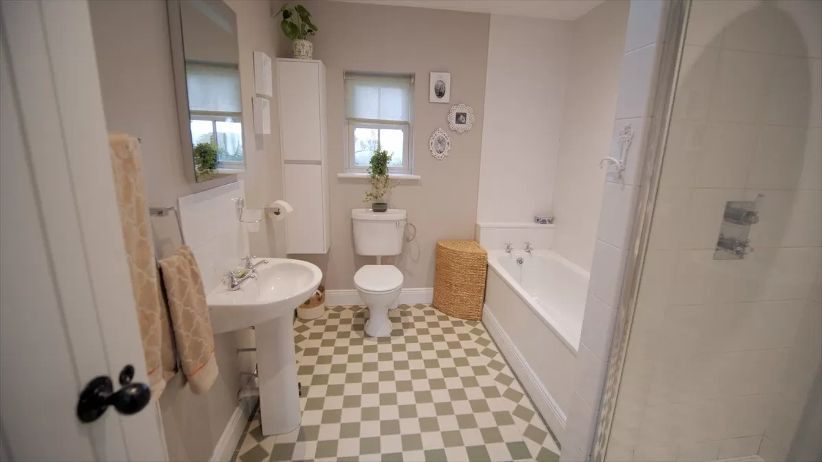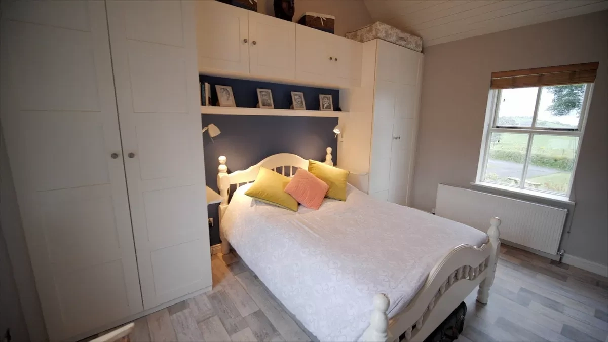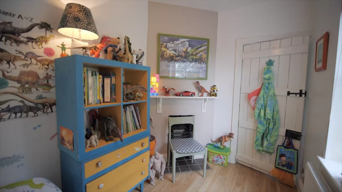 Either side of the living room is two double bedrooms, one with its own fireplace. There’s also a small box room here, currently used as a child’s bedroom, as well as a family bathroom.