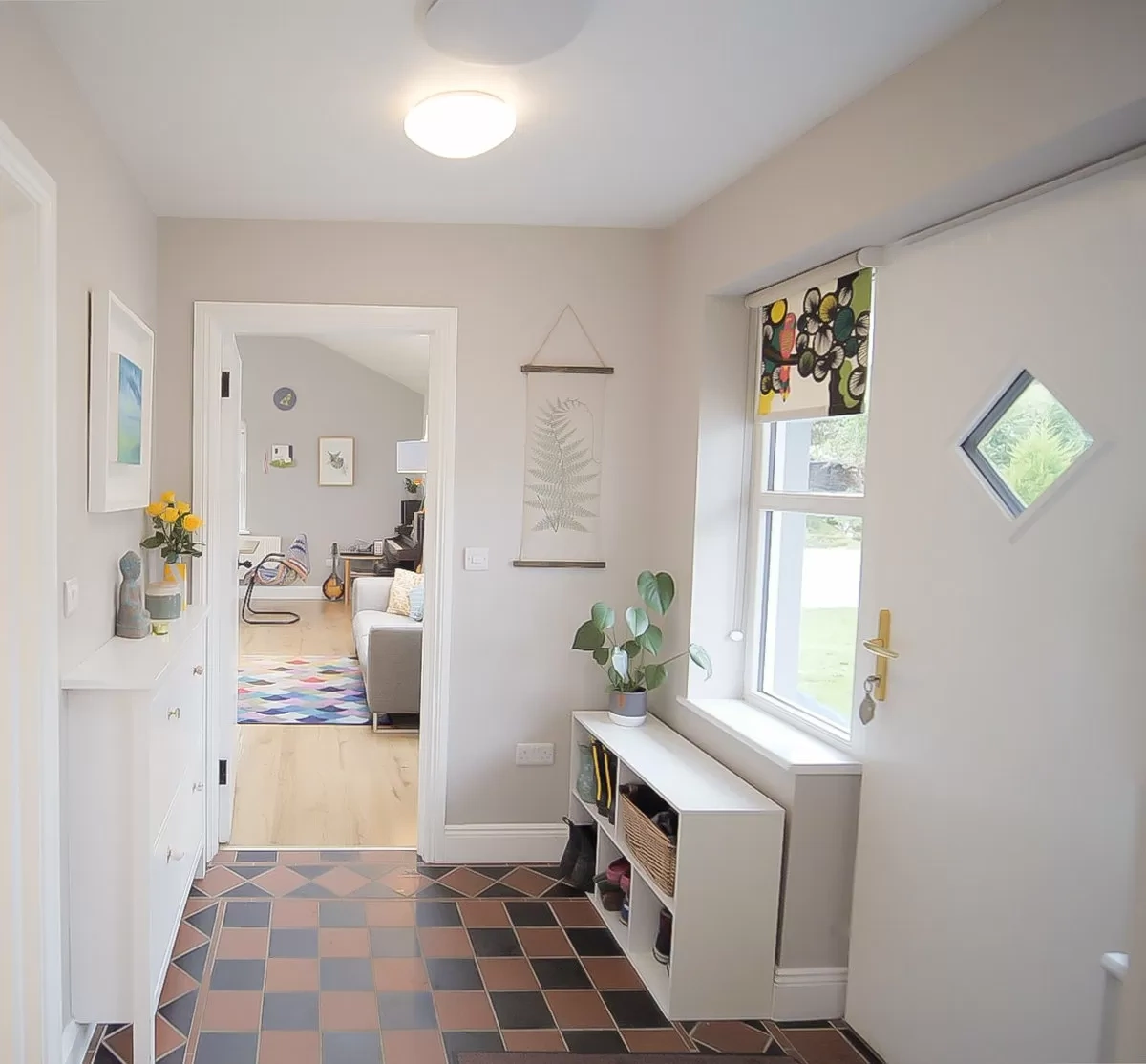 In the single-storey extension built in 2012, the yellow back door leads into a nicely proportioned hall, with traditional terracotta tiles that tie it in with the original farmhouse.