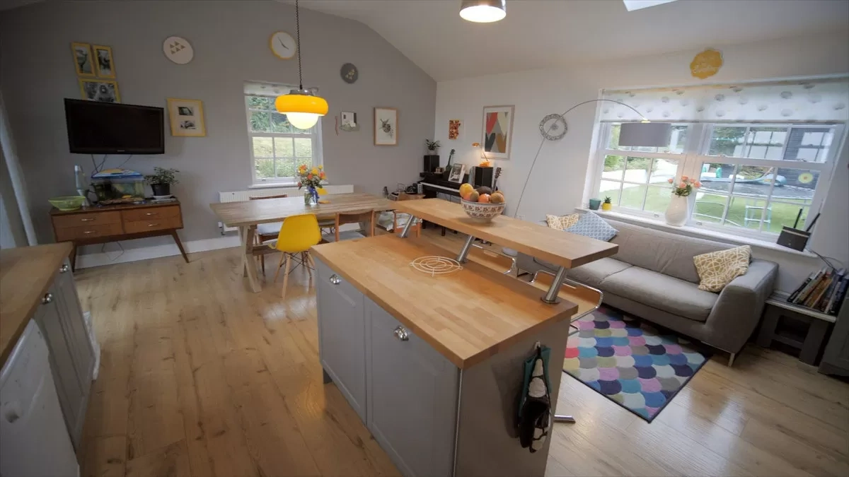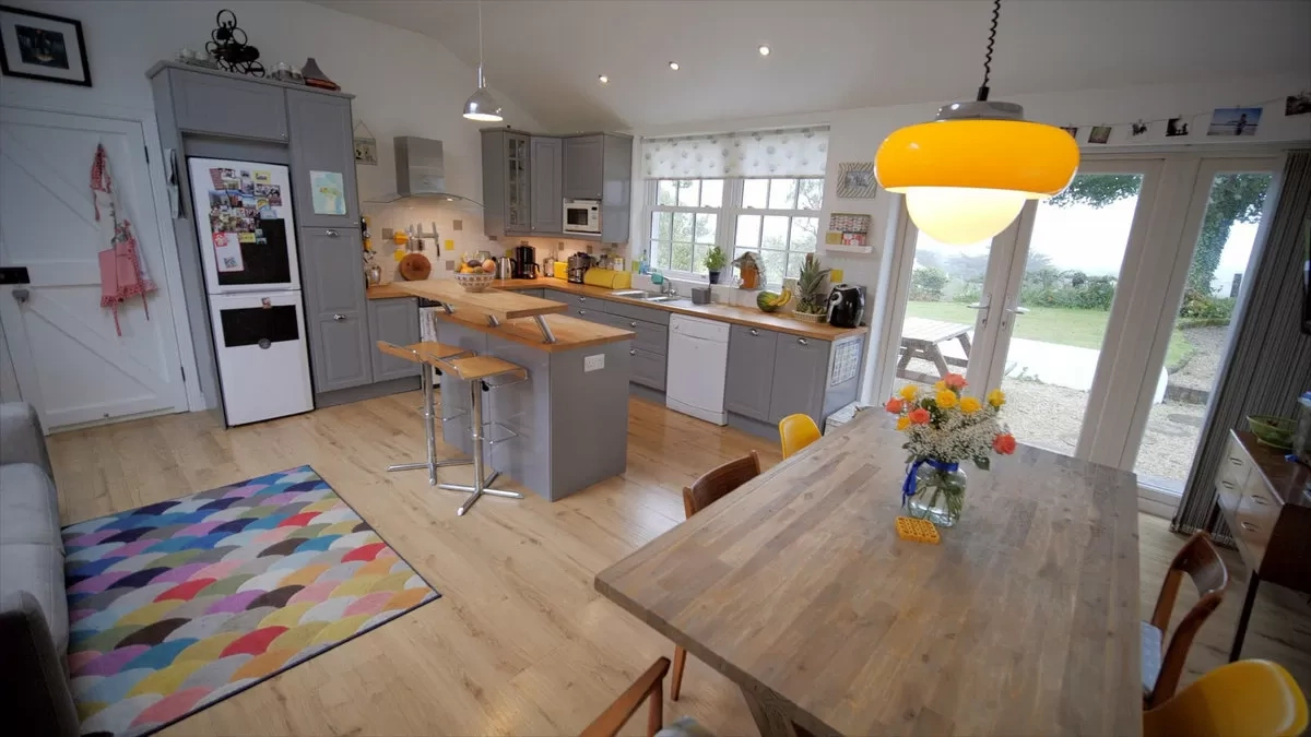 To the right the large kitchen/diner, with the ceiling height brought right into the eaves, double-sided views of the countryside and French doors onto the garden. The space is large enough for a seating area, piano and dining table, as well as a large grey kitchen with timber countertops and an island with a breakfast bar.