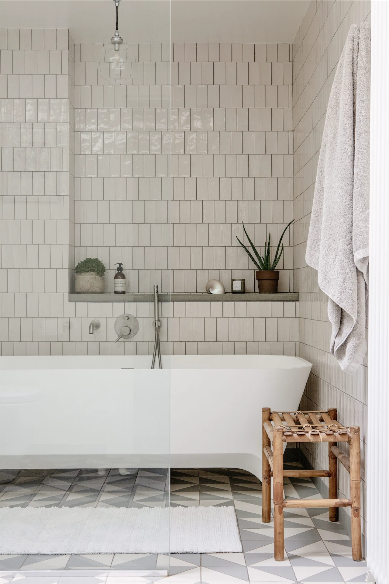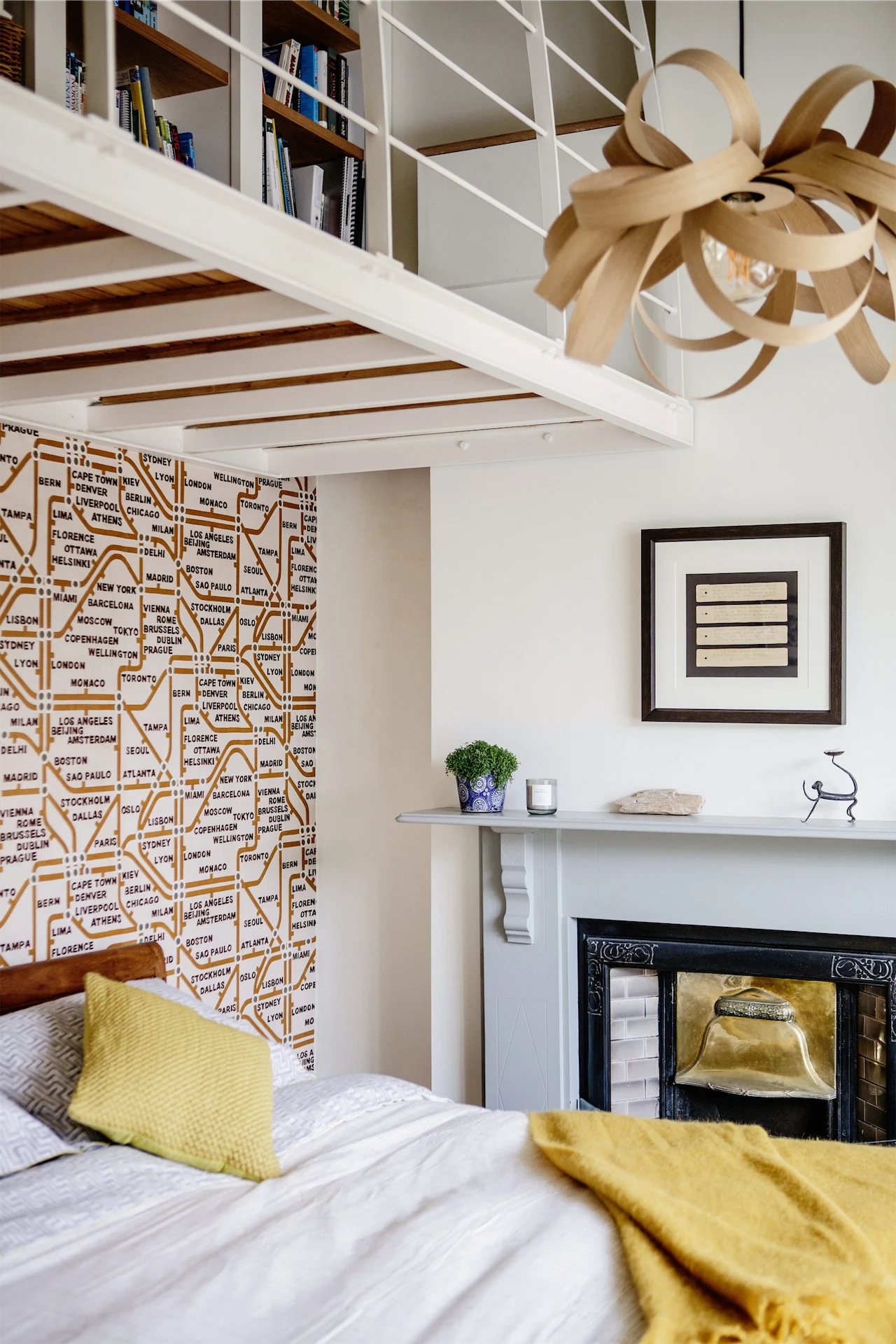 Minimalist in colour, the master bedroom is a nod to the restful retreat of a tired parent. A white stone bath sits in the window beside the curved white wall that hides the en suite. Downstairs has a more cheerful aesthetic with colourful printed wallpaper and pops of yellow and orange in the guest and kids’ bedrooms. The open-plan living and kitchen area, despite its scope, feels soft and cosy thanks to the low-beamed ceilings, white brick, stove and timber finishes.