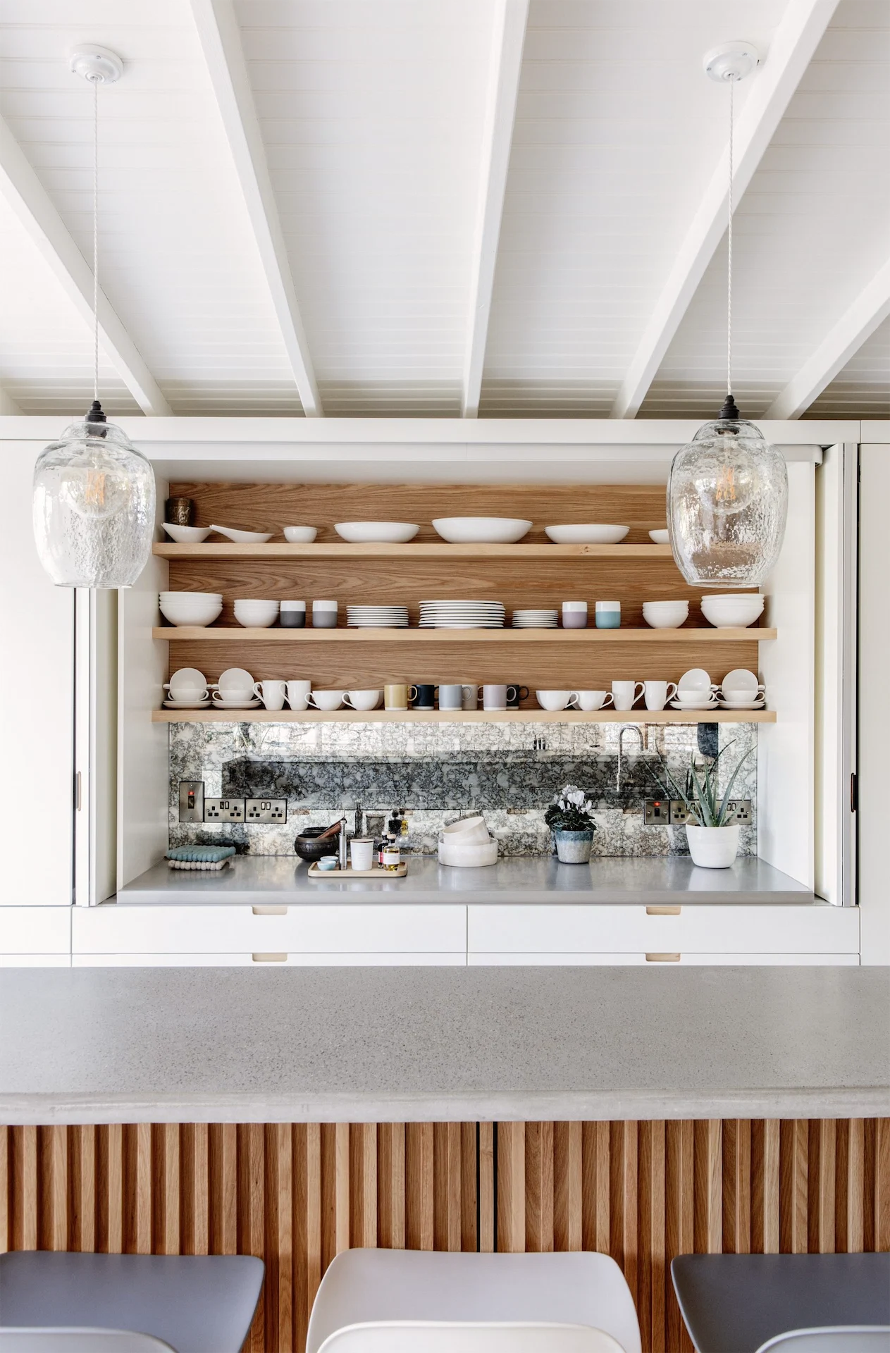 “It’s one of my favourite aspects of the house,” says Lynne. “There’s a great flow to the design, you can see the garden from the minute you open the front door, there’s so much light and yet it feels cosy, and I love the mix of materials, especially in the kitchen.” Far from a utilitarian kitchen look, Gillian blended stone and wood with shrewd design that folds almost all evidence of the kitchen away.