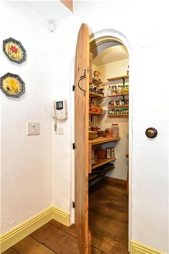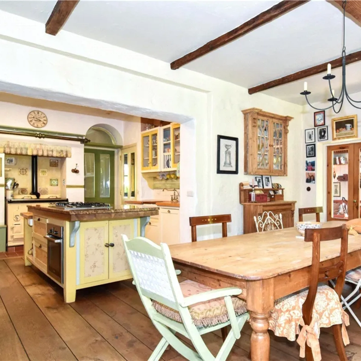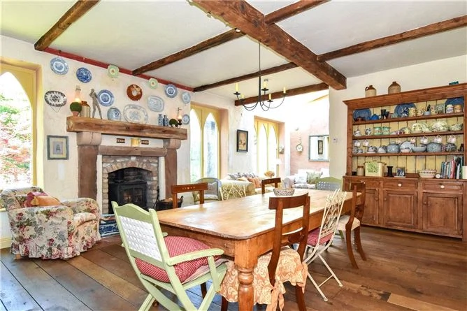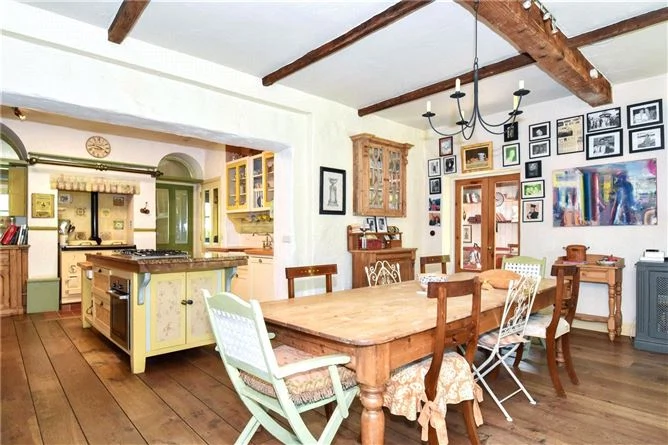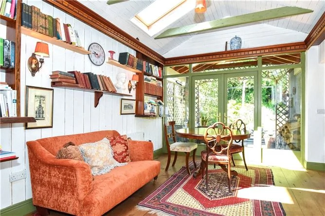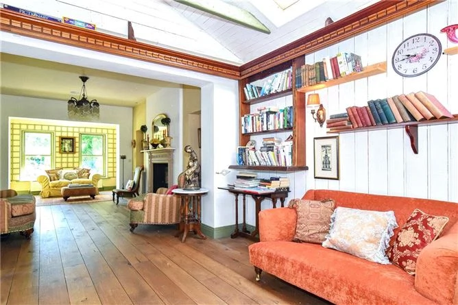 Reclaimed materials – including salvaged pitch-pine flooring and wide plan solid-oak sash windows and reclaimed Victorian doors – have been used throughout with great care and attention given to craftsmanship. Spanning approximately 291.12 sq.m over two stories, the ground floor is divided between large open-plan reception areas as well as smaller, private spaces. A long sweeping lounge with a Georgian fireplace is located to the front of the house, leading to a library reading room with French doors that open to a peaceful stream outside.