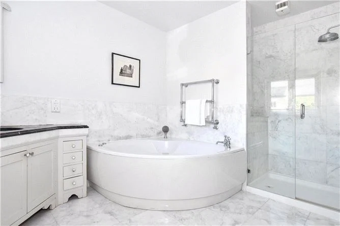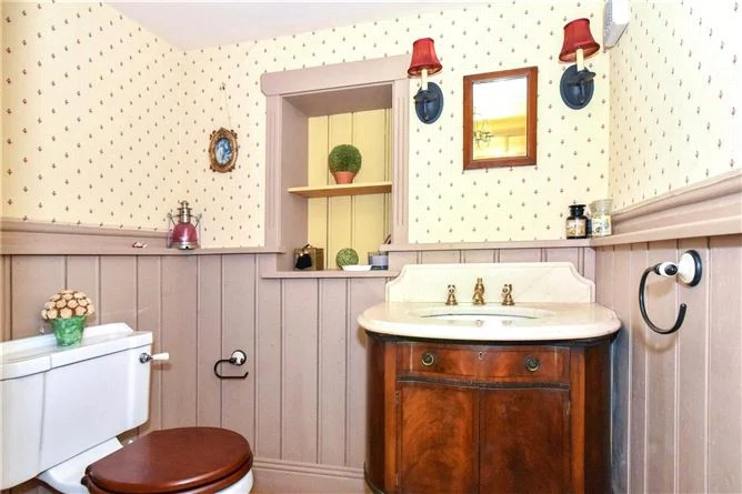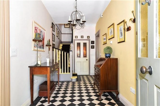 A welcoming entrance hall with checkerboard tiles greets you as you step inside. Originally built in the 1950s, the residence has been meticulously maintained by current owners and is reminiscent of a grand period-style home inspired by the Victorian era, Irish countryside and French provincial influences.