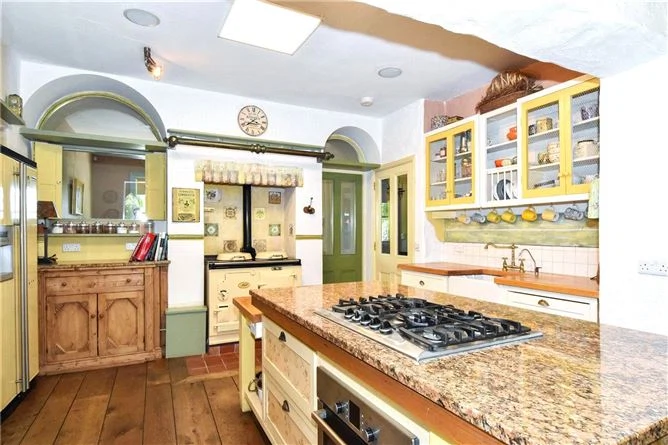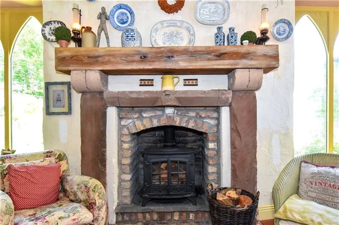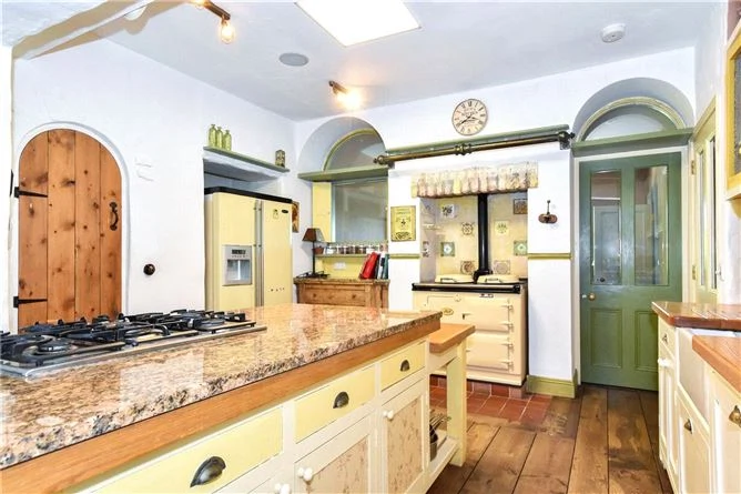 Off this area is the open-plan kitchen-dining room, family room and sun lounge. The kitchen area consists of an Aga, pantry and island countertop with stove centre, whilst a wood-burning stove with old brick surround can be found at the other end of the room.