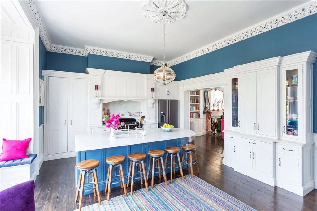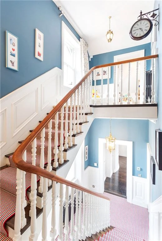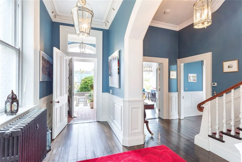 Up the exposed granite steps and into an impressive central hallway on the entrance level, the scope of the house is really visible as soon as you cross the threshold. Beautifully lit thanks to a large Georgian window, it boasts many ornate original features that are visible through the house.