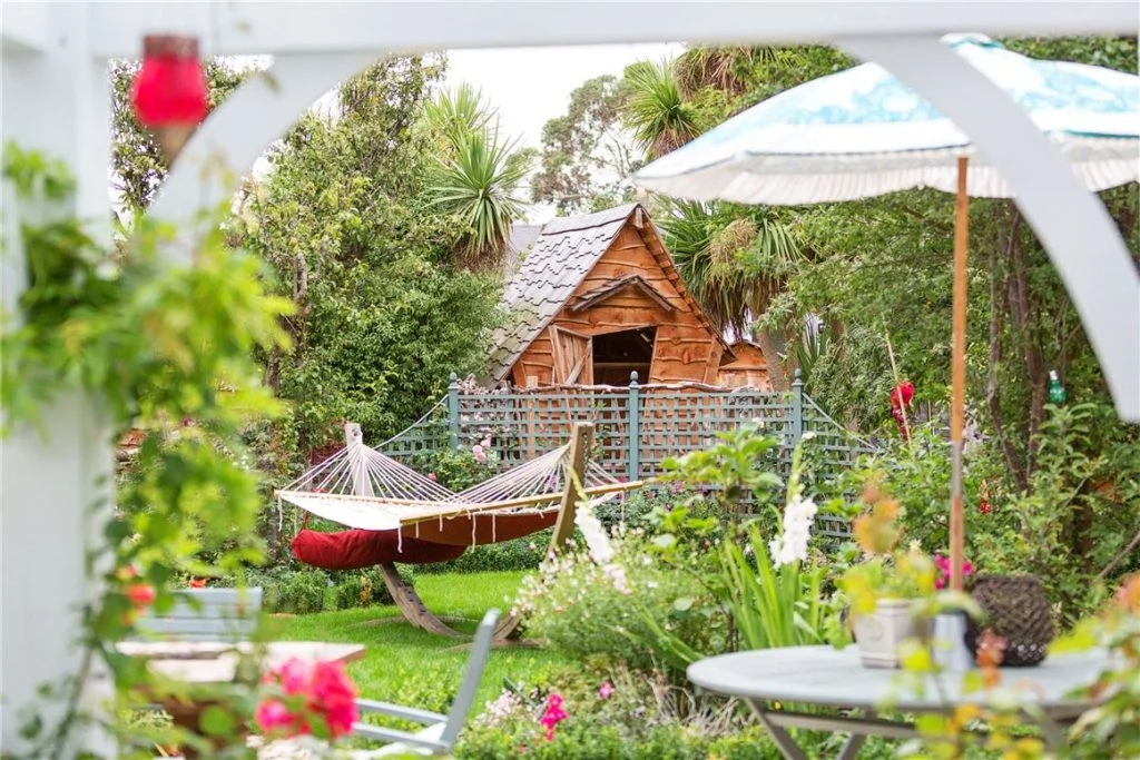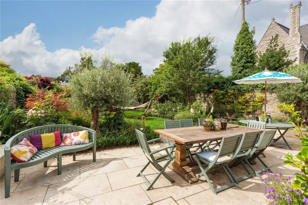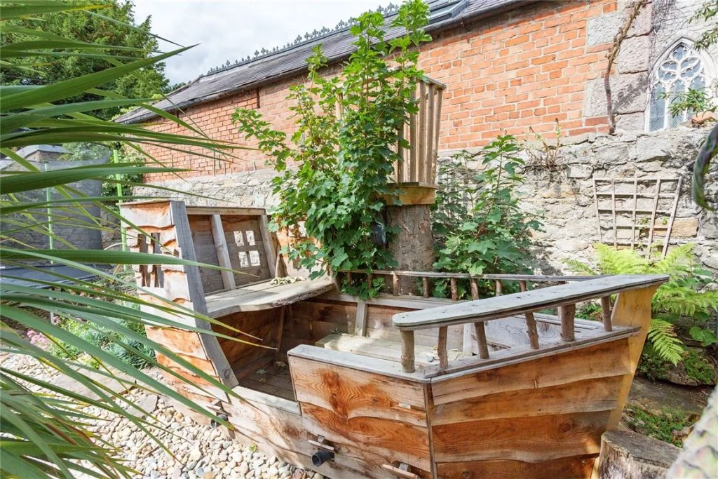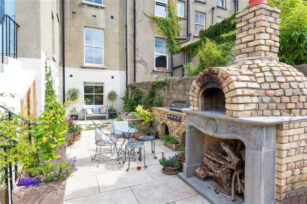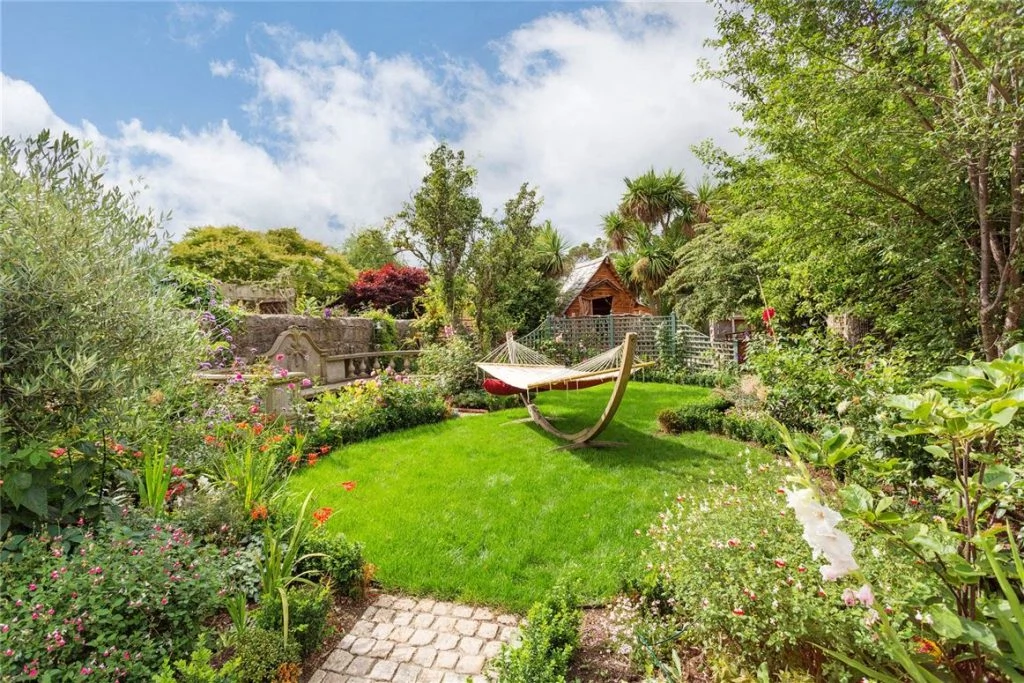 The main patio has ample space for a large table and seating, with a chimney brick pizza oven perfect for summer evenings. At the back is a children’s play area with a custom-built fairytale playhouse and a pirate ship seating area, as well as a miniature Giant’s Causeway.