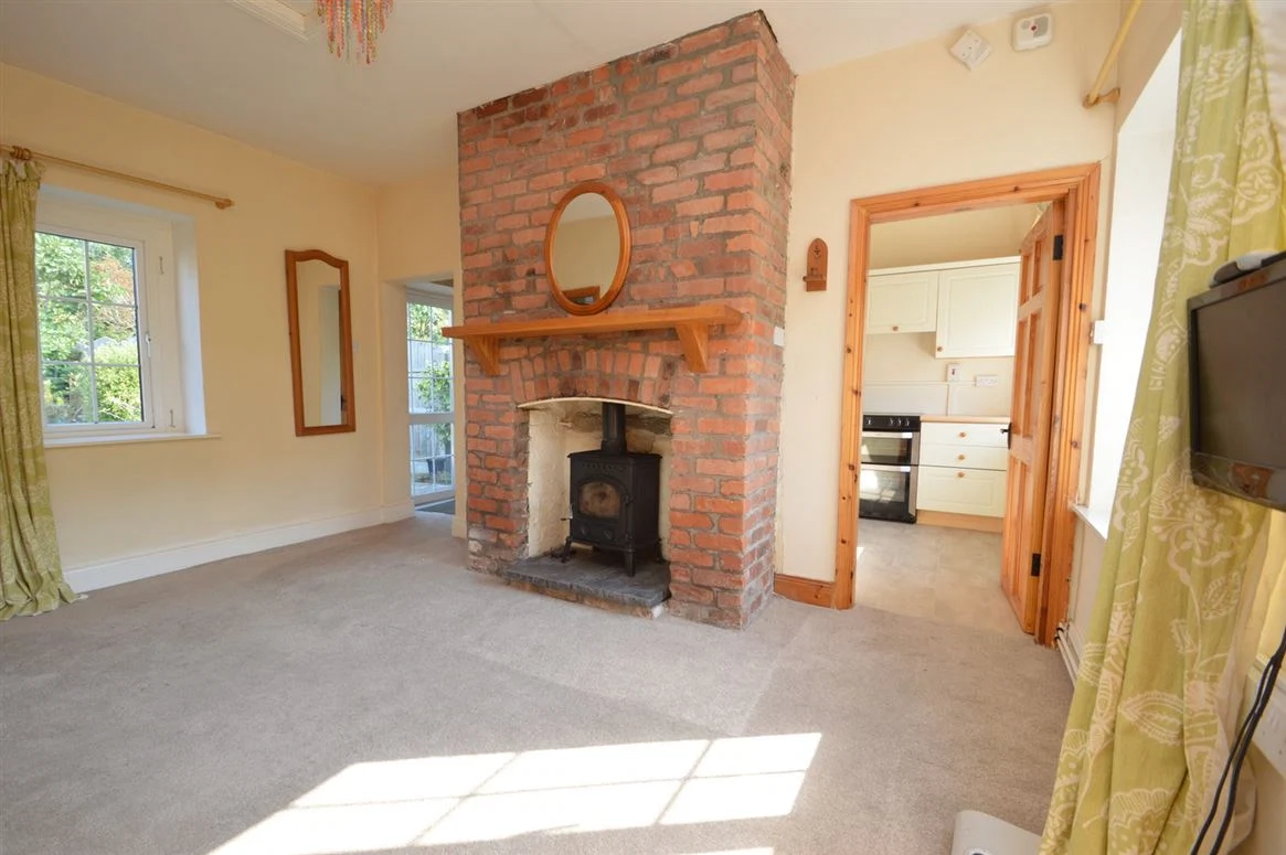 The living area of this Cork cottage is a dual-aspect room, allowing for more natural light to fill the space and for views of both the front and back gardens. The floor is carpeted, and a wood-burning stove has been fitted within the gorgeous brick surround fireplace, and the overall area is very impactful.