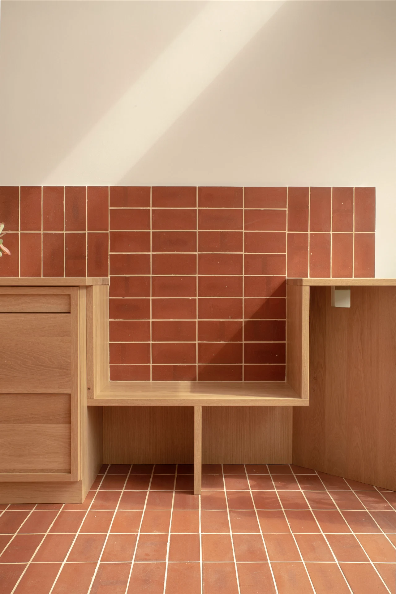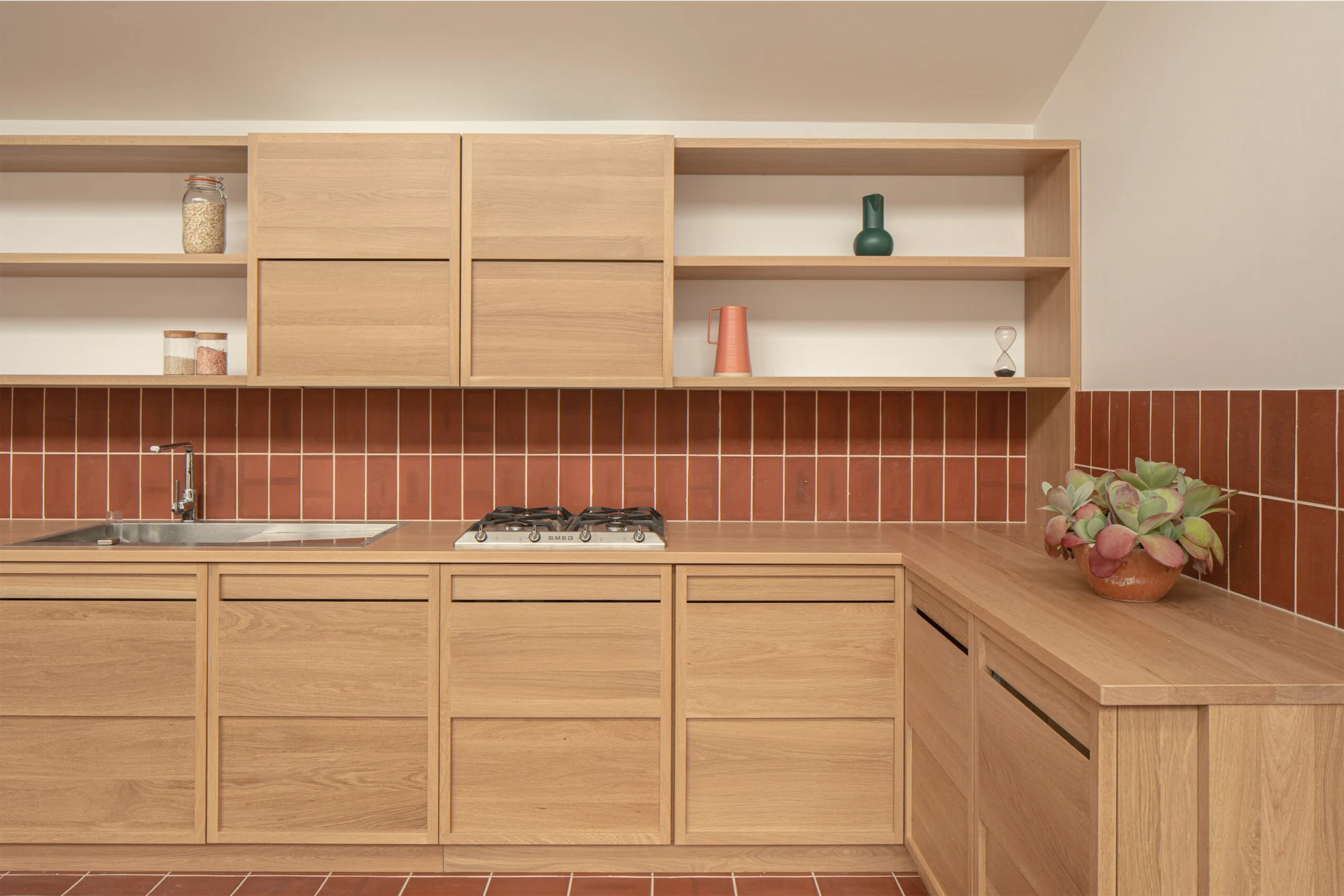 The result feels warm yet clean and calm, perfect for gathering. The oak kitchen bench acts as a focal point for the space, and provides a place to sit and chat while someone is cooking or to sit out and look at the garden.