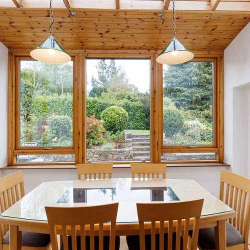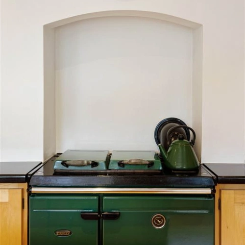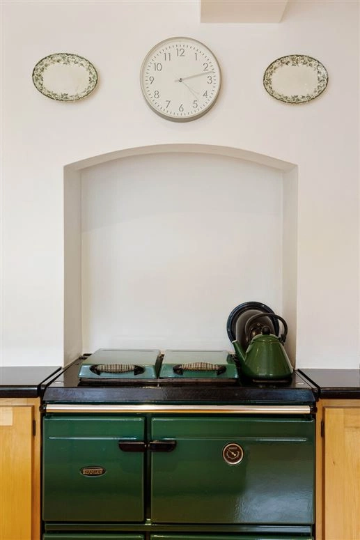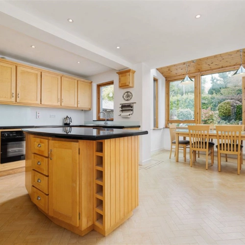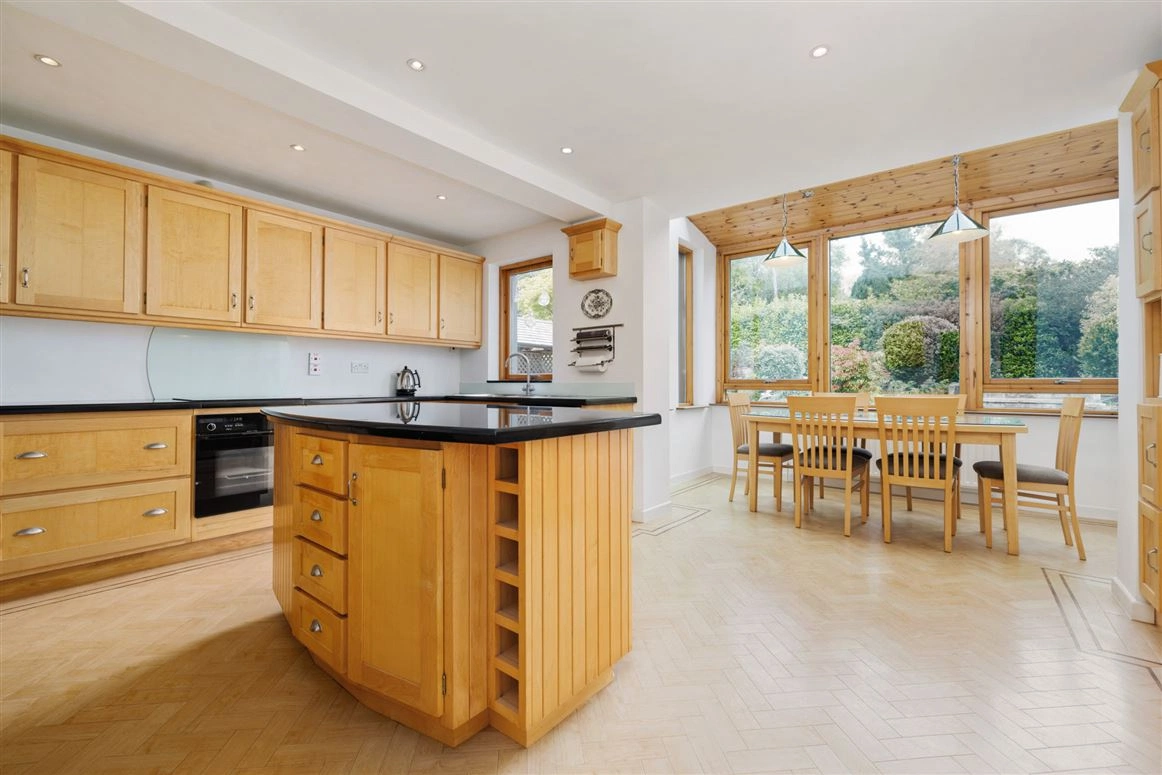 Further along is the kitchen, which was extended to create a glazed dining space. Fitted with granite-topped custom cabinetry, this room also features a stand-alone island with wine storage. A dining table and chairs sit at the far end of the room, with a picture-perfect view of the garden outside.