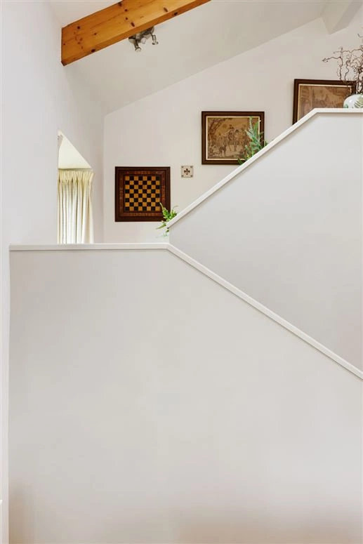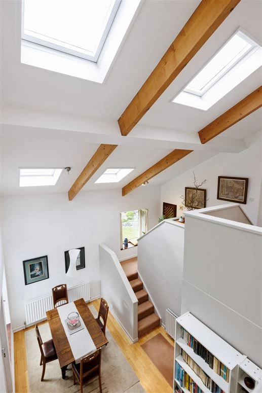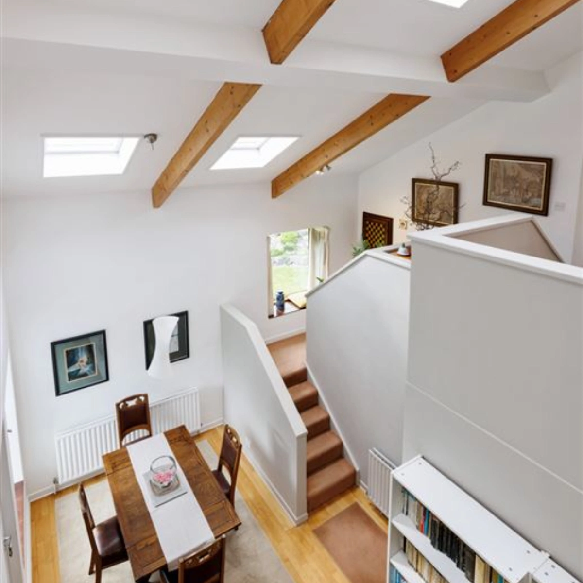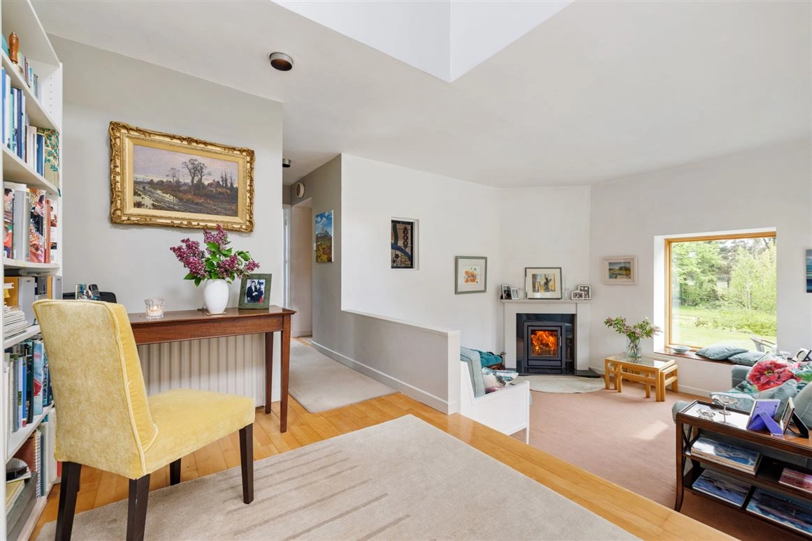 An unusual iroko wood bridge leads to the front door which opens onto a spacious reception area with a dramatic vaulted ceiling and exposed wooden beams. Natural light floods this space by way of numerous windows, roof lights and glazed doors – each capturing a different snapshot of the grounds. Designed in the 1980s, the interior is bright and minimal, mirroring its beautiful, calm surroundings.
