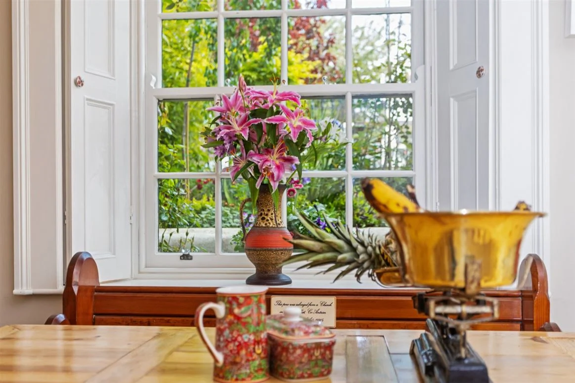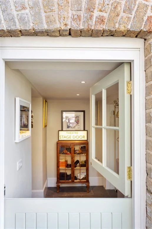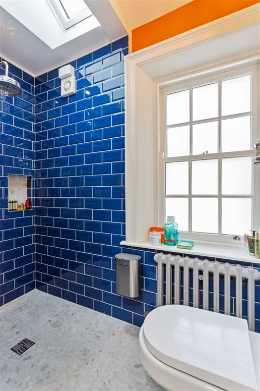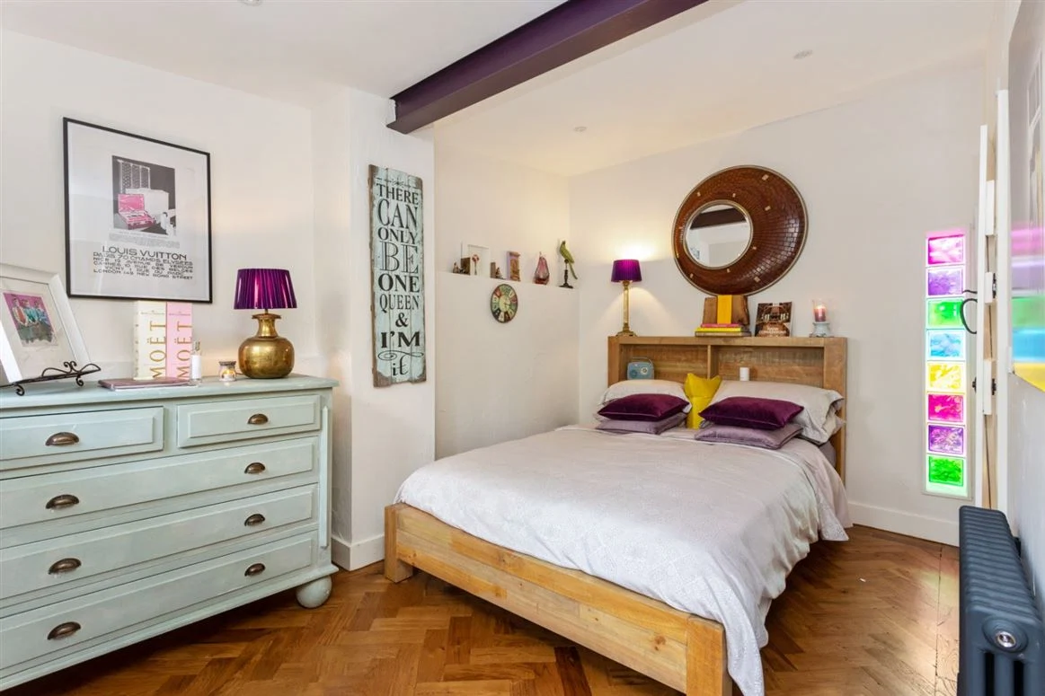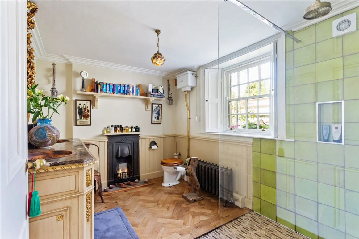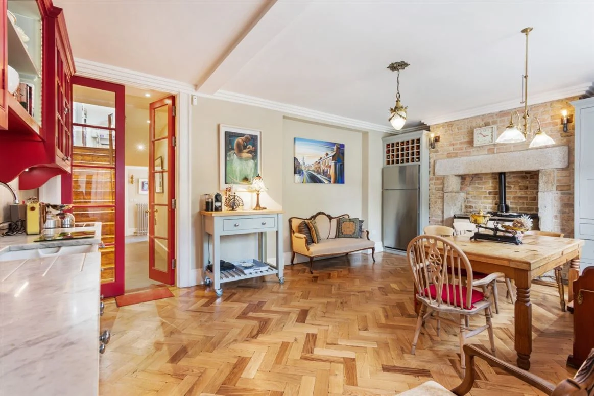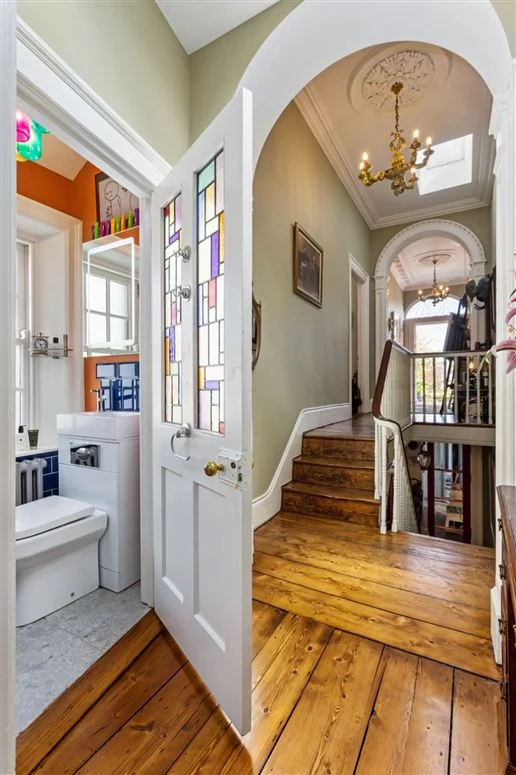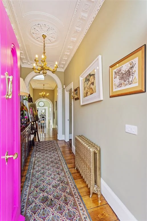 The pink front door sets the tone for the rest of the house, and you enter into a hallway with three arches and a ceiling reaching to 11 feet. A gold-plated cast-iron radiator contrasts with the original floorboards, which were supplemented with carefully-matched replacements where required.