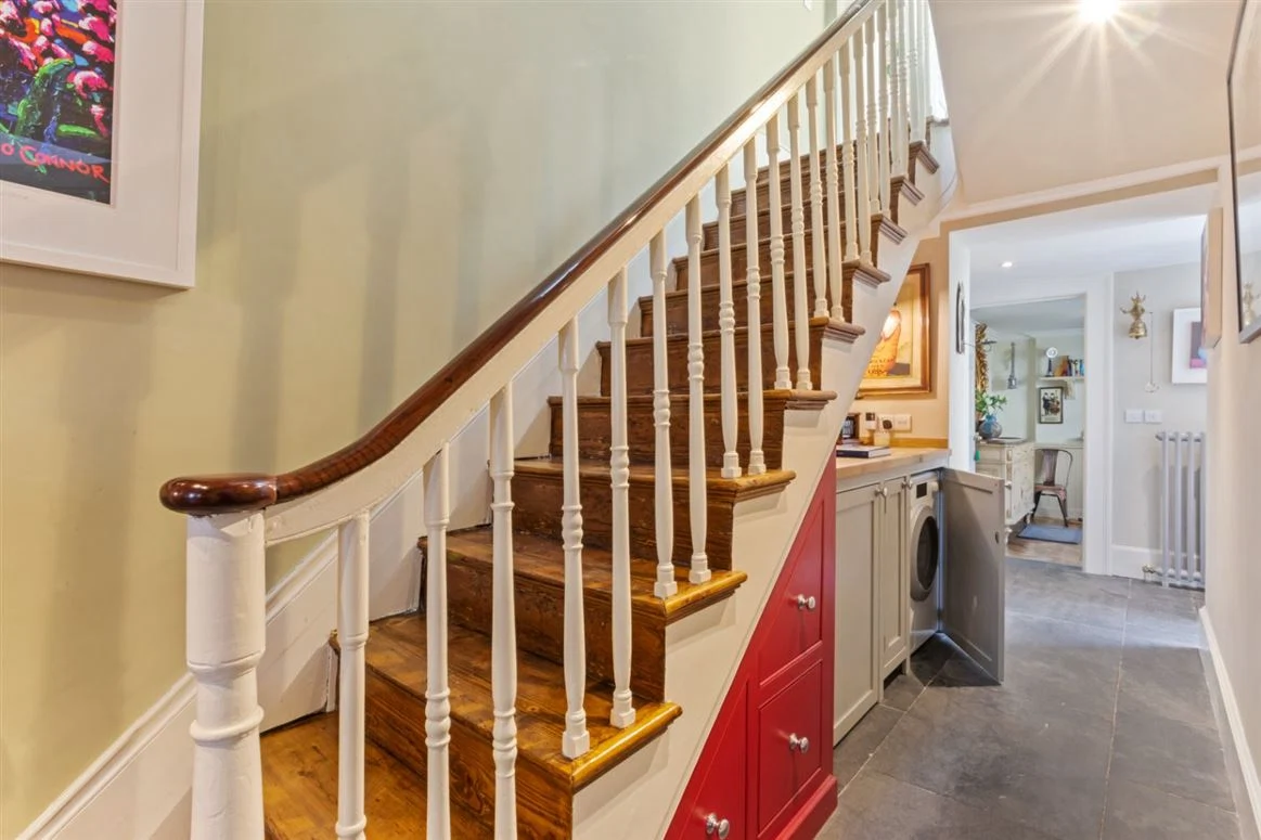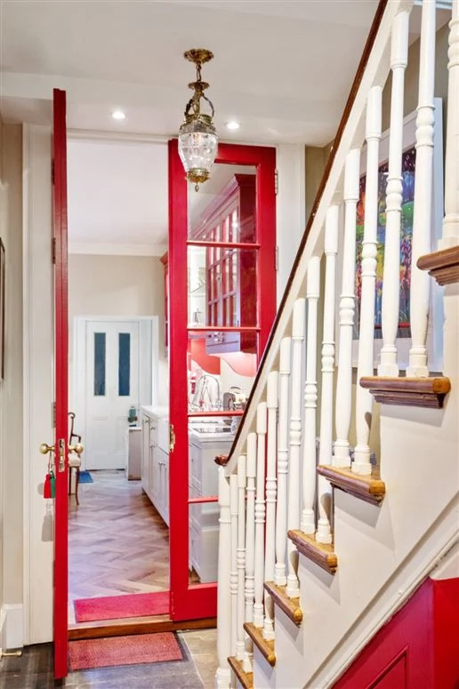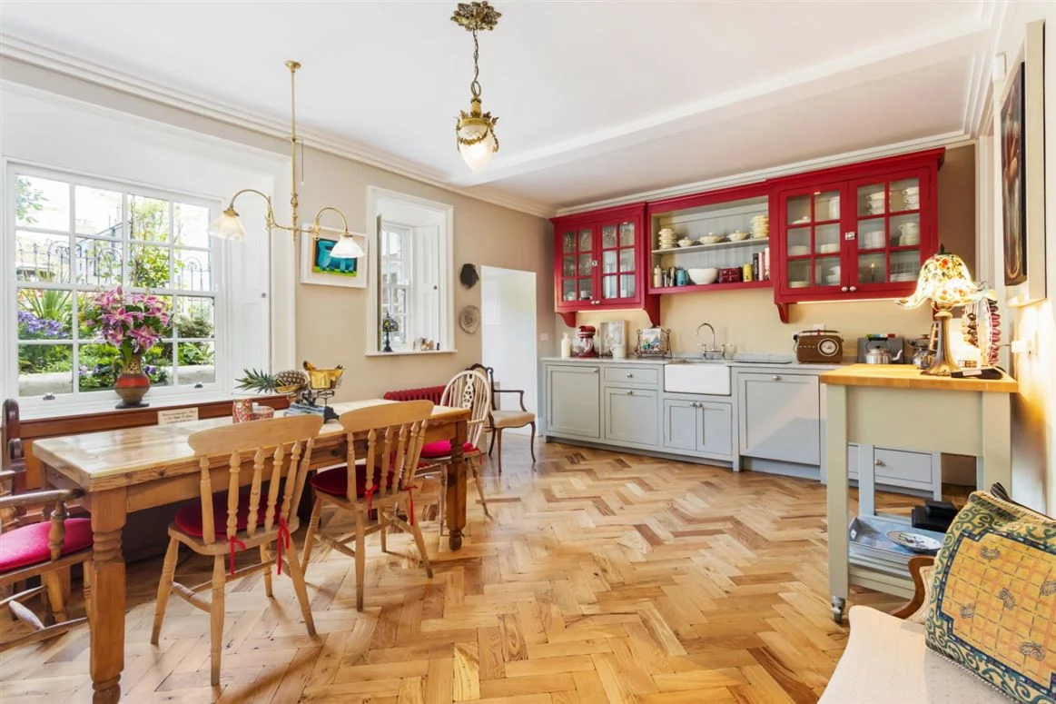 The restored mahogany staircase brings you down to the garden level, where the kitchen and dining space is. The wooden kitchen units are handmade, and painted in Farrow & Ball’s Rectory Red and Lamp Room Gray.