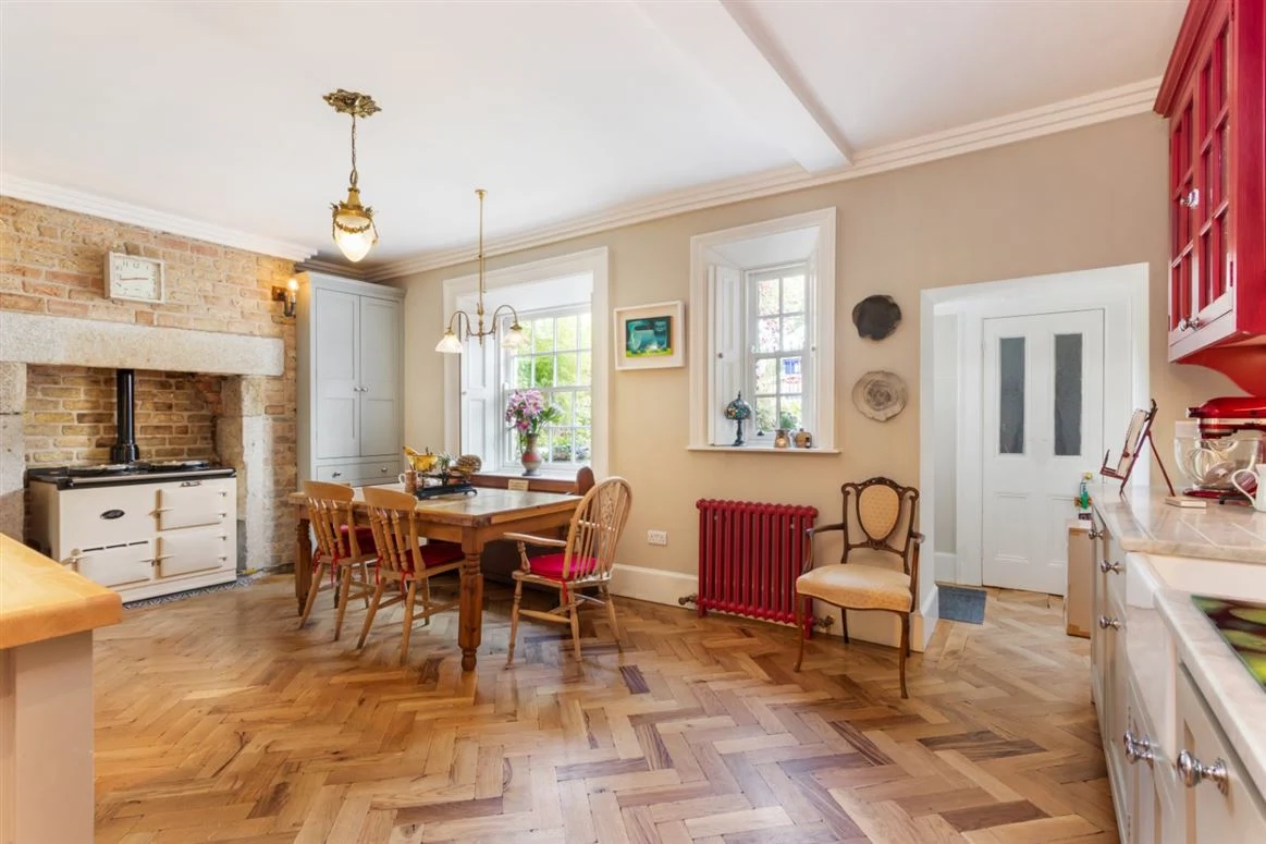 An Aga sits pride of place within an exposed stone wall, while the beautiful herringbone oak floor was reclaimed from a church in Belfast. A pantry cupboard and a Belfast sink are also attractive features.
