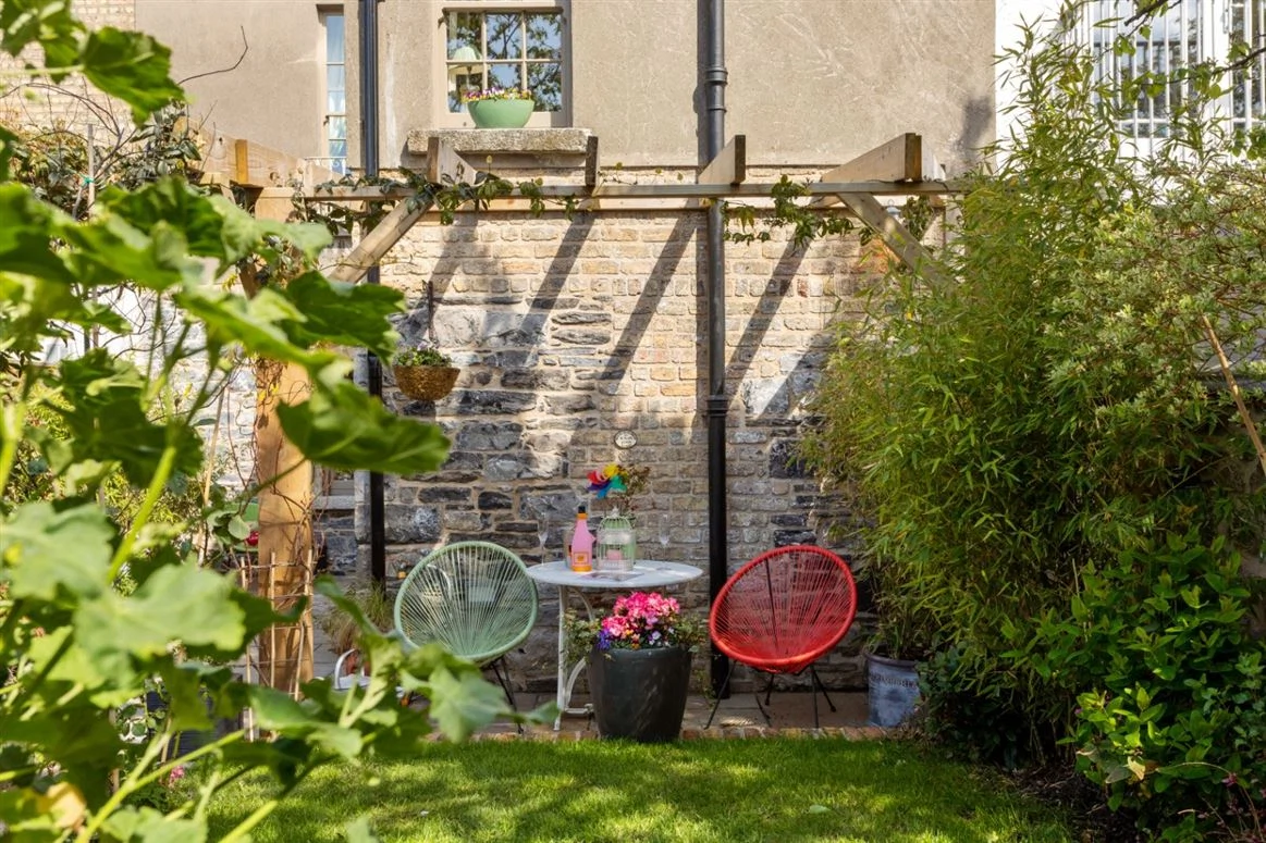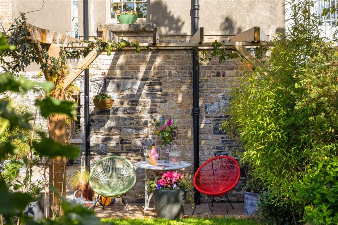 Under the stairs is a clever utility area, while the third bedroom and a second bathroom are also located on this level. Outside, the walled garden has three distinct sections, with space for seating as well as many plants.