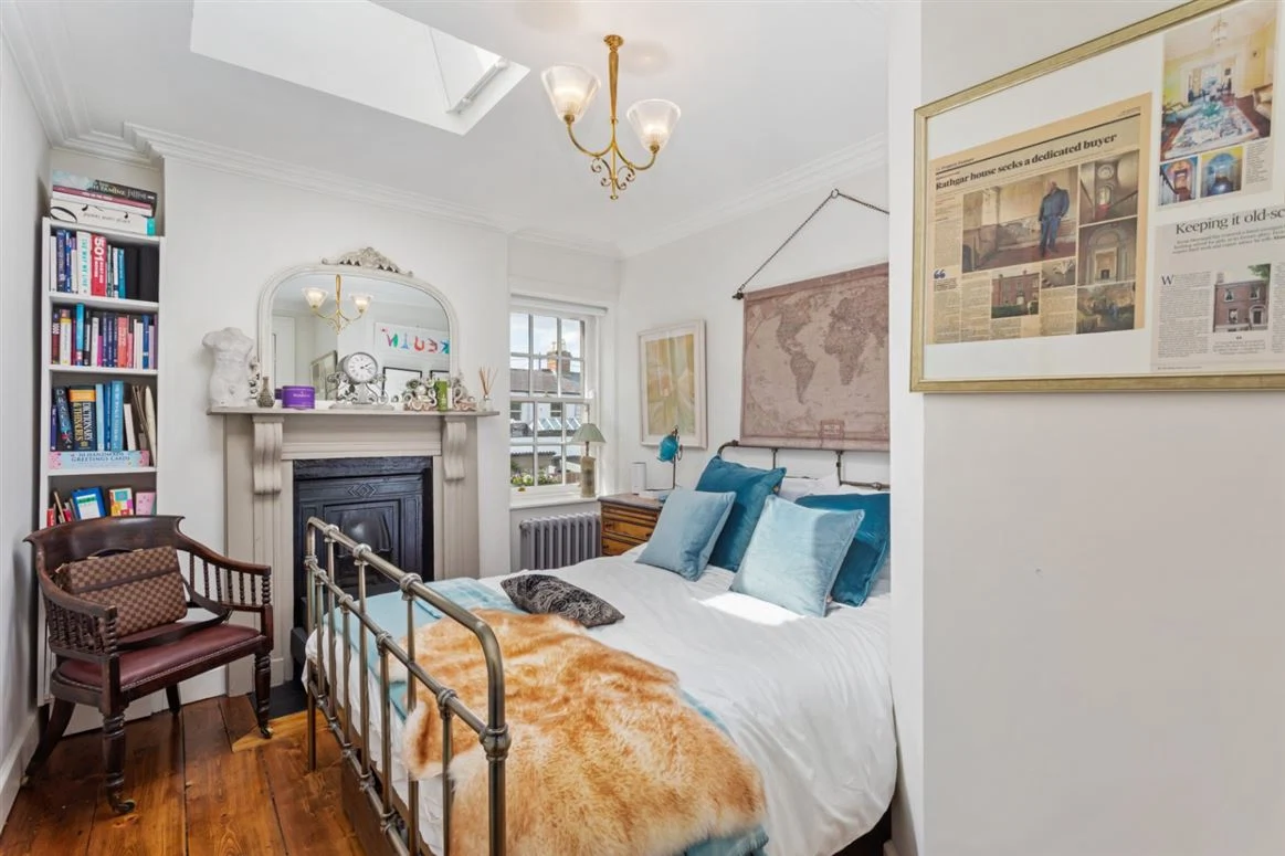 The main reception room has an Italian Carrara marble fireplace, and a sash window with original shutters. The main bedroom is also on this level, sitting at the back of the house. It too has a fireplace, sash window, shutters and decorative coving, while a Juliet balcony looks out to the back garden.