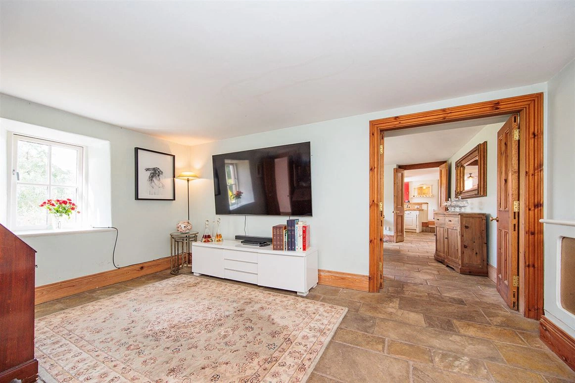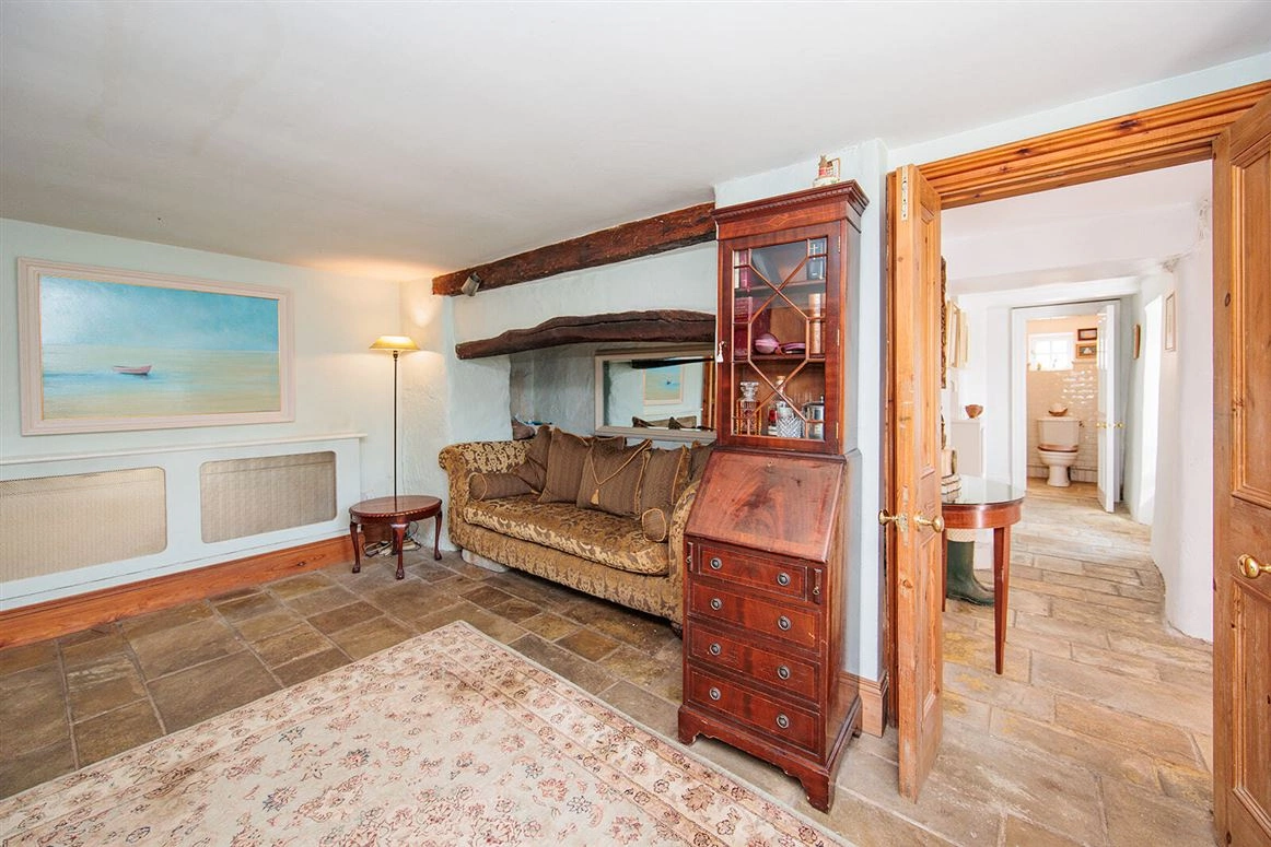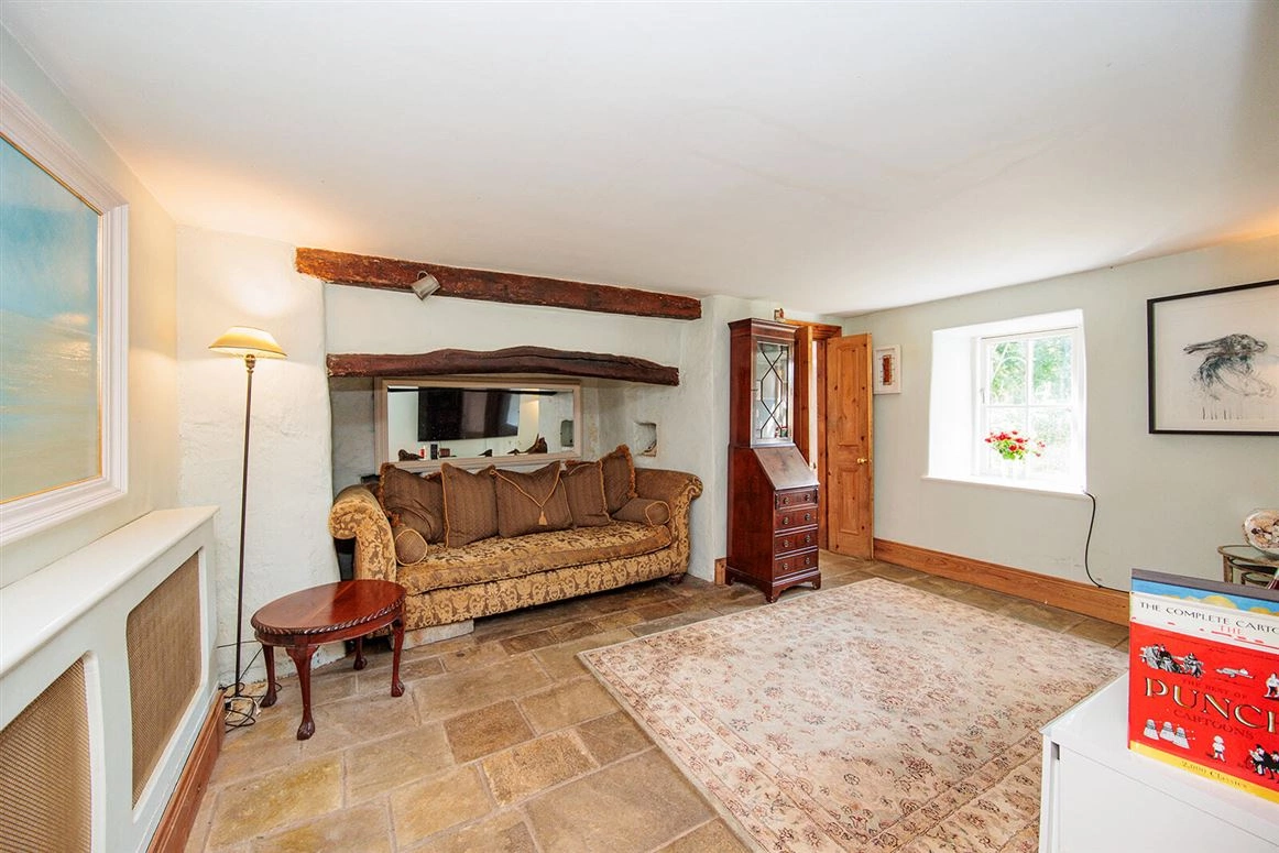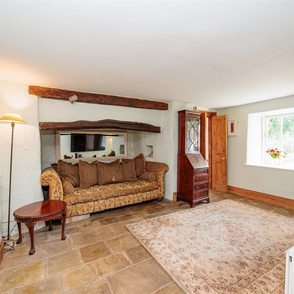 Donegal Quartz tiles line the floor in the entrance hall while a carpeted staircase leads up to the first floor. Double doors open into the living room. Spacious and light filled, a south-facing window overlooks the river outside while an original Inglenook fireplace with two wooden beams warms the room on colder days