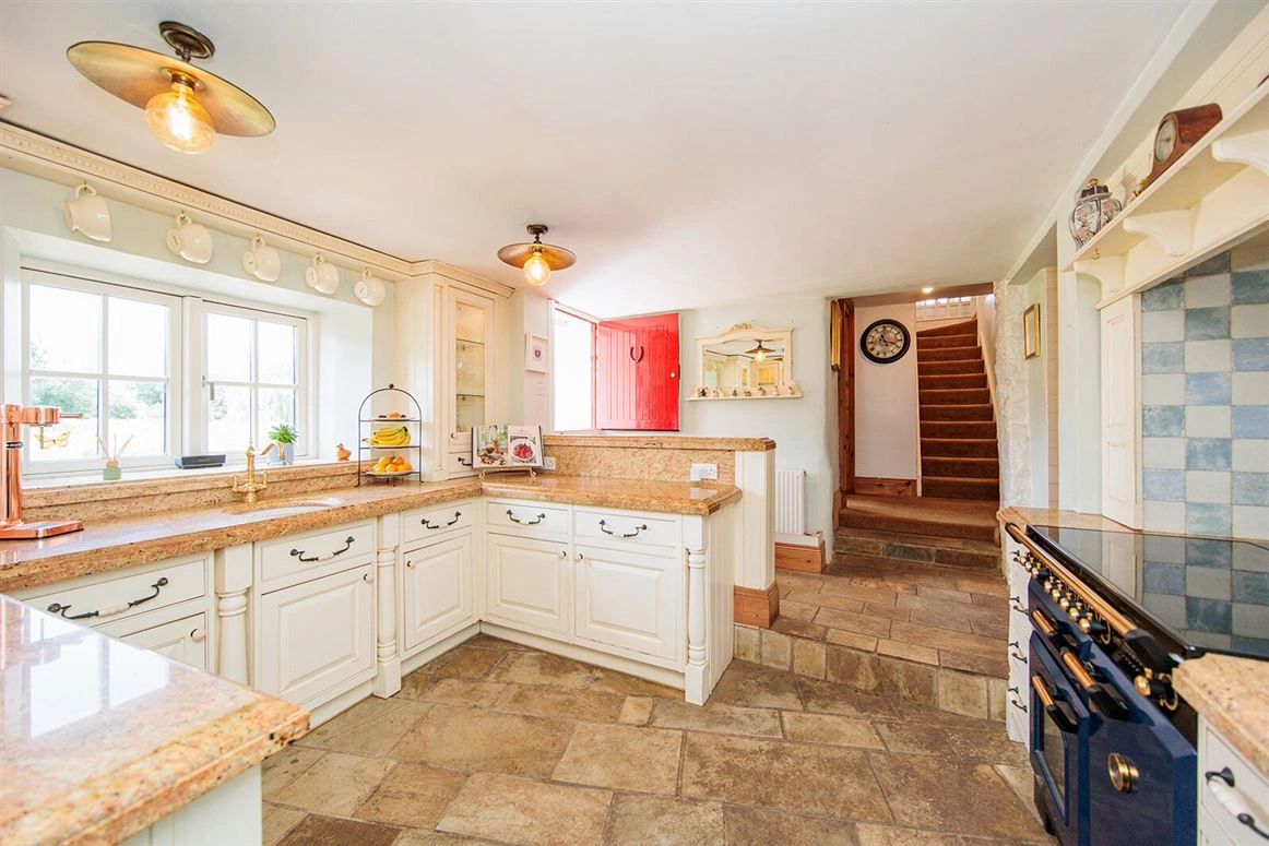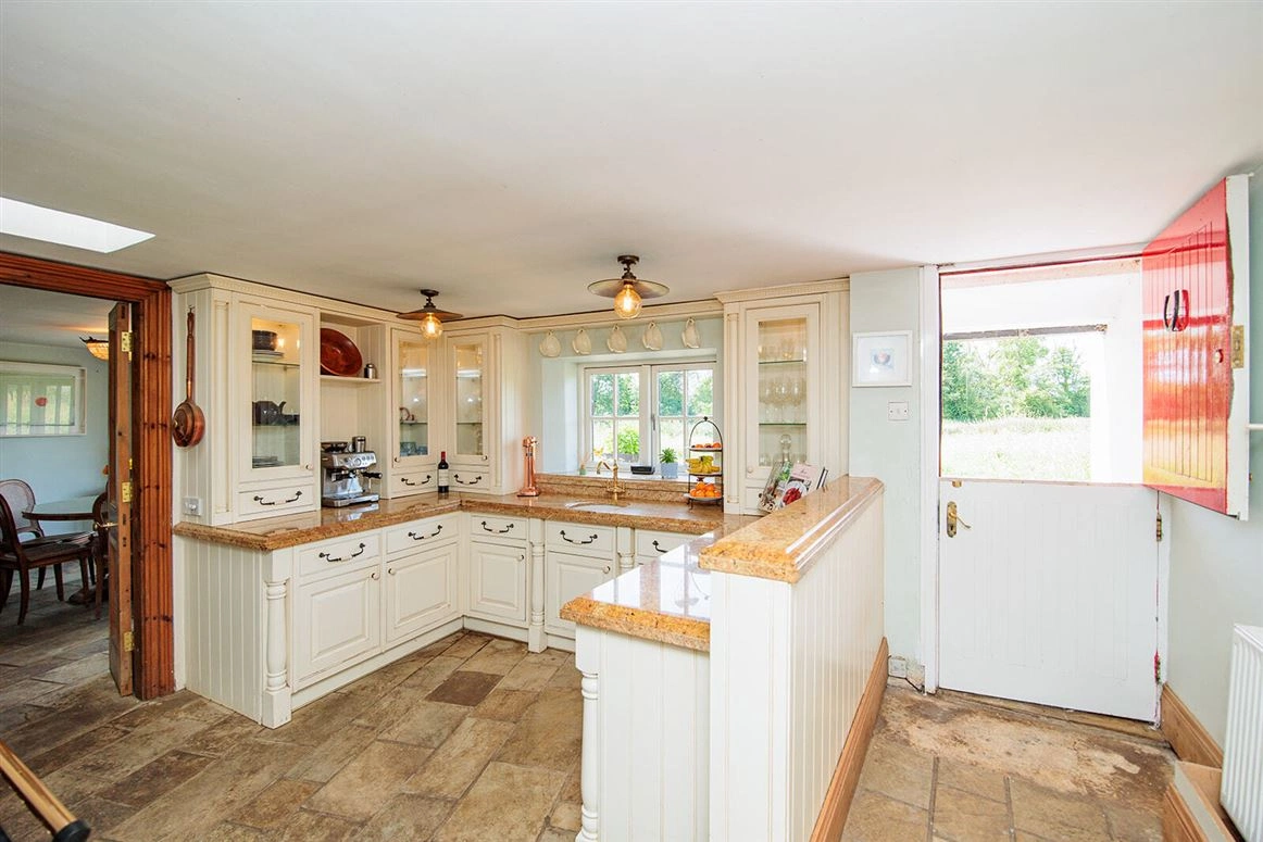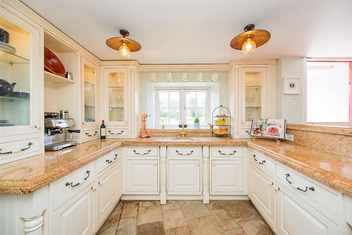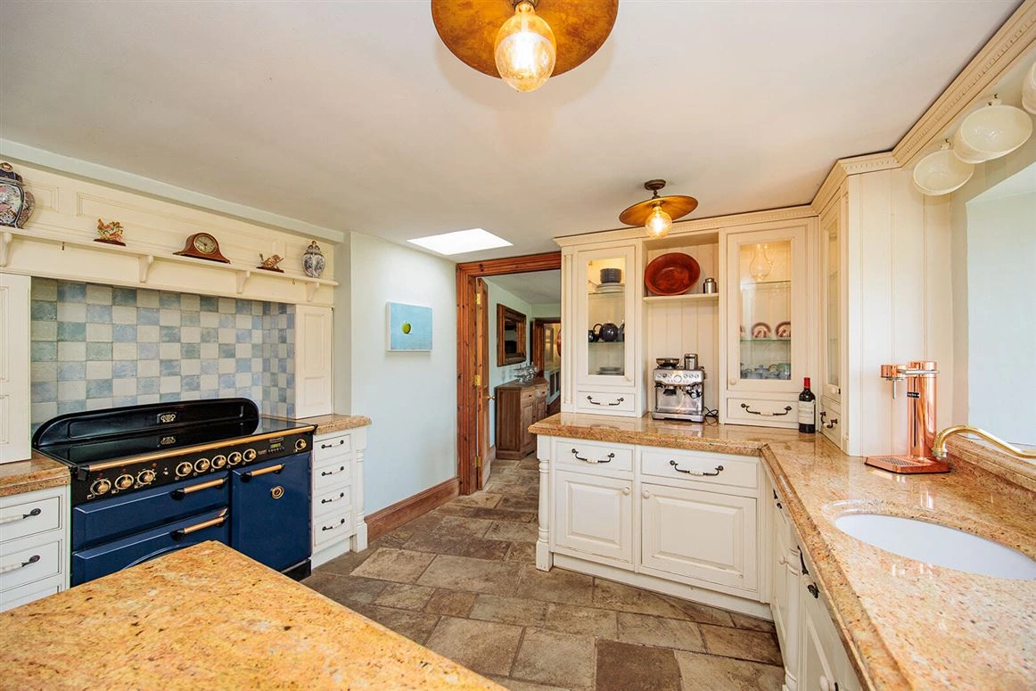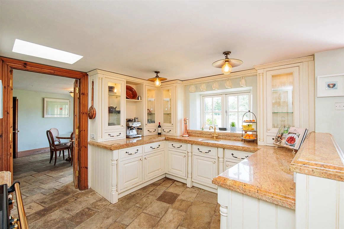 In the dining room, there is a large south-facing feature picture window to the front of the property. Further inside is the kitchen. Handmade ivory coloured units provide storage, complemented by a granite worktop and undermount kitchen sink. A feature wooden half door leads out to the front of the property while there is open plan access to the utility.