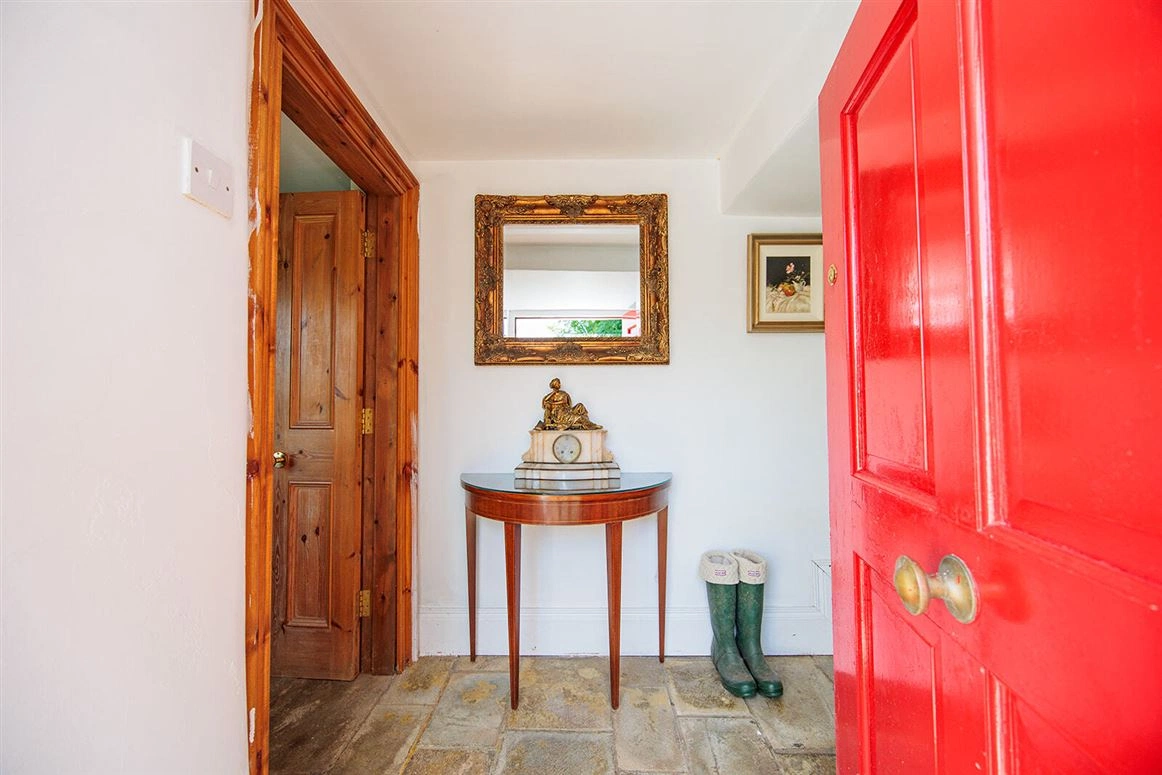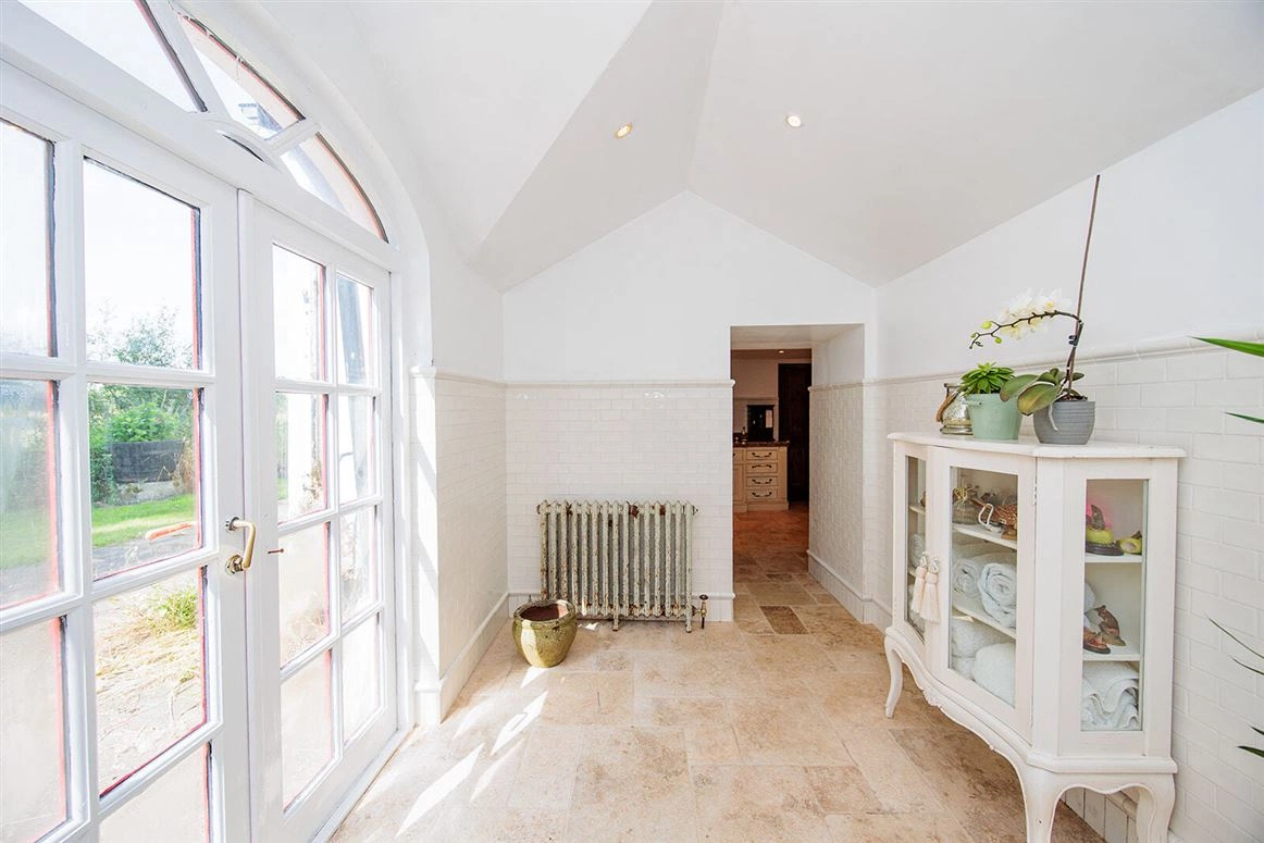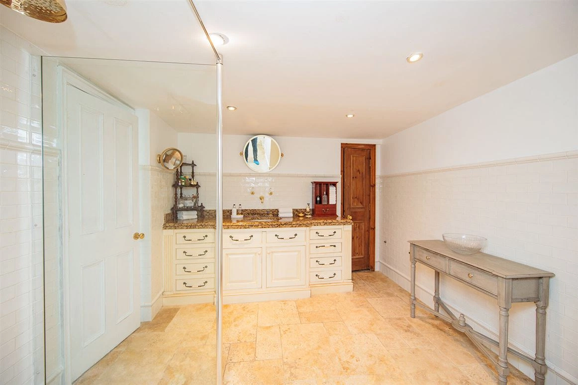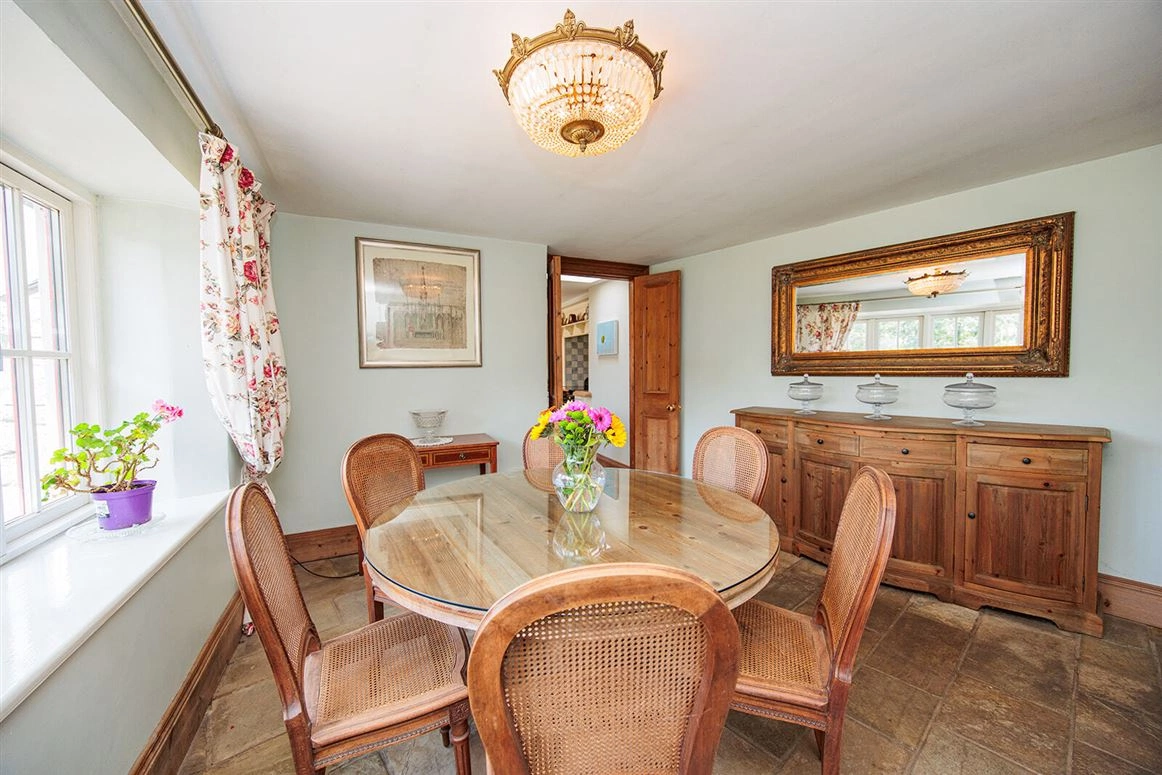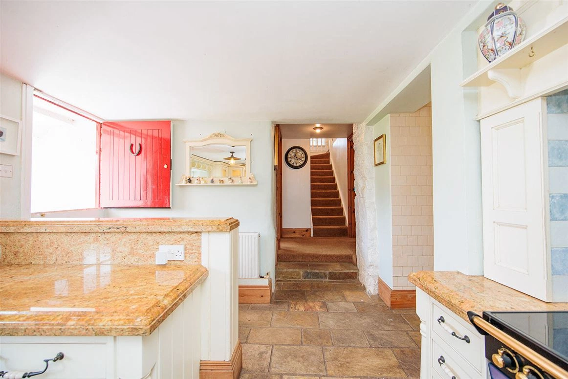 In the dining room, there is a large south-facing feature picture window to the front of the property. Further inside is the kitchen. Handmade ivory coloured units provide storage, complemented by a granite worktop and undermount kitchen sink. A feature wooden half door leads out to the front of the property while there is open plan access to the utility.