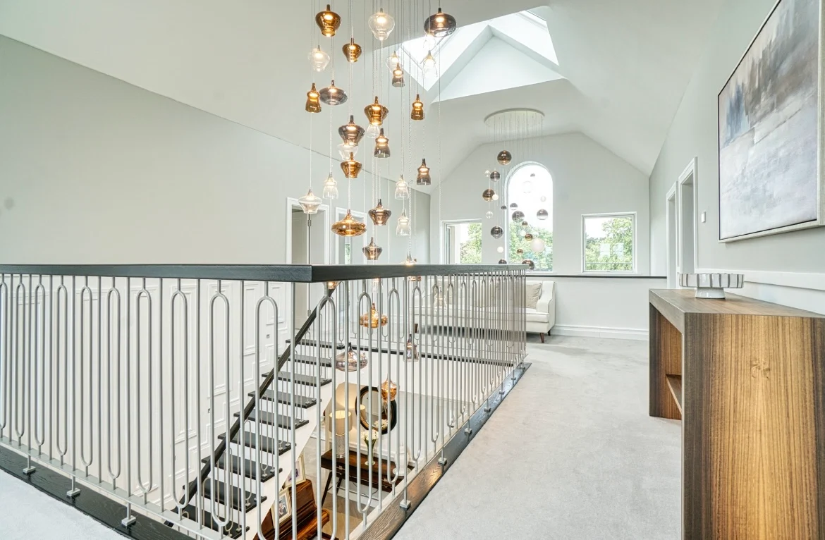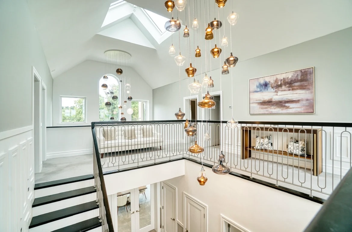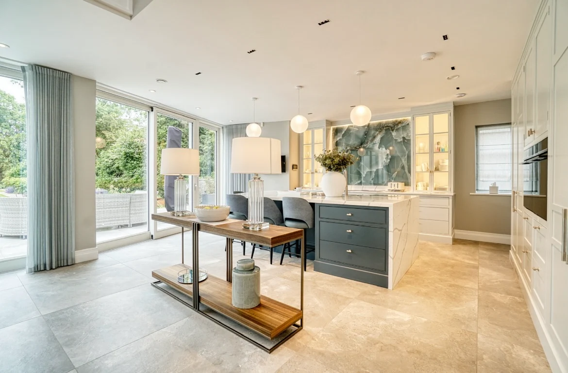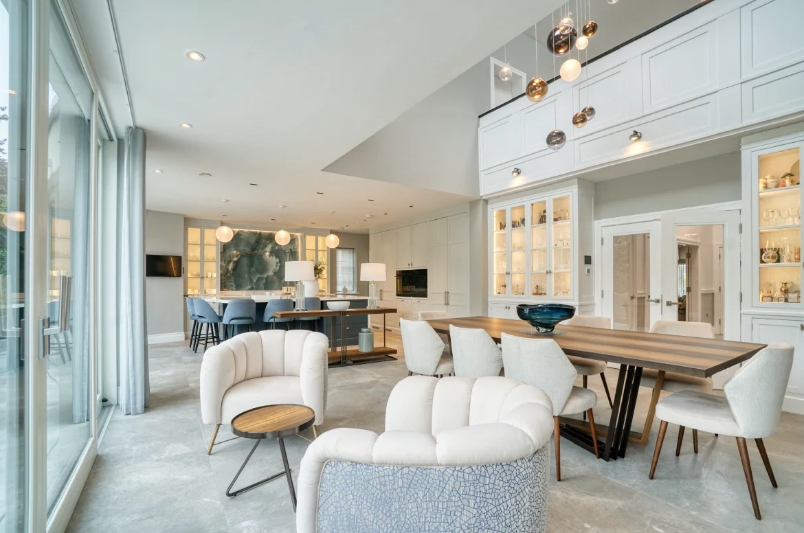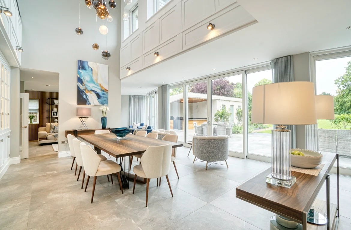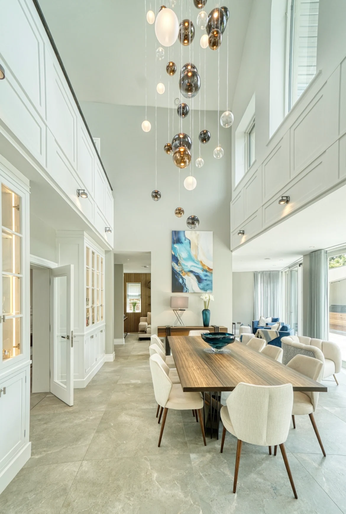 The kitchen continues this sense of light and flow thanks to a classic Calacatta Marble on the worktops, and a dramatic double height space above the custom dining table and chairs, accentuated by Italian Lodes chandeliers, sourced from Linealight.ie.