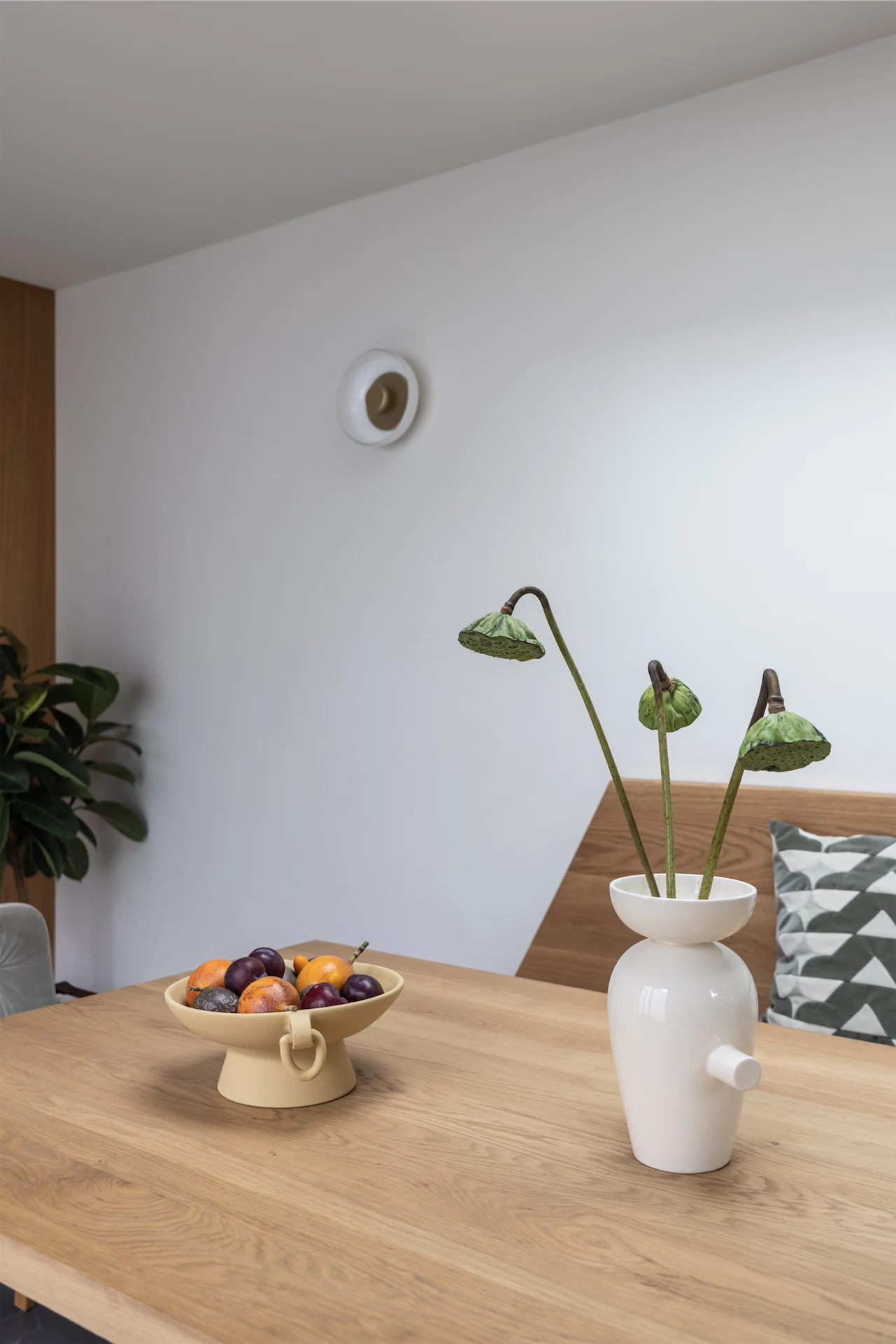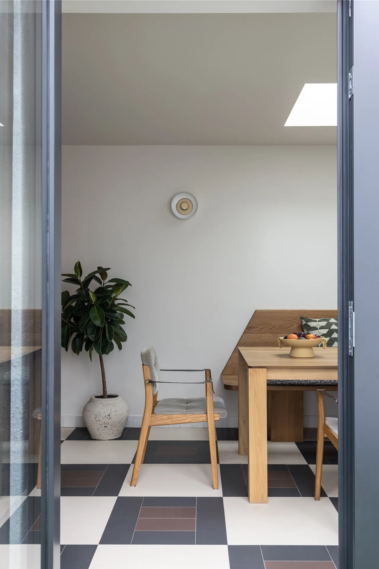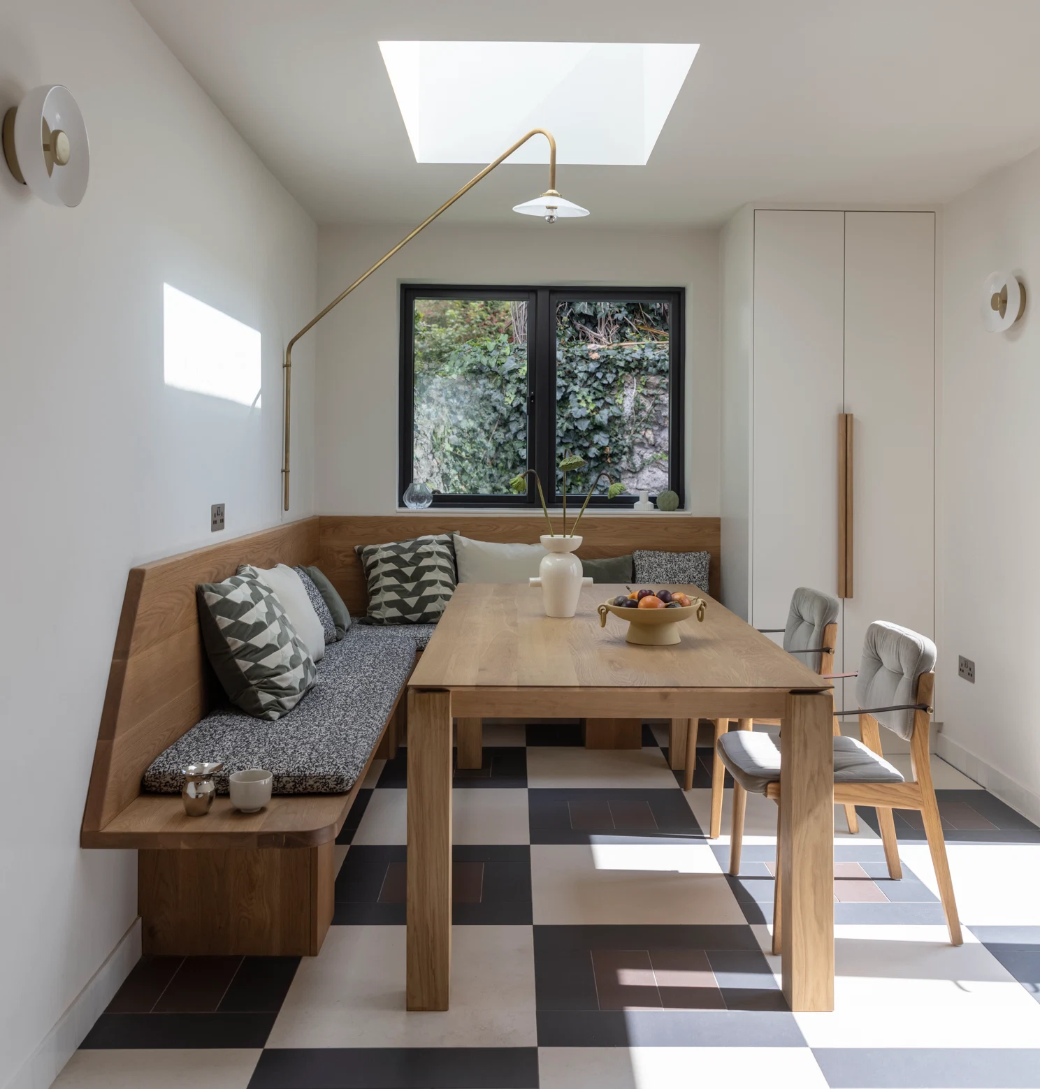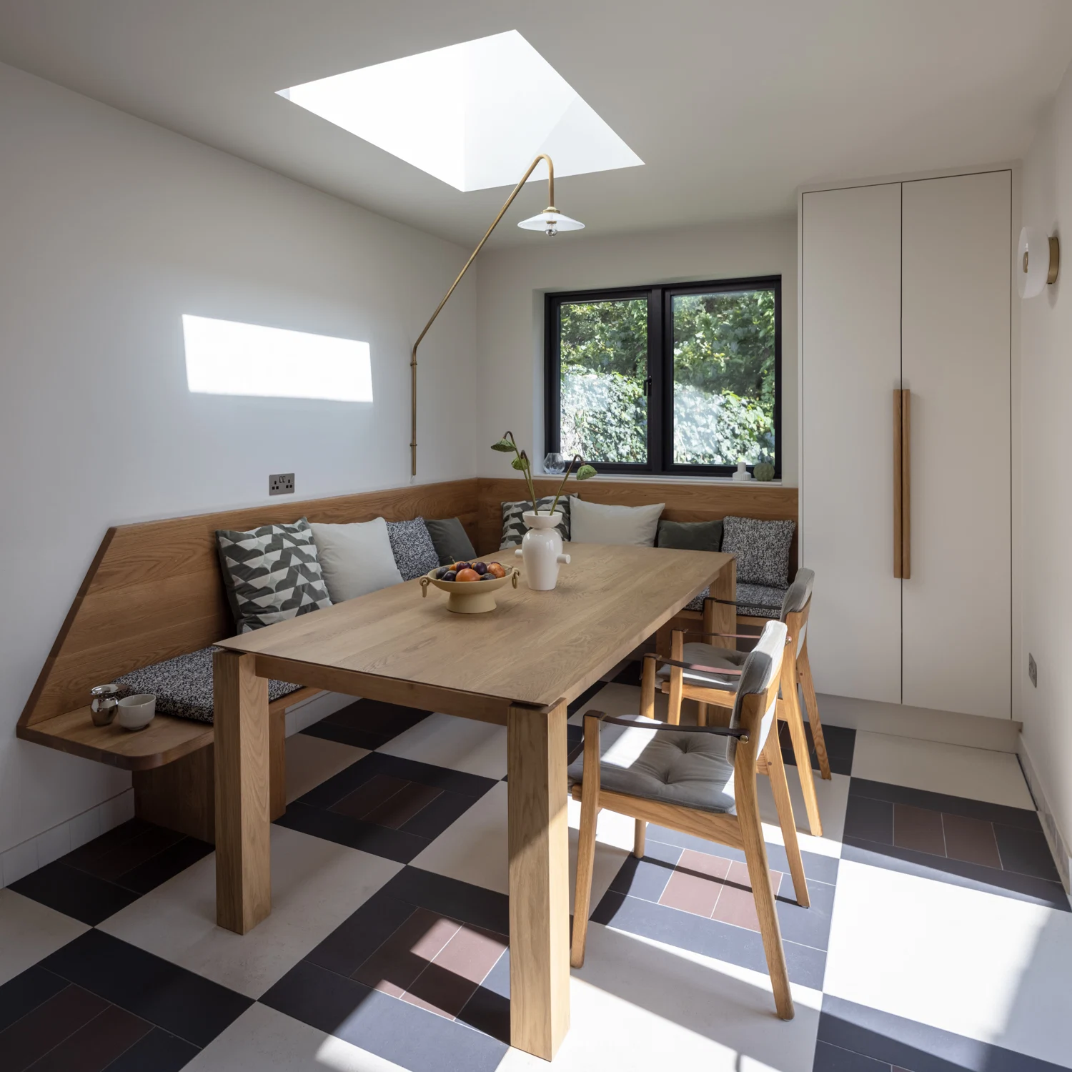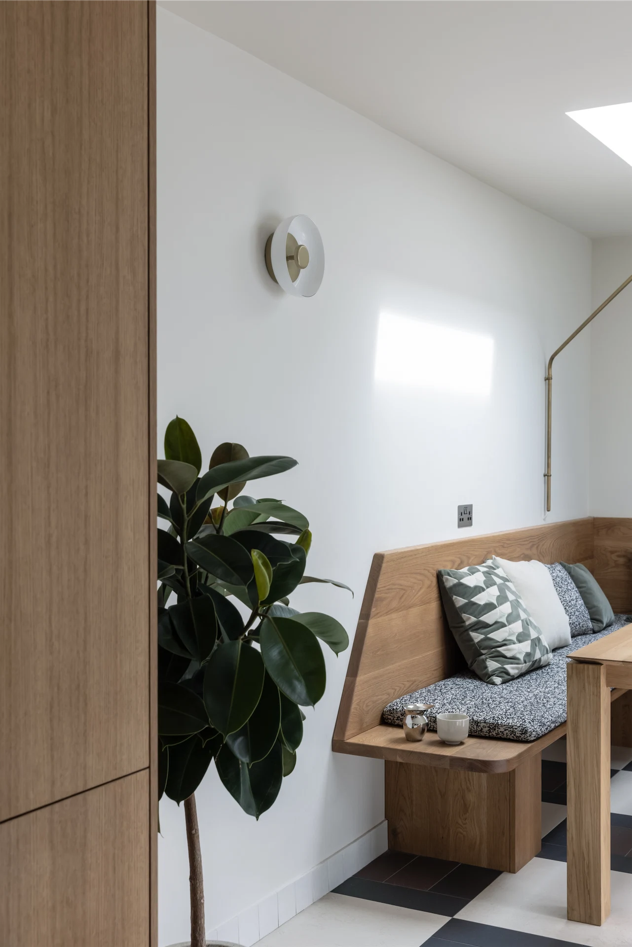Details such as the pattern in the floor tiles, the bespoke seating bench with unexpected angles, and contemporary light fittings all help this space to feel out of the ordinary, and show the consideration that has gone into the design.