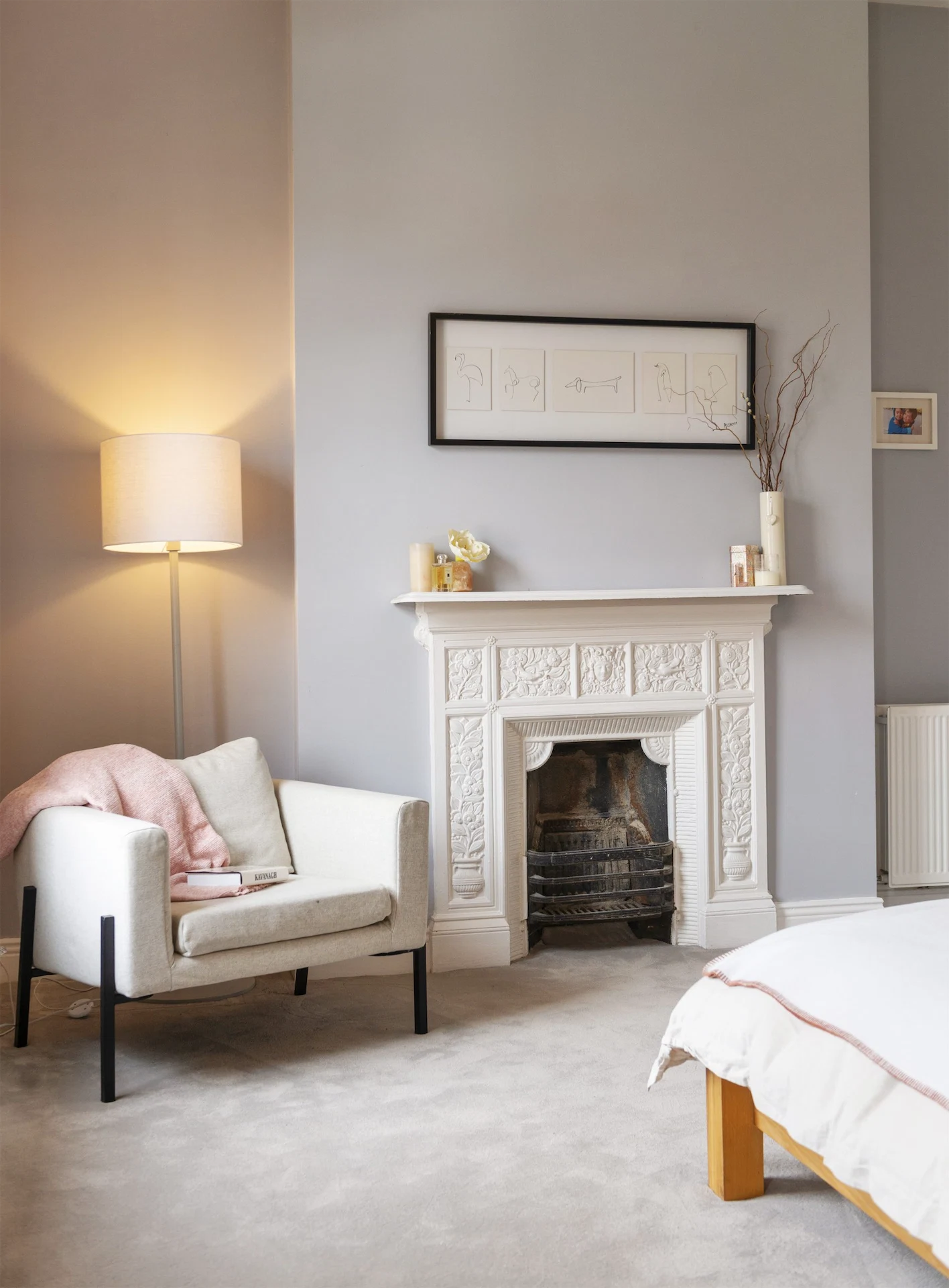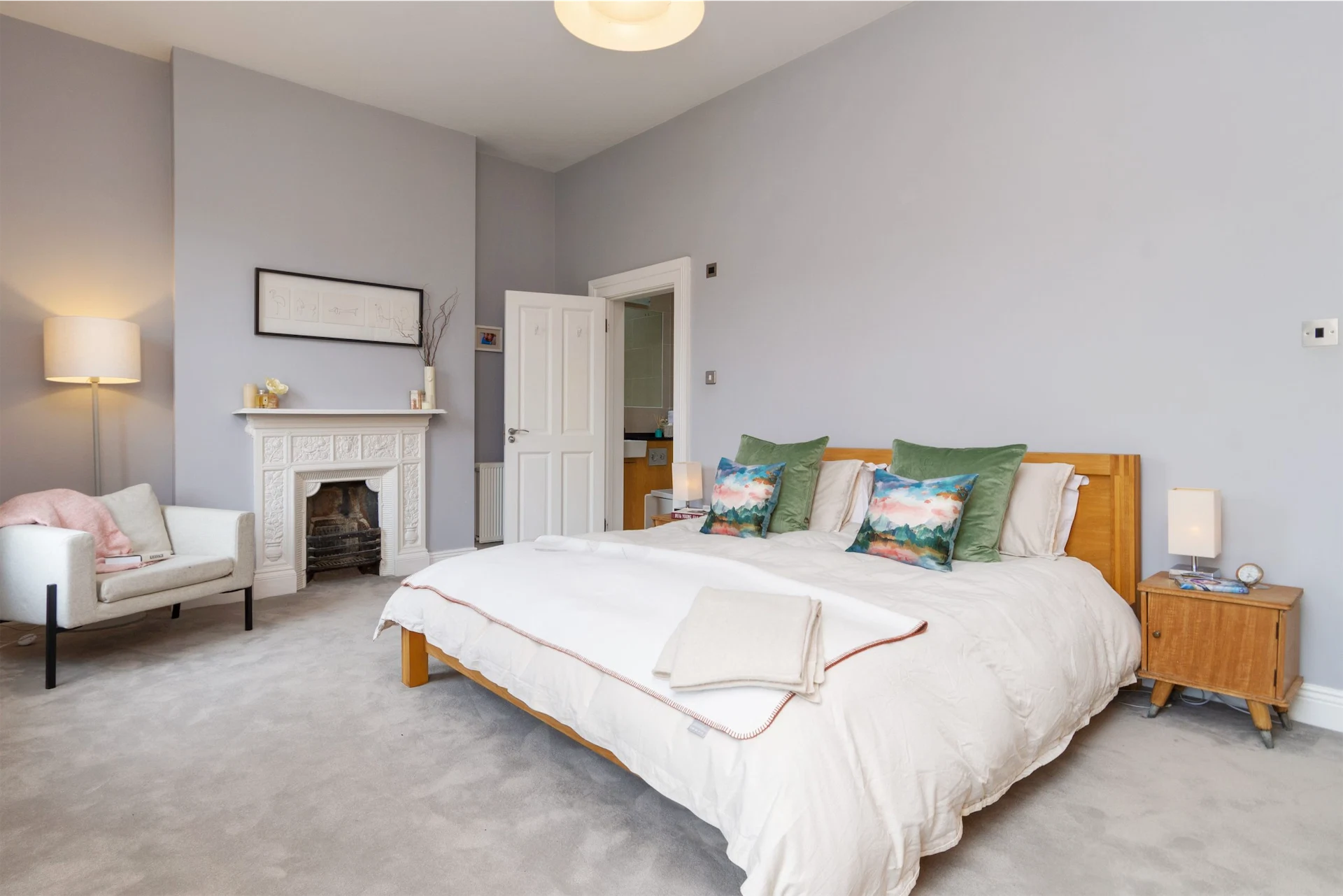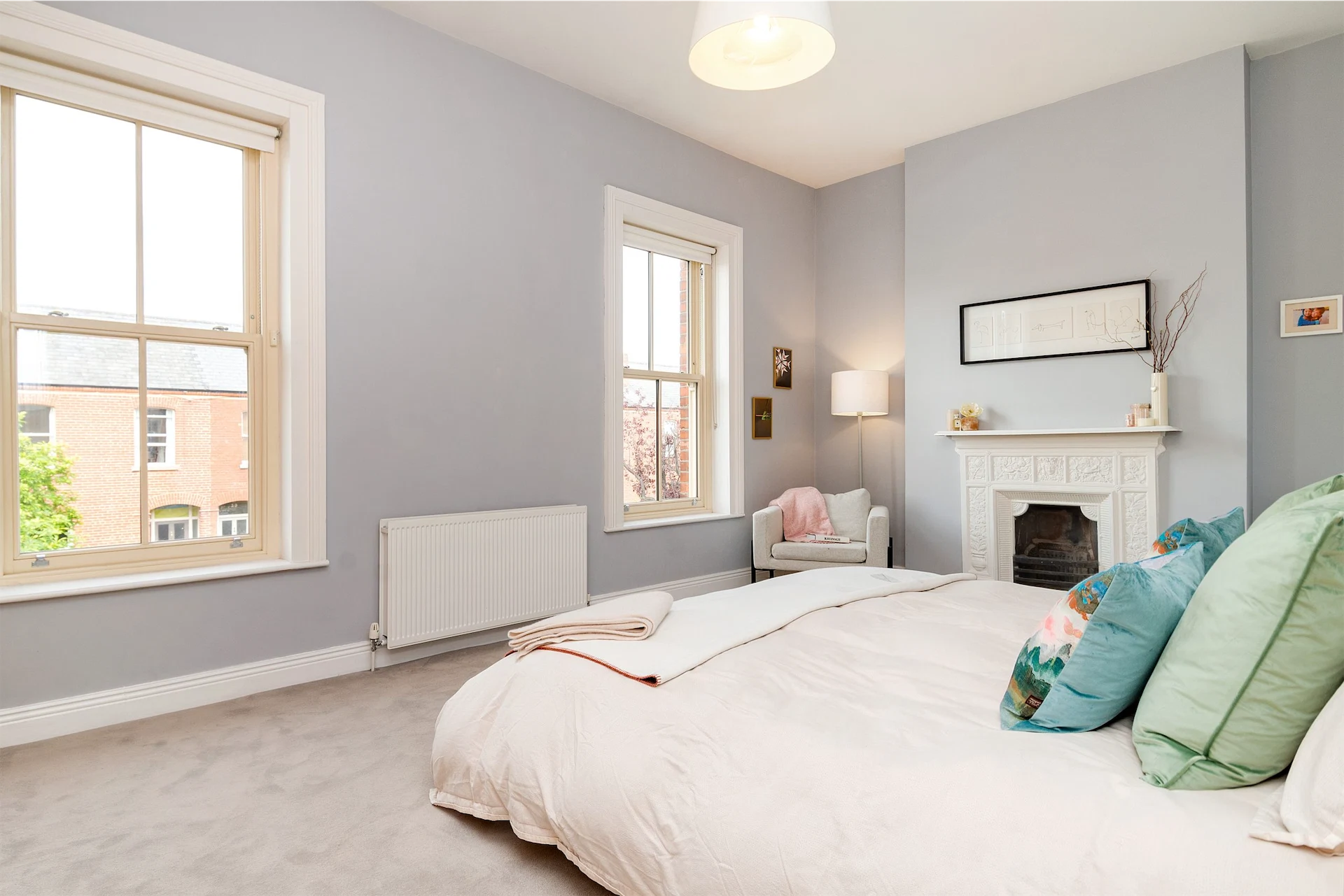 Upstairs, the main bedroom is the full width of the house, with two sash windows. It has bespoke oak built-in storage and an ornate cast iron fireplace. The second bedroom also has a sash window and cast iron fireplace, while the third has an oak built-in wardrobe.