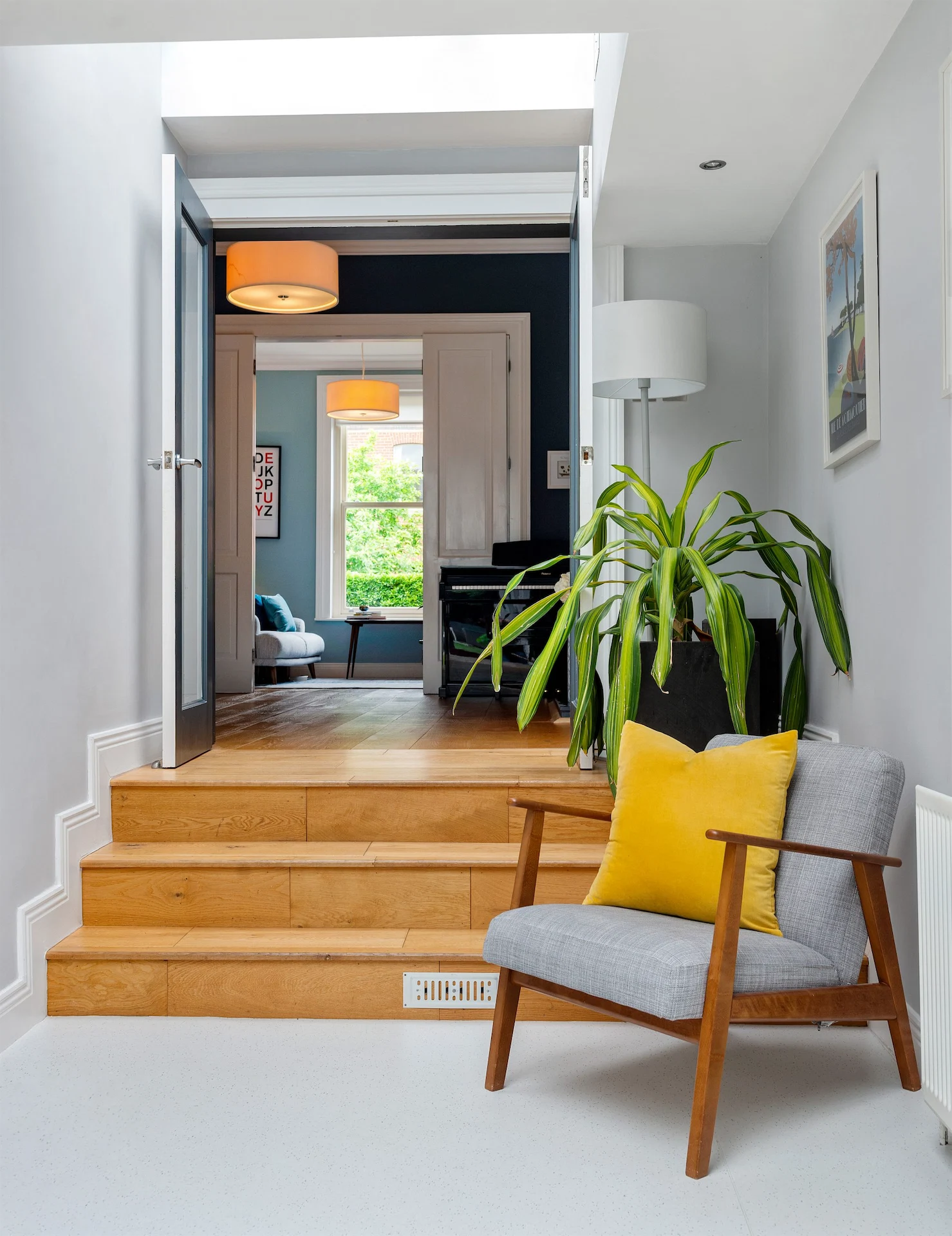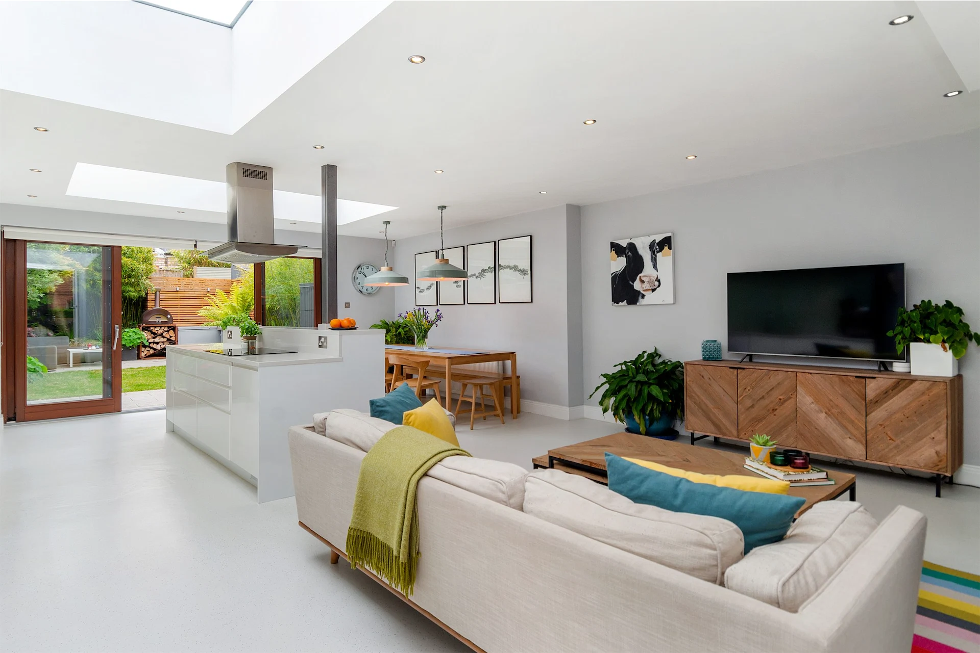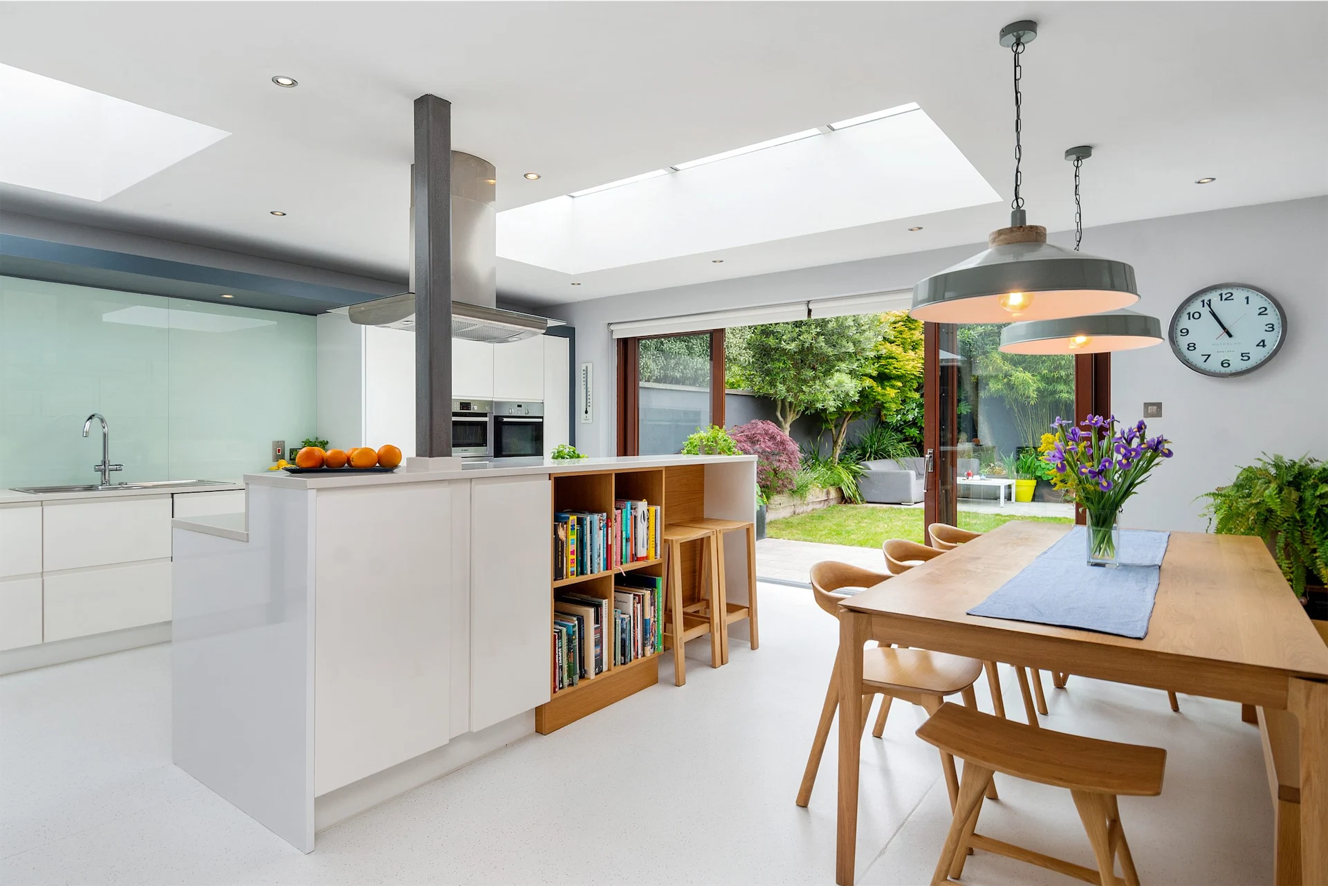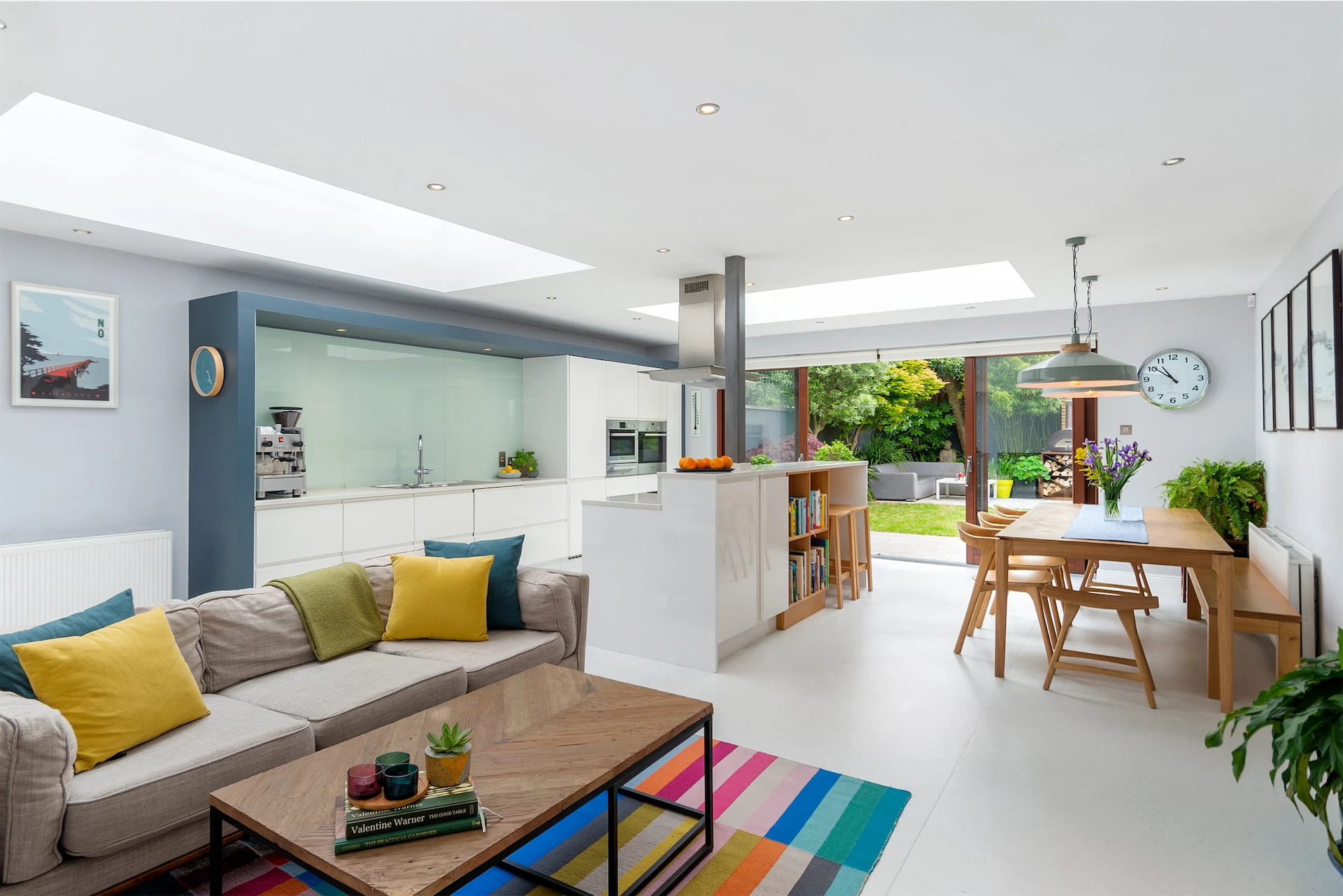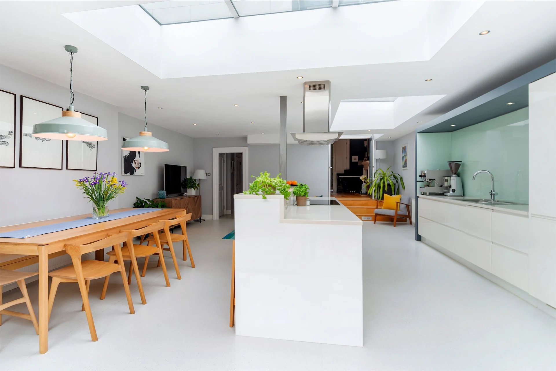 Steps down from this space lead into the open plan kitchen, living and dining space at the rear of the house. Sitting within an extension, skylights and sliding doors to the garden ensure it is a bright space, while glossy white units help it to feel clean.