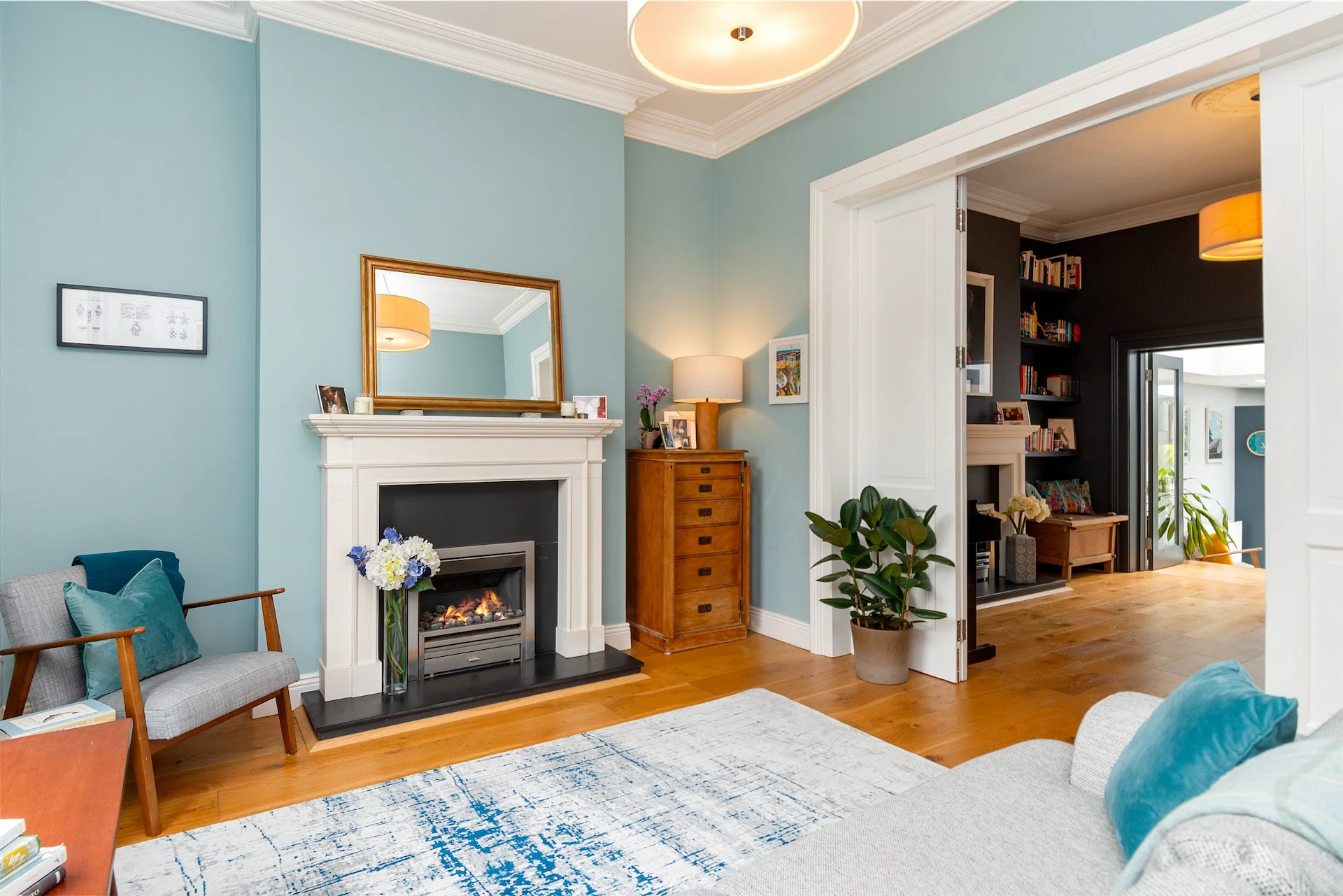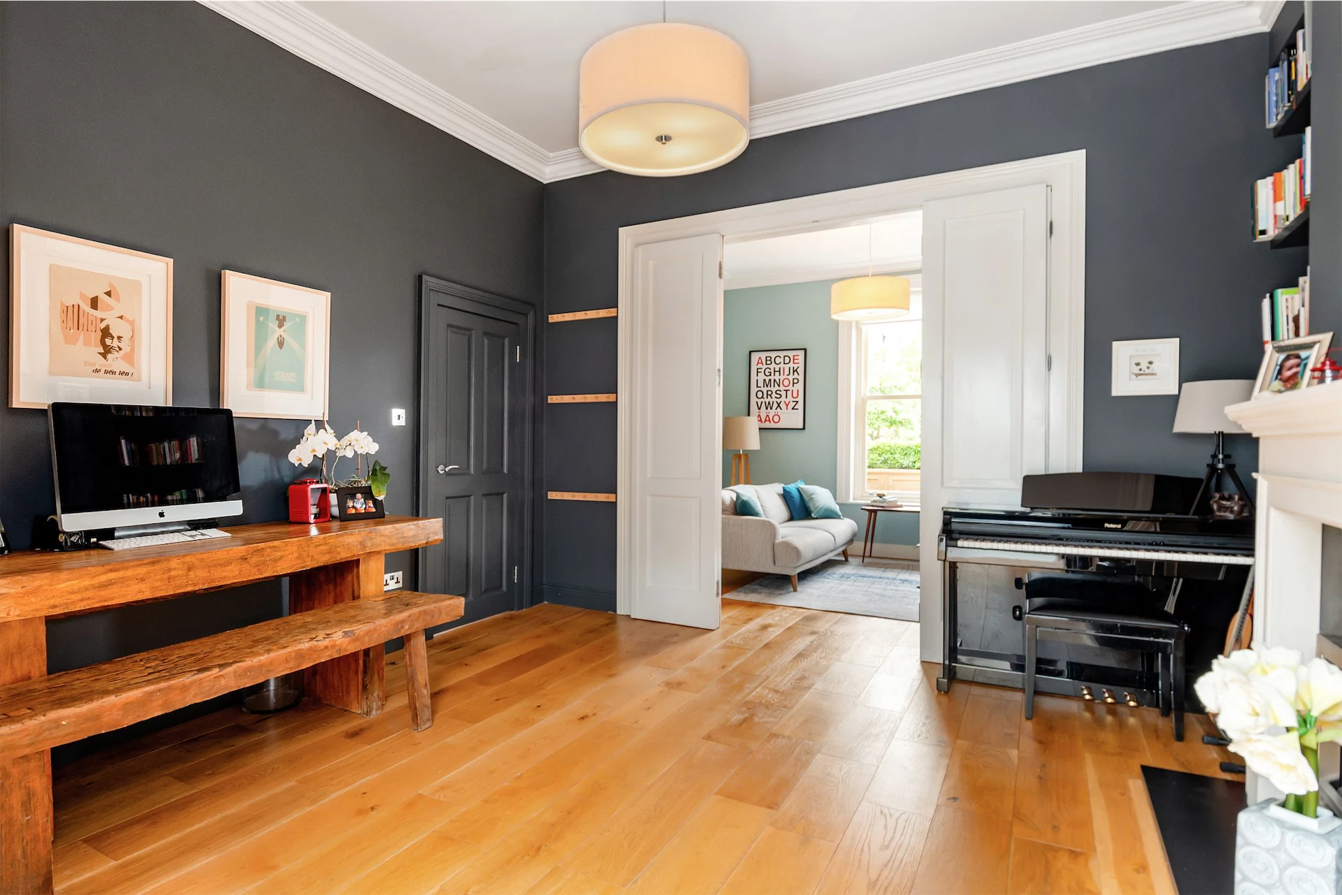 You enter the home into a hallway with wooden floors and a decorative archway. A living room sits to the front of the house with a sash window, and a natural stone fireplace with gas insert and slate surround. Folding doors lead into a second reception room, which the current owners use as a study and music room, painted in a moody shade.