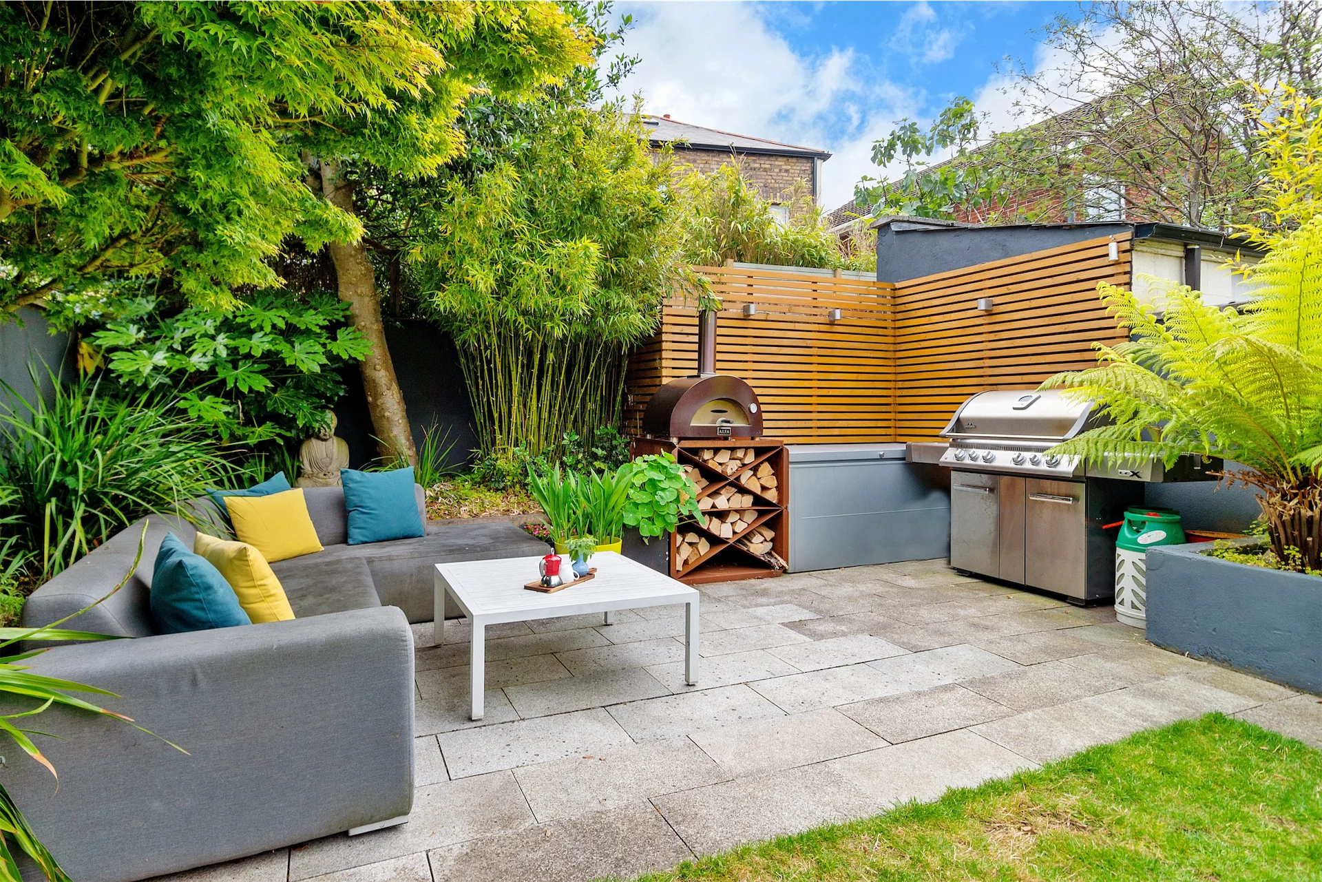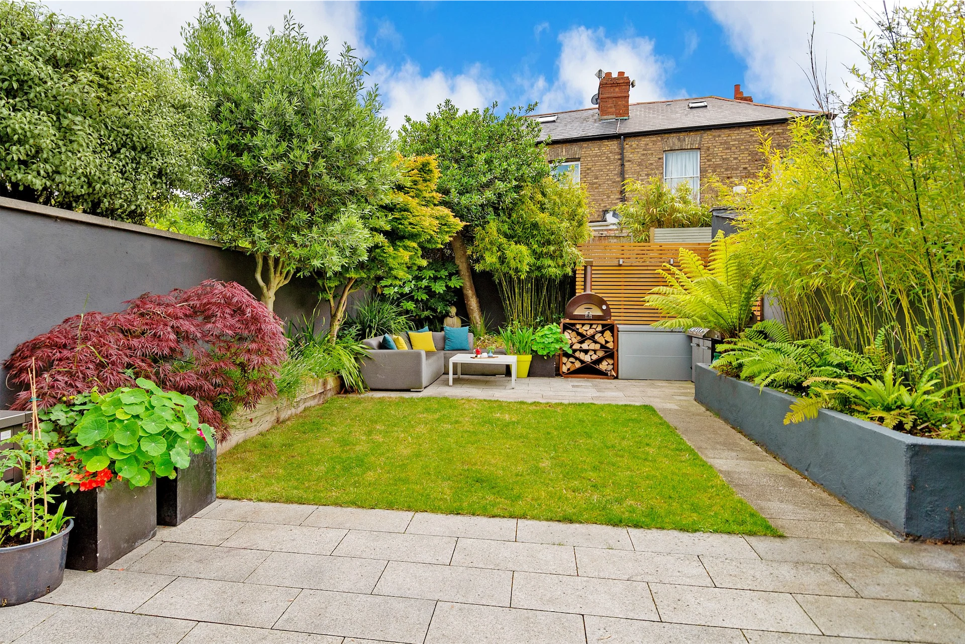 Outside, the back garden has two patio areas, as well as planted beds at the sides. The front has bespoke storage for bikes and bins.