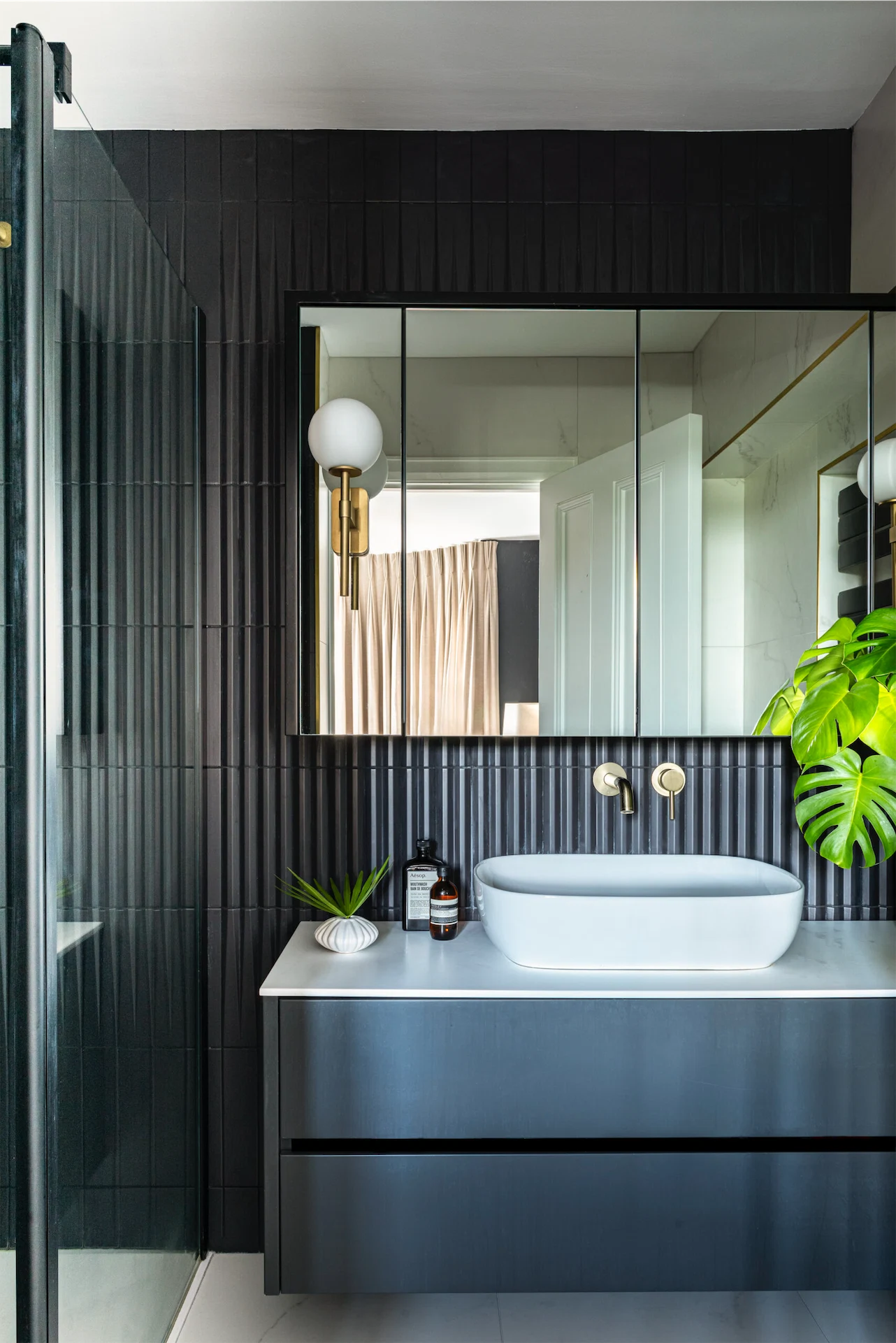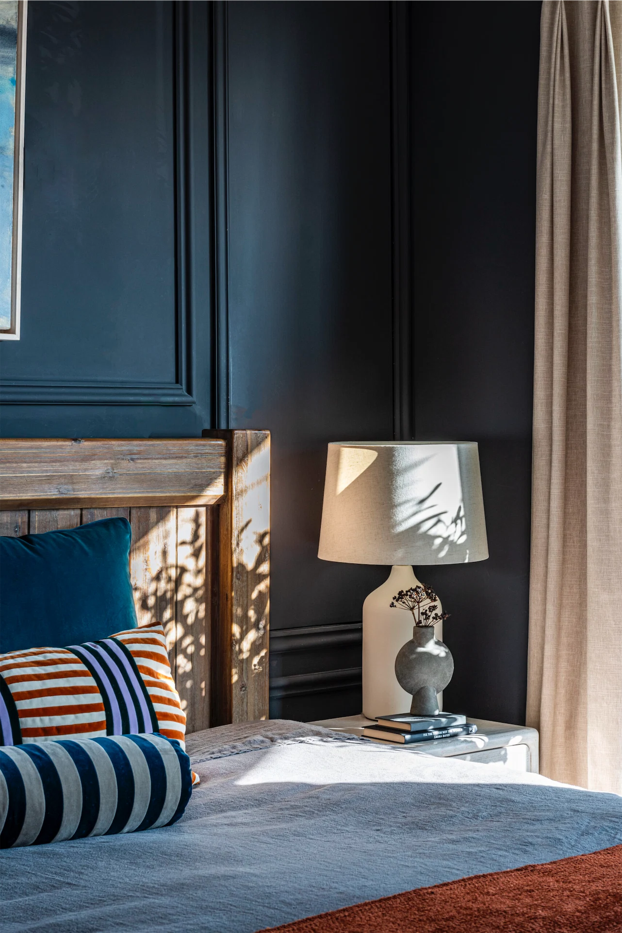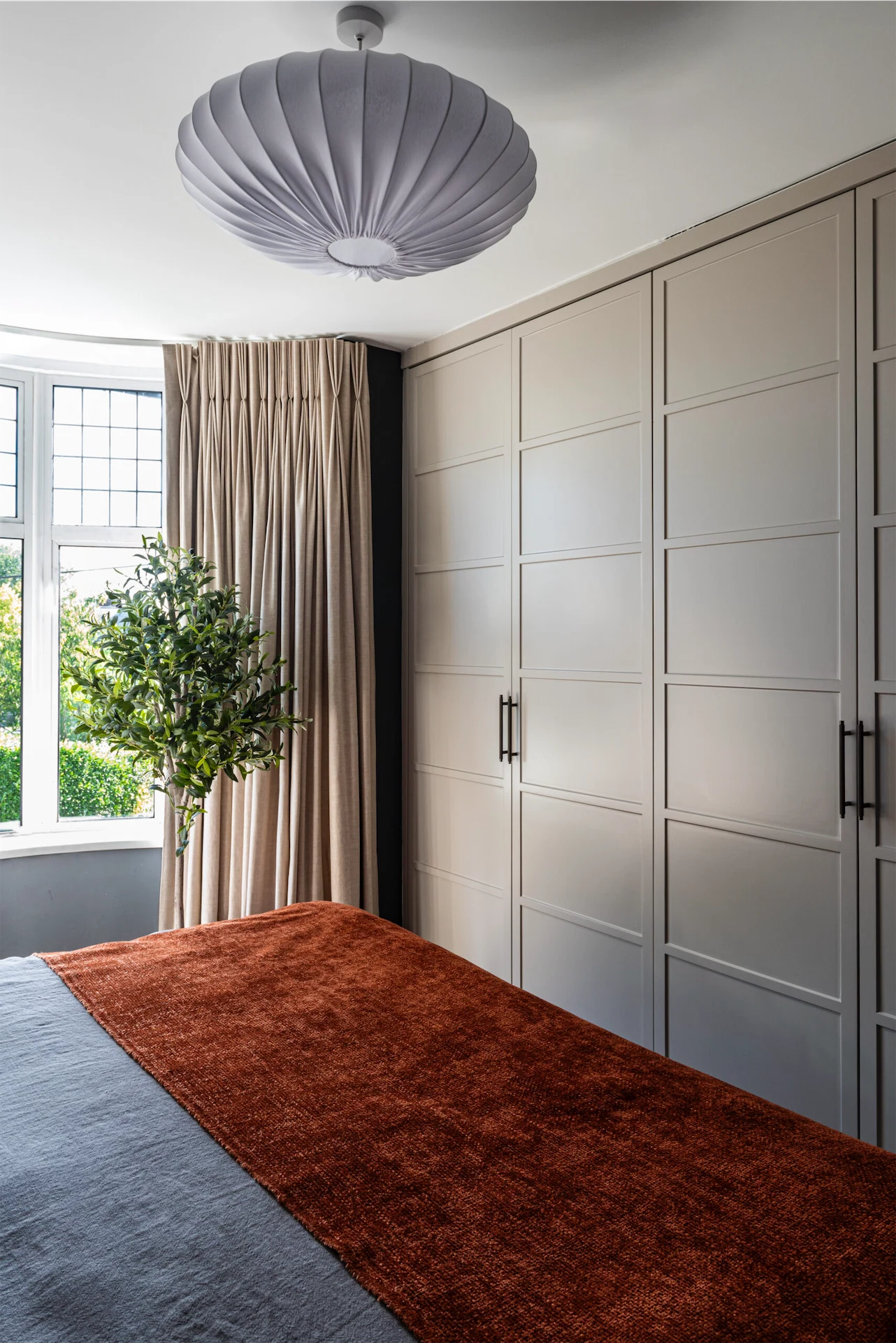 More clever design solutions are found in the main bedroom, where panelling behind the bed conceals storage – a panel to the right of the bed pushes open. Cooling Design also designed the wardrobes, and the room is painted in Perse Grey by Paint and Paper Library. In the ensuite a recessed shelf was added in the shower, as well as a bespoke mirrored cabinet.