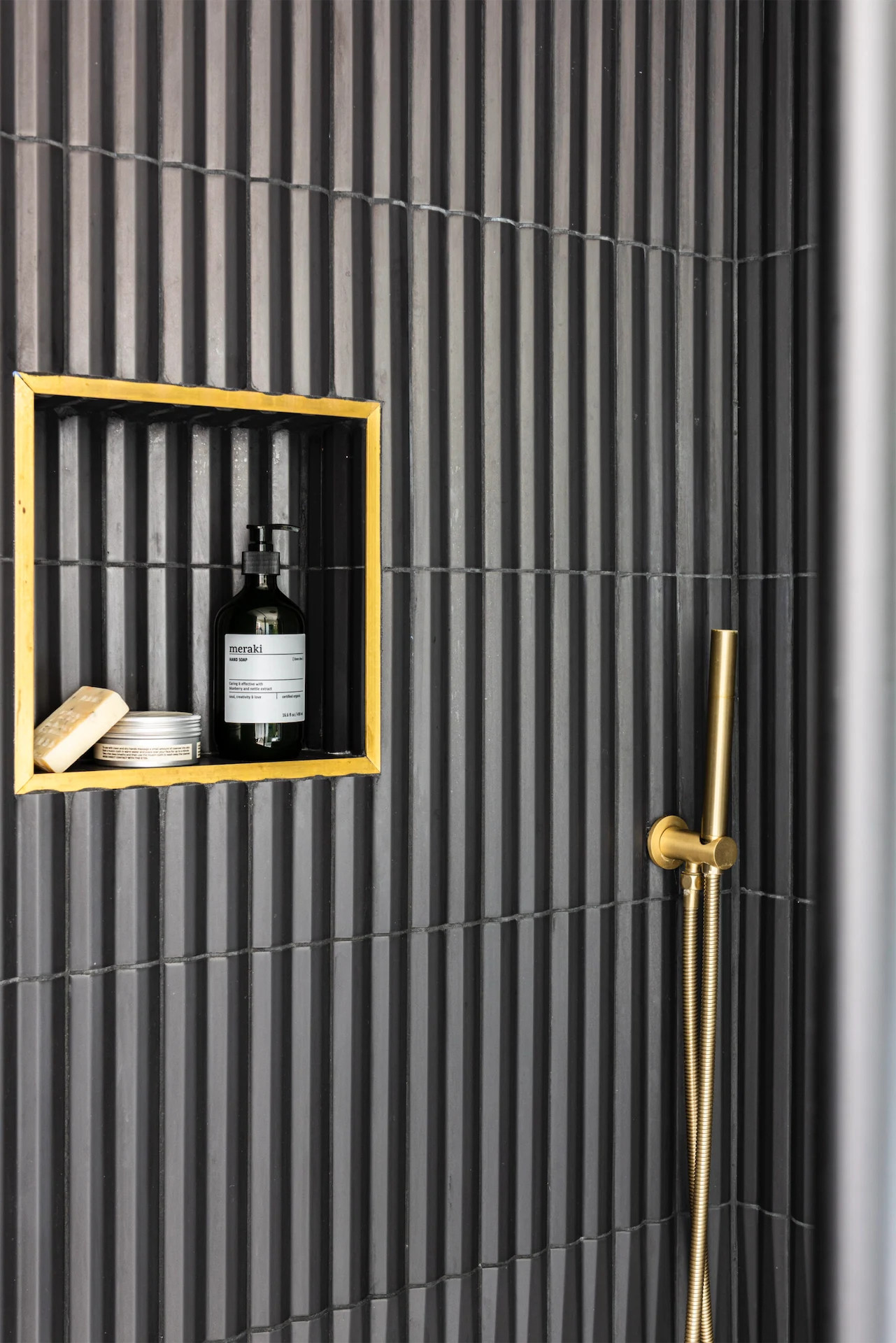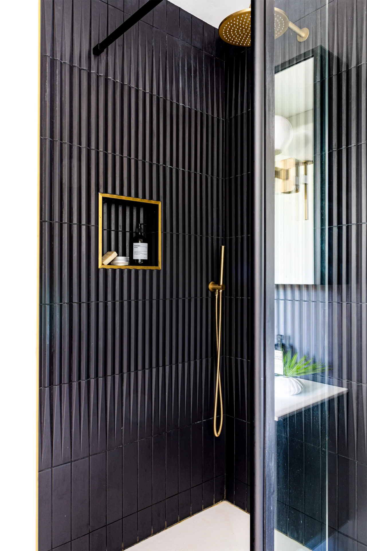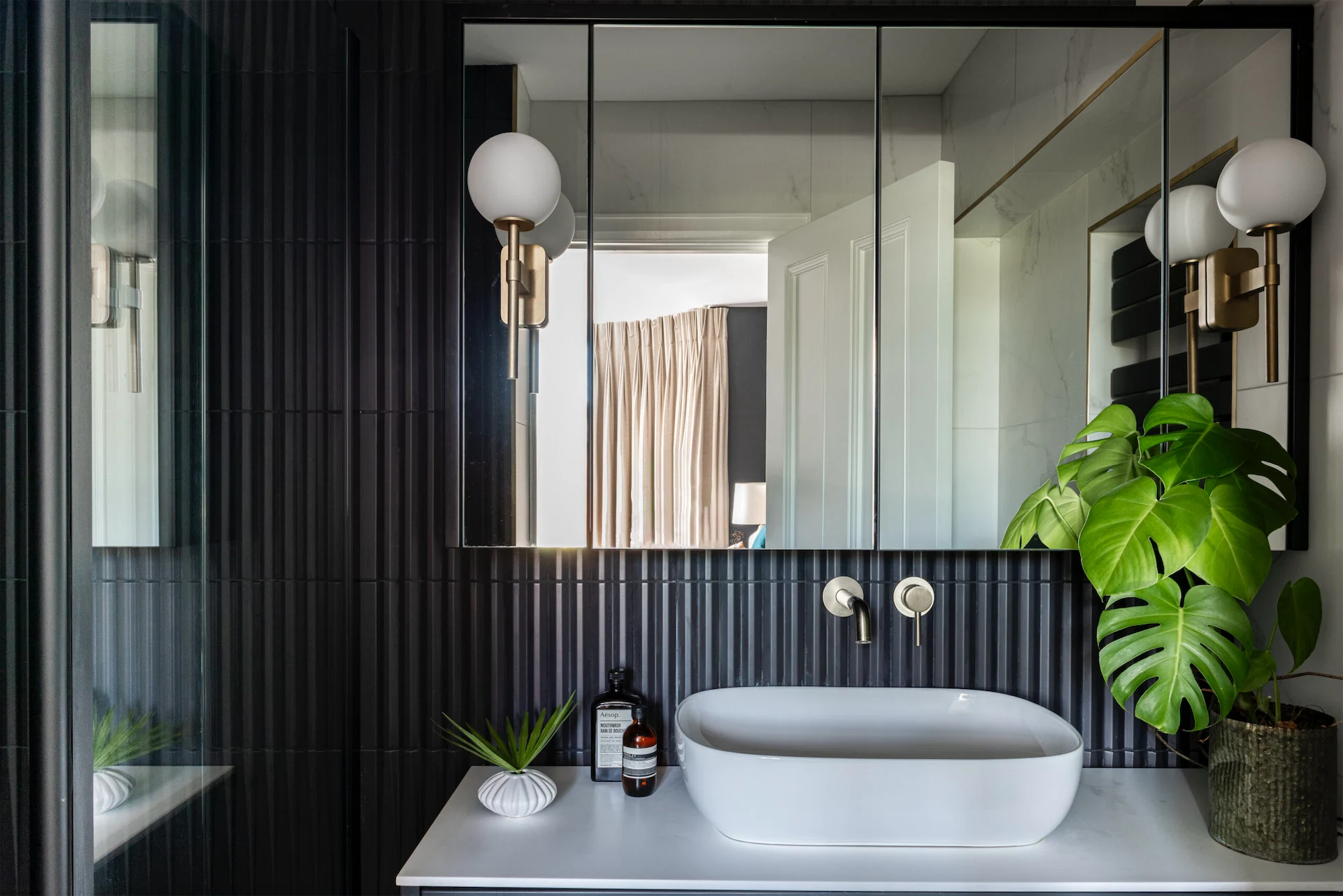 More clever design solutions are found in the main bedroom, where panelling behind the bed conceals storage – a panel to the right of the bed pushes open. Cooling Design also designed the wardrobes, and the room is painted in Perse Grey by Paint and Paper Library. In the ensuite a recessed shelf was added in the shower, as well as a bespoke mirrored cabinet.