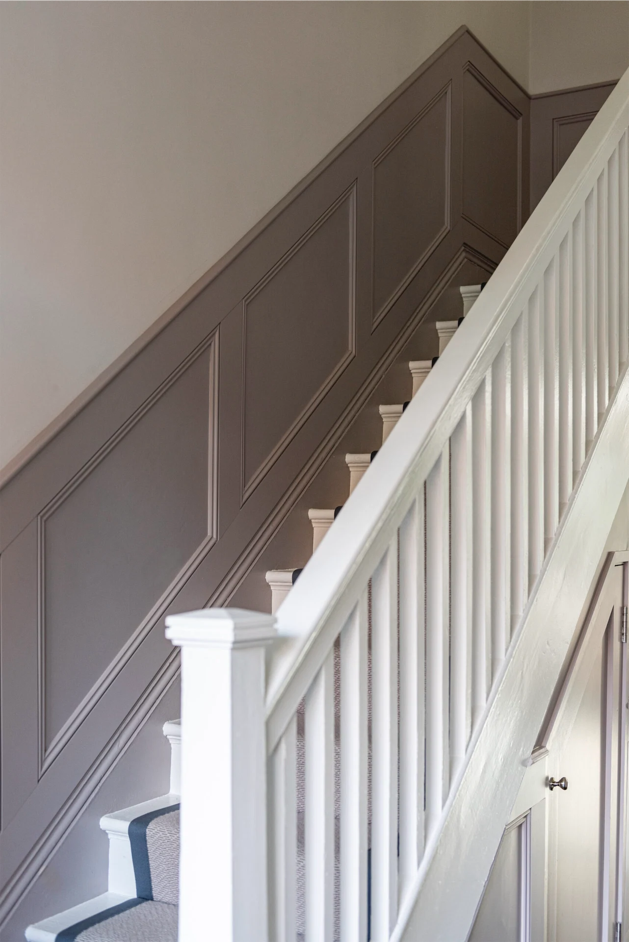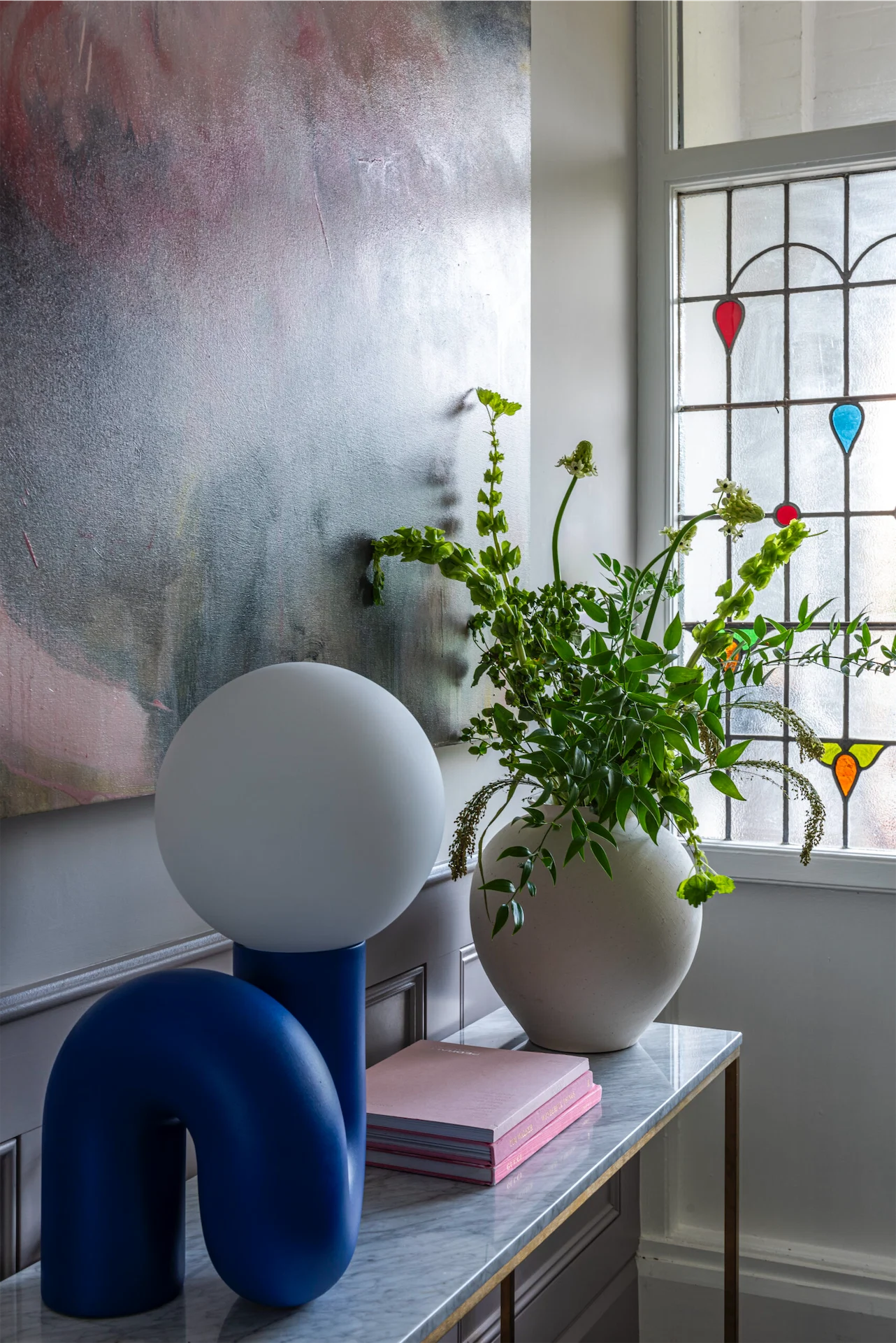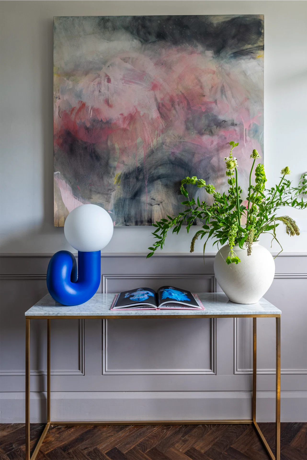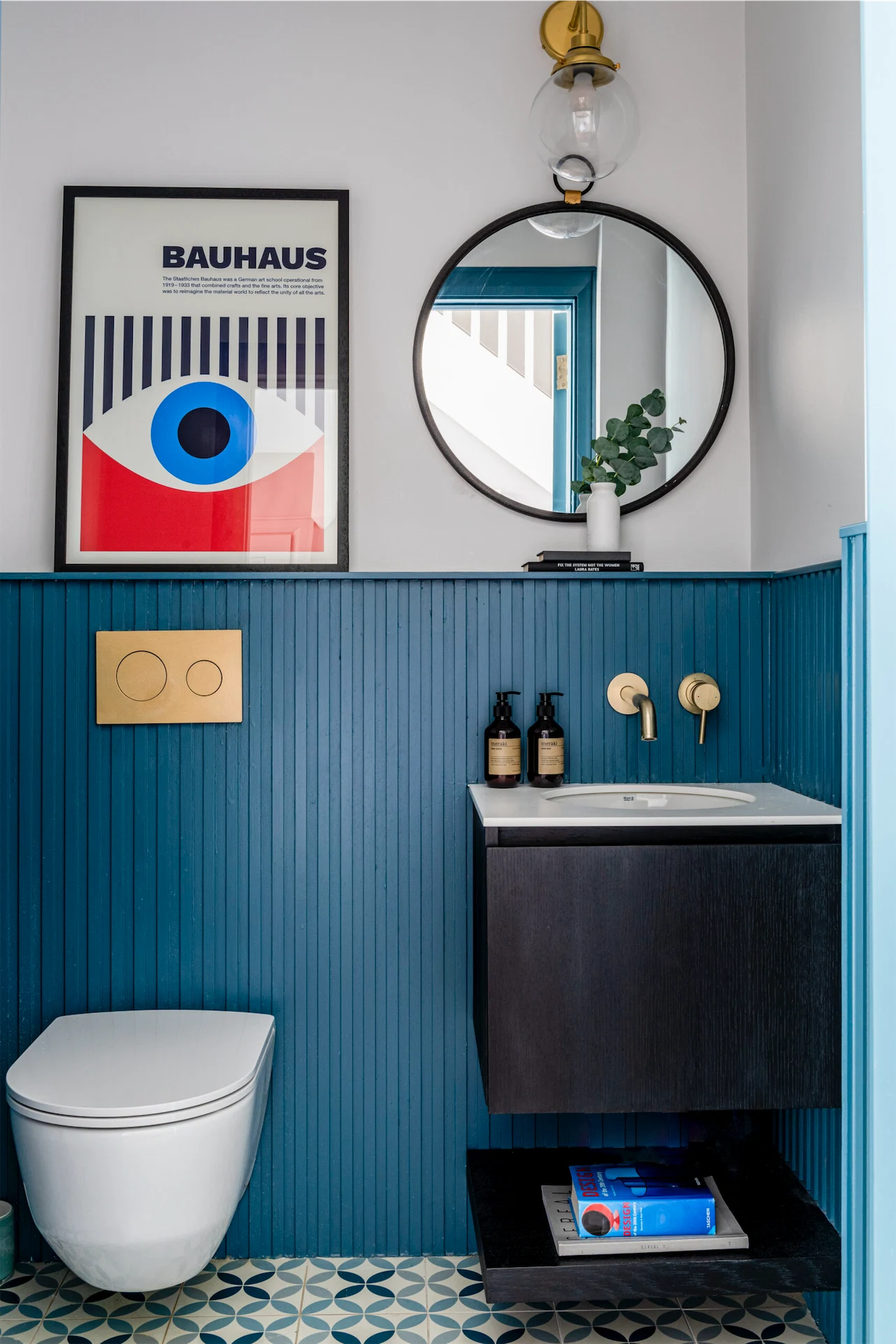 Wall panelling was added in the hallway, painted in Quail by Paint and Paper Library, and in the WC Emma designed a false wall to house a wall-hung toilet. “This was clad in bold blue fluted panelling,” Emma explains, “and the wall creates a shelf and allows the taps to be wall hung, rather than surface-mounted. This creates a clean, uncluttered look for the small space. The bright, fun floor tile adds character along with the Bauhaus print. The vanity unit was designed by Cooling Design.”