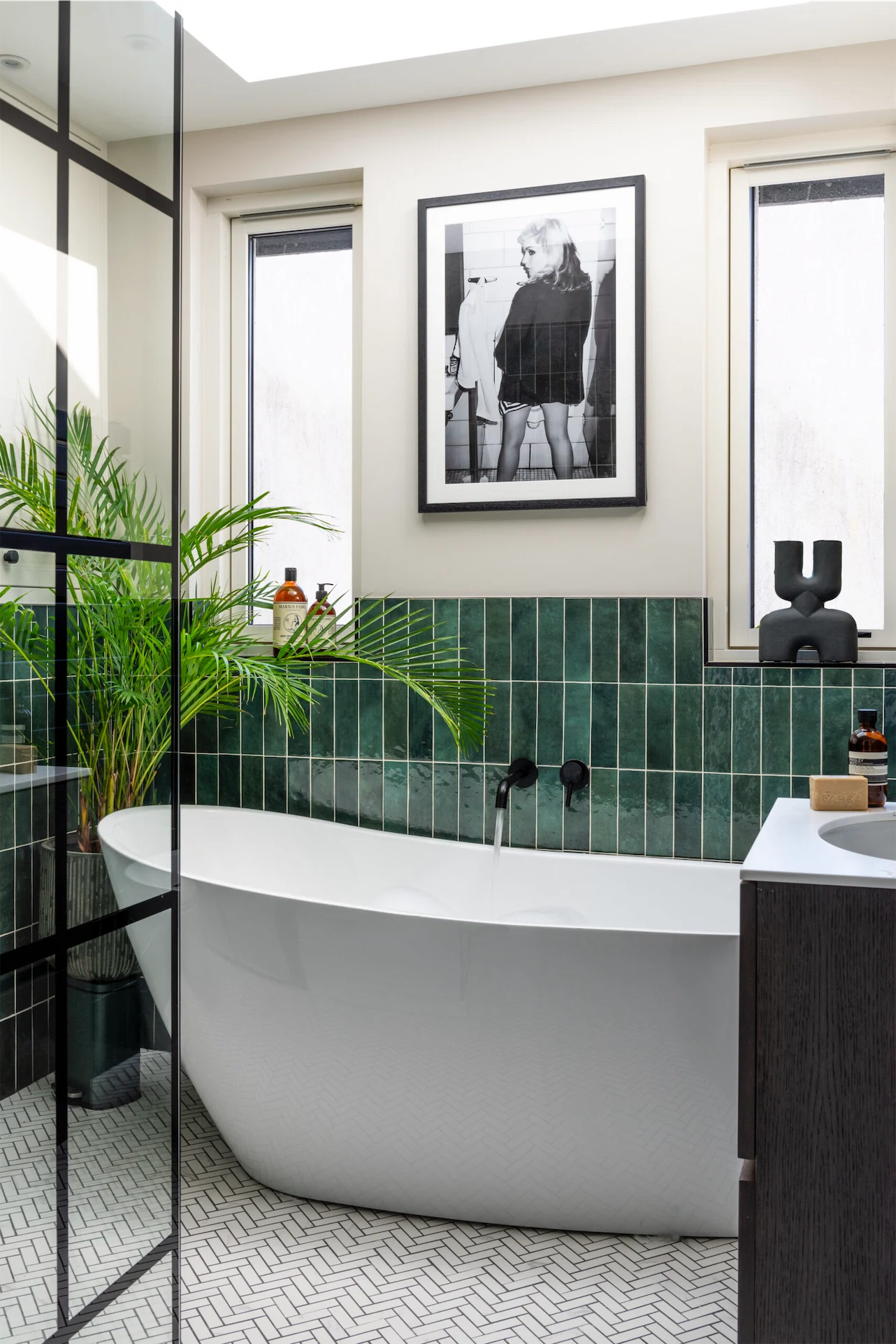 Throughout the house, Emma introduced a deep, rich colour palette. Kigali by Paint and Paper was used for the banquette seating and shelving, while the kitchen units are Harley Green by Little Greene. A dark herringbone timber floor runs through the hall, lounge and open plan space, while bold geometric tiles make a statement in the kitchen.