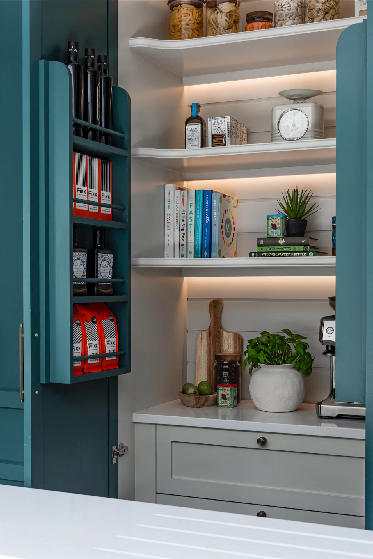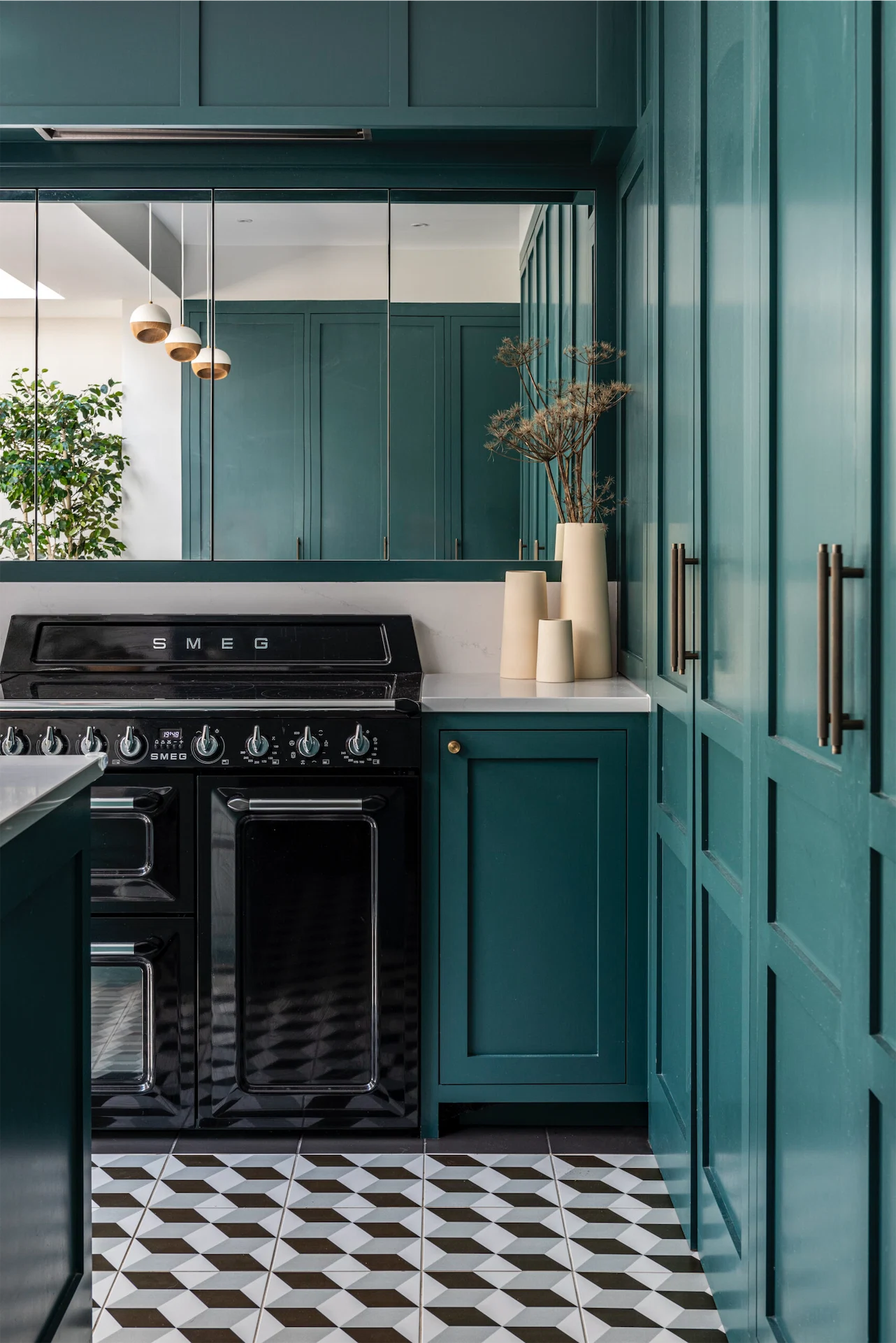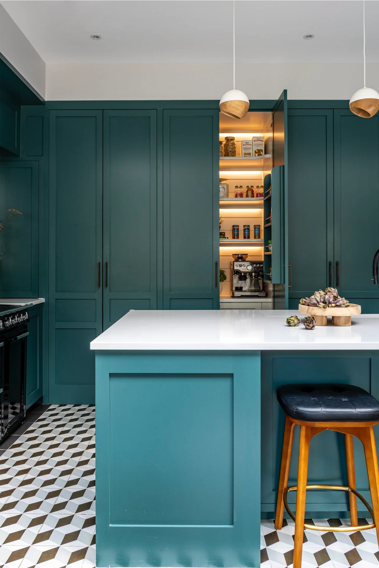 To incorporate the utility into an open-plan kitchen, Emma designed the kitchen with hidden saloon doors into a utility room, which allows for a seamless finish. The tall kitchen cabinetry also includes a pantry and an integrated fridge/freezer.