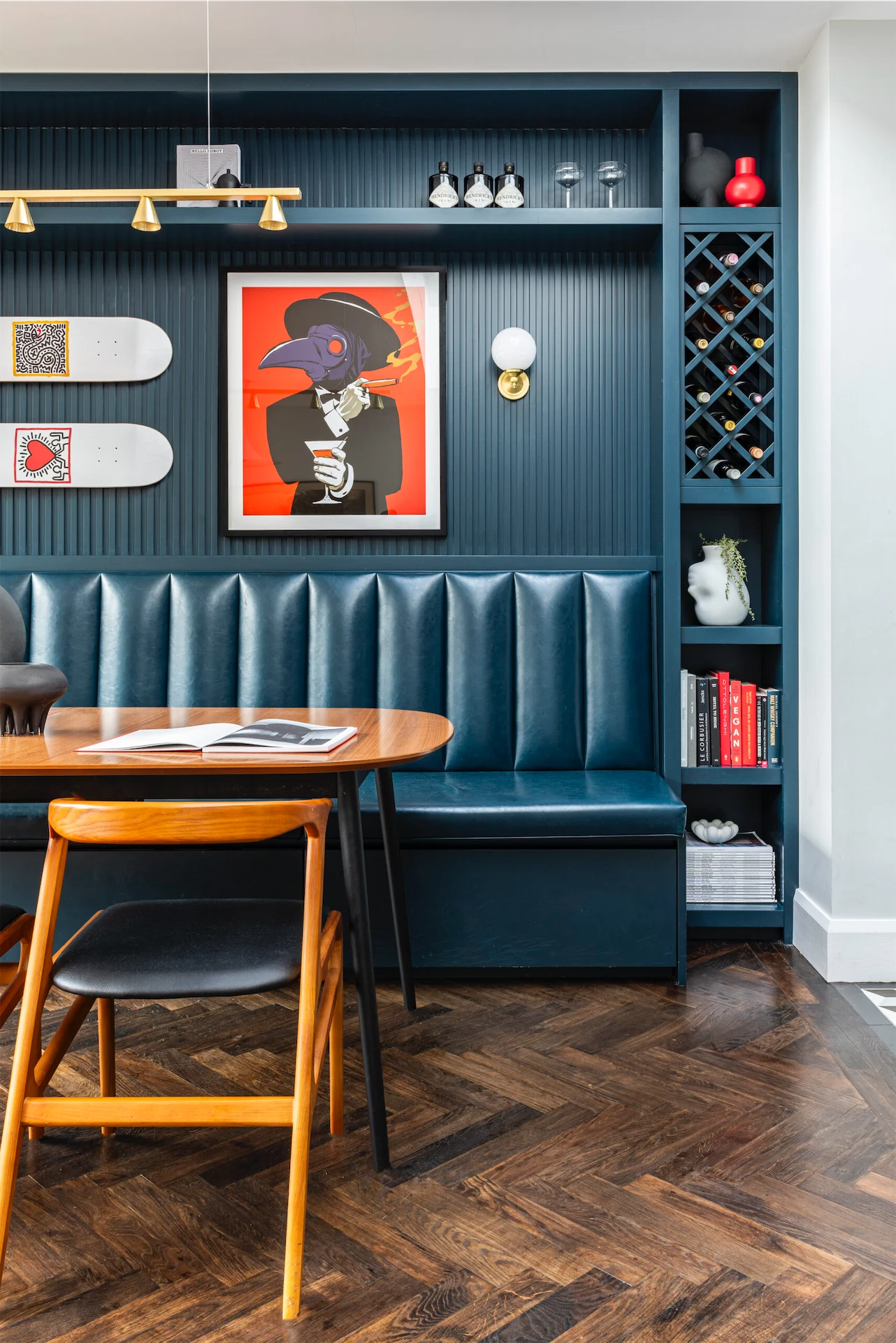 “Storage was of huge importance in the design of this home. With that in mind, I designed a banquette seating and shelving unit for the dining area. They are a fantastic way of combining storage and seating. This included drawers under the seat, and shelves with a wine rack. We used a fun framed print of the client as a focal point with some nice wall lights on either side.”