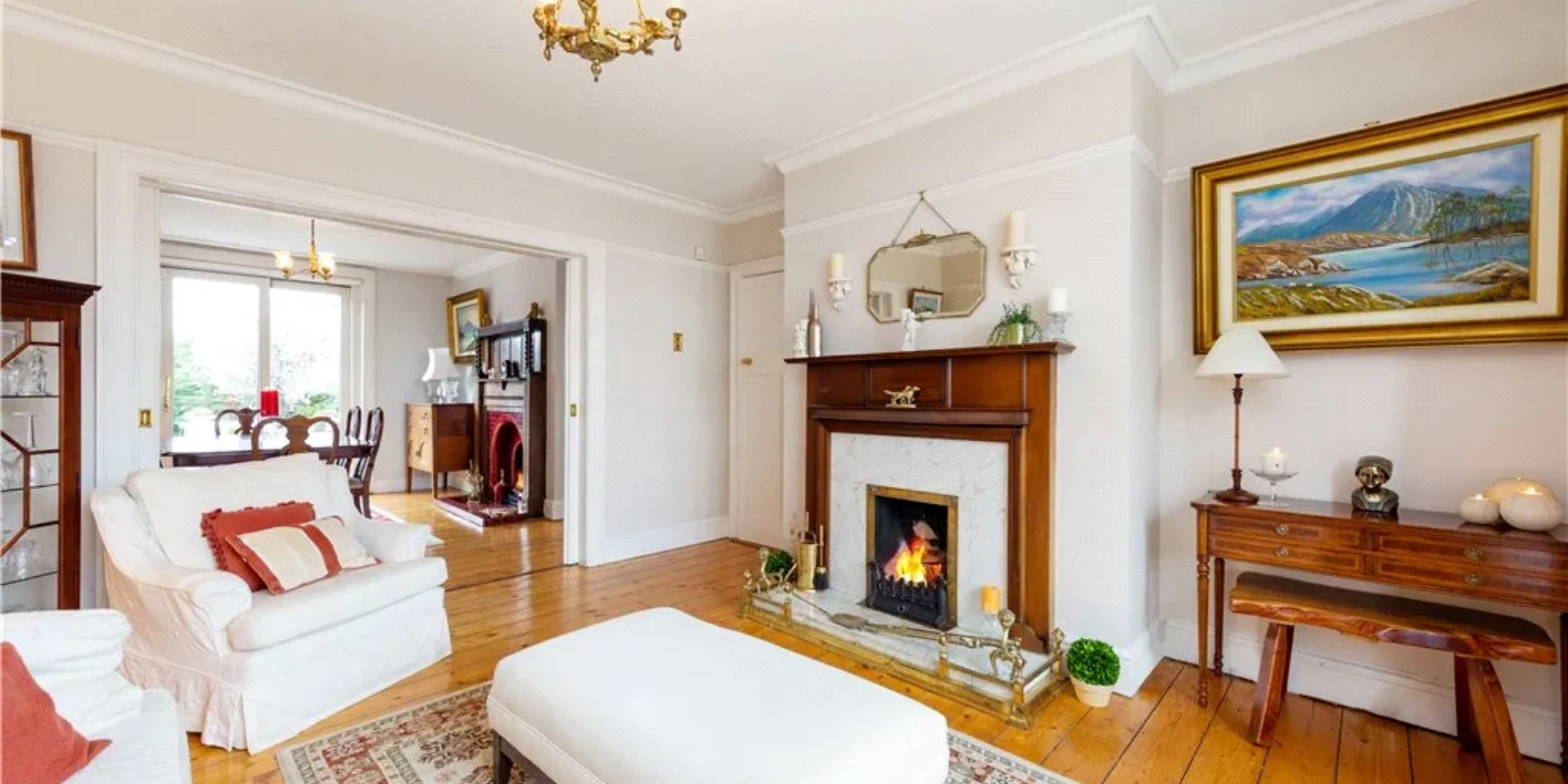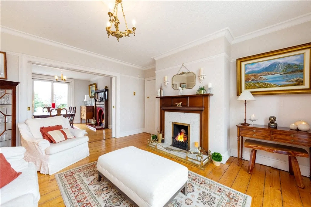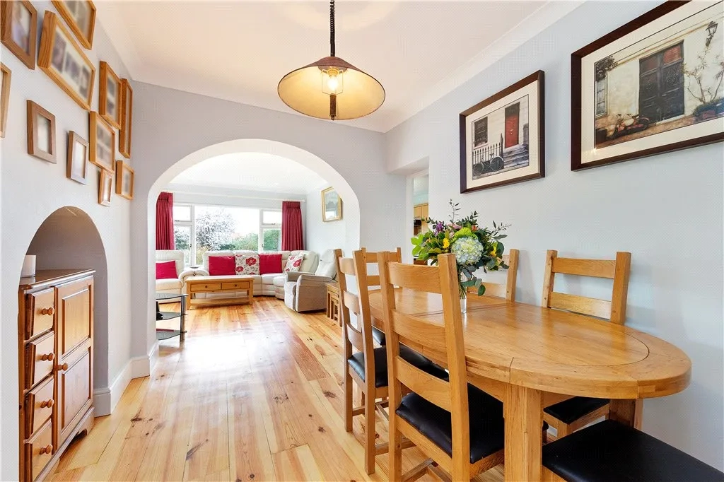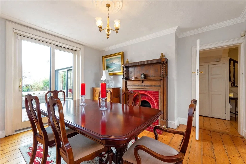 Further inside the home is the dining room, which also has its own attractive fireplace. Period features include ceiling coving and a centre rose. A sliding patio door connects this room out to the rear garden.