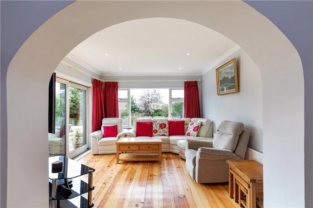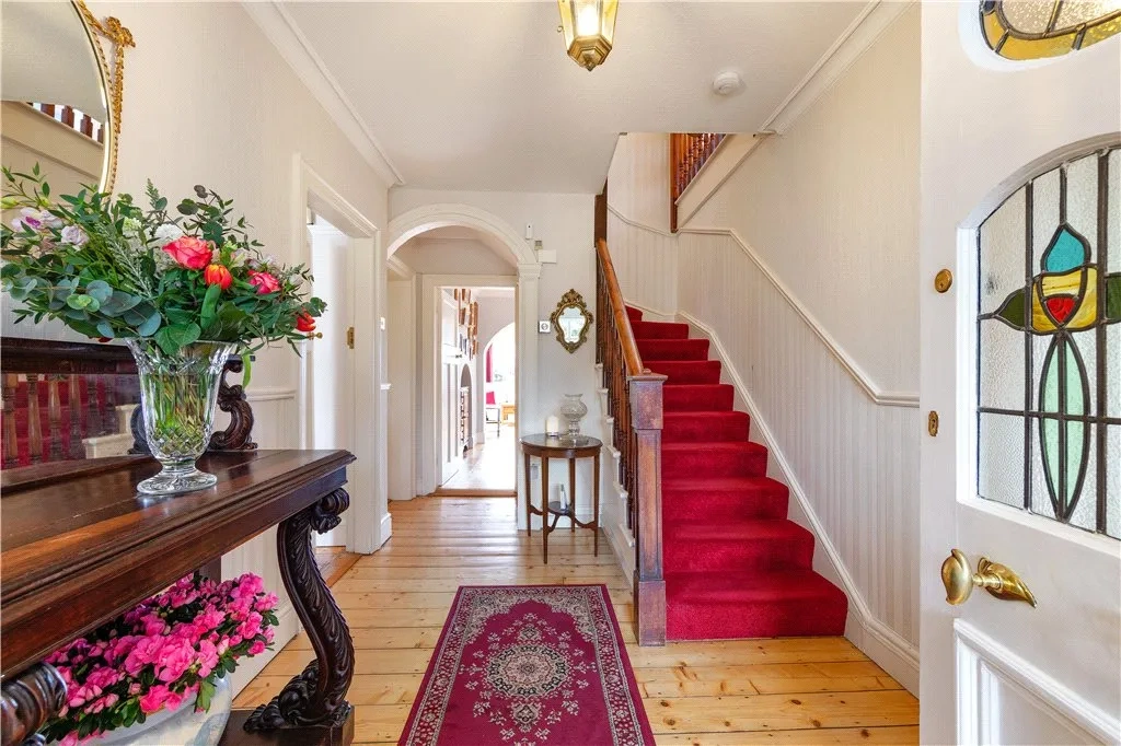 The accommodation comprises an enclosed porch entrance, reception hall, two interconnecting reception rooms (a drawing room with double doors opens through to a dining room), family room/home office with an ensuite shower room. To the rear, there is a living room, separate kitchen and utility room with a door leading out to the side passageway. From the living room, there are sliding patio doors connecting this space out to a large patio and the extensive southwest-facing rear garden. Upstairs there are five bedrooms and two generous bathrooms.