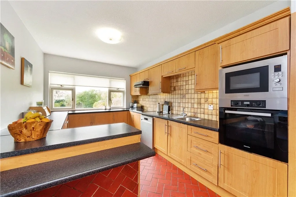 The family room/home office, ensuite shower room, breakfast room, living/sun room and kitchen can be found to the front of the house. The kitchen has been fitted with a good range of shaker-style cabinets along with a one and a half bowl stainless teel sink unit, a four-ring De Dietrich electric hob with extractor over, a dishwasher, a Miele oven with Belling microwave above and an integrated fridge/freezer.