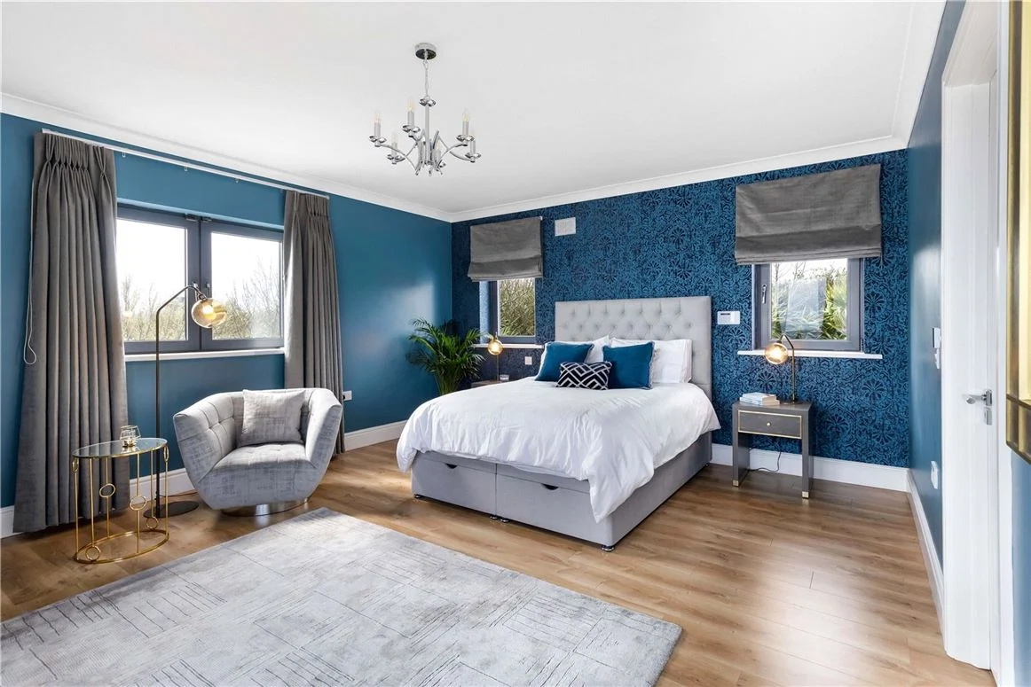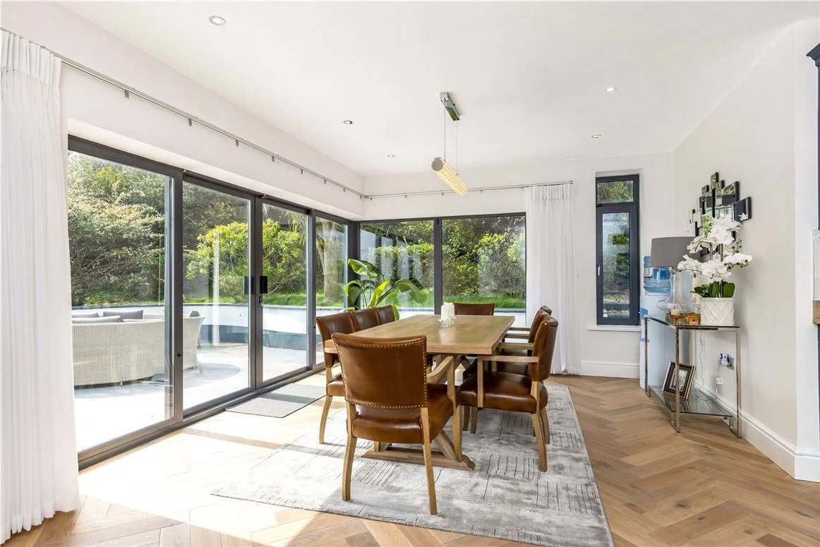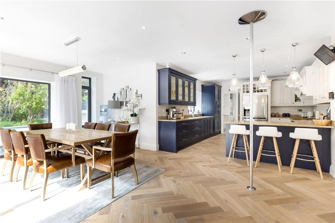 The kitchen is a combination of traditional and contemporary design, blending rich navy and grey coloured units to create a sophisticated and stylish space. An island unit with seating for three people and a large dining area, filled with natural light, make it the perfect space to cook and entertain guests.