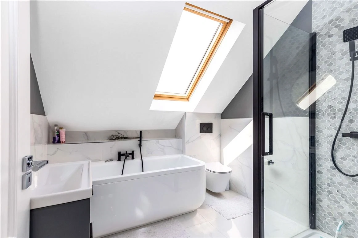 There are two bathrooms on this floor, both of which have been recently renovated to provide the ultimate in comfort and style. The main bathroom features a bathtub, a large shower, and a contemporary vanity unit with matte black fixtures throughout. The bathroom is flooded with natural light, from the large Velux window above the bathtub. The second bathroom is complete with beautiful marble tiles that cover the walls and floors, finished with a shower, hand basin and toilet.