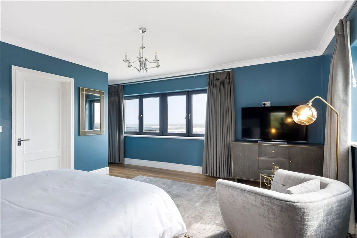 The master suite is a haven of comfort with unobstructed views of the sea, framed by the large picture windows. It is complemented by a walk-in wardrobe and a luxurious ensuite bathroom, featuring an impressive wet room shower and gold fixtures throughout, creating a sense of elegance.