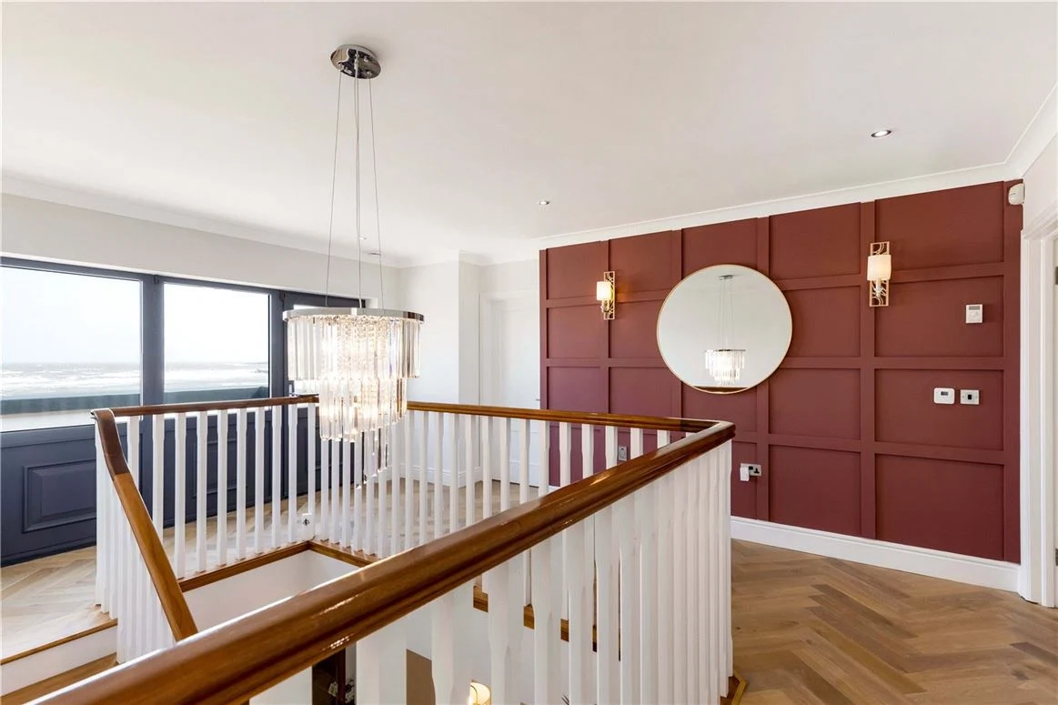 As you enter this stunning beachfront property, you are greeted by a grand entrance hall with a stunning pink wood-panelled feature wall and solid wood parquet flooring, setting the tone for the luxury and elegance that awaits you inside.