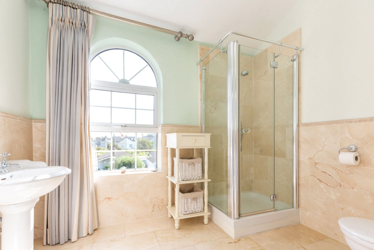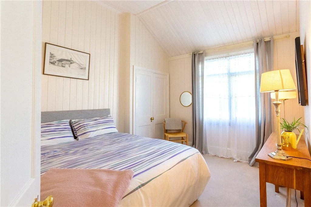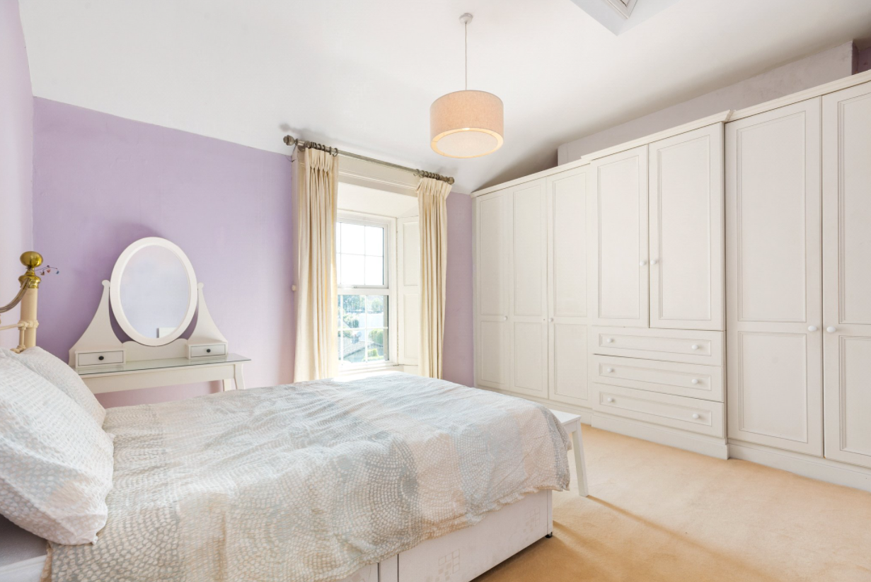 The four bedrooms sit across the two upper floors. The main bedroom is spacious with a marble fireplace, fitted wardrobes and sea views, while two of the remaining bedrooms have cast iron fireplaces.