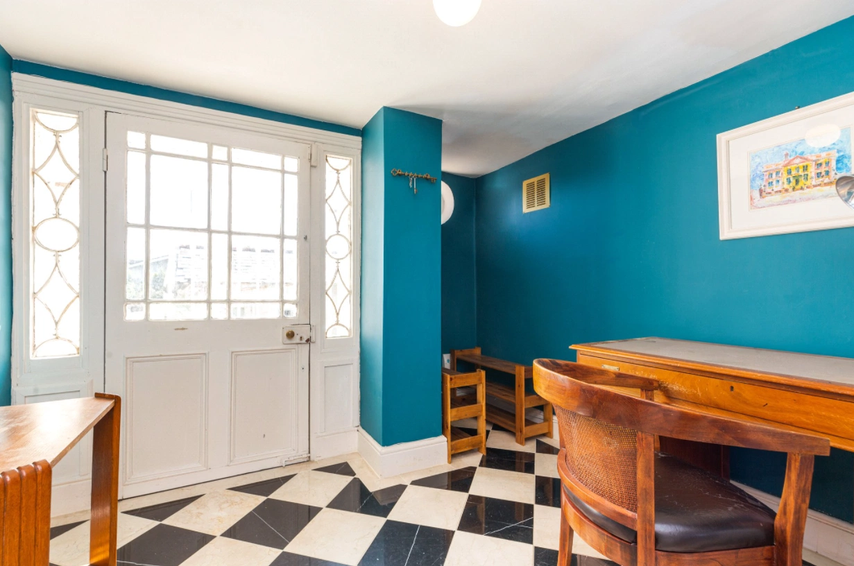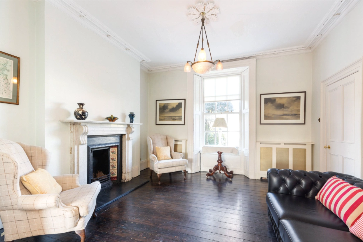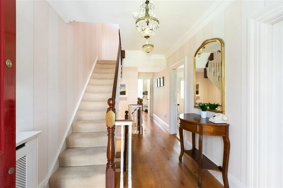 You enter the home through the original front door with a fanlight into the hallway, which has a tiled floor, ceiling cornicing, dado rail and French doors to back hall. This leads to the drawing room and dining room, which are connected by a large opening.