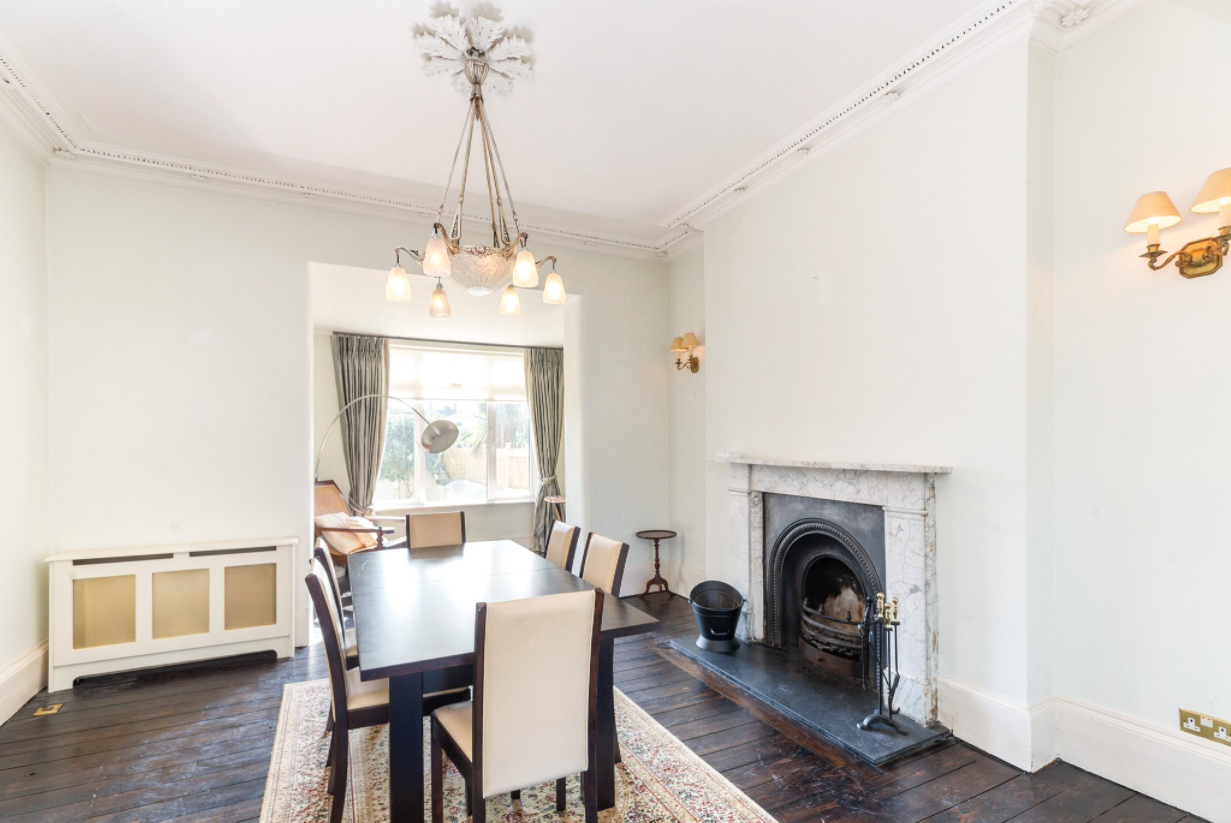 Both of these spaces have original stained timber floors, high ceilings with decorative coving, and marble fireplaces, while the dining room has a small reading area with fitted shelves.