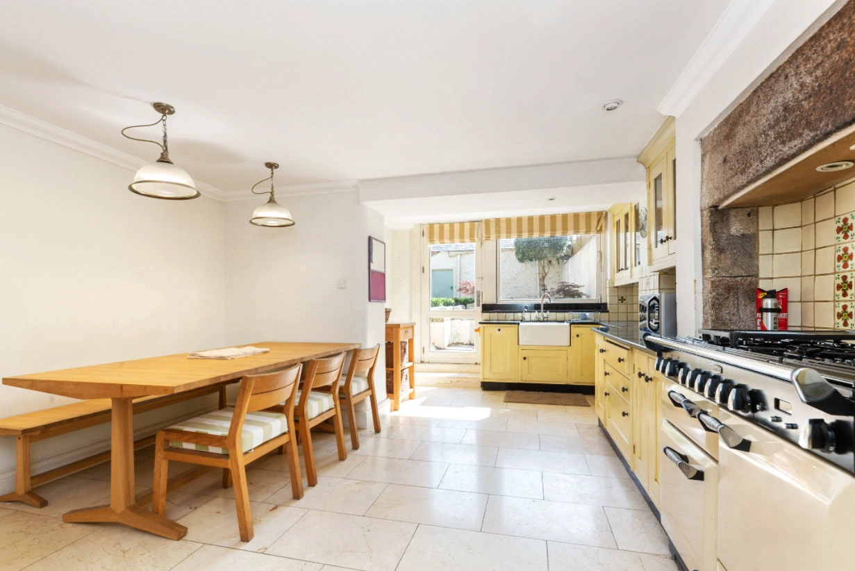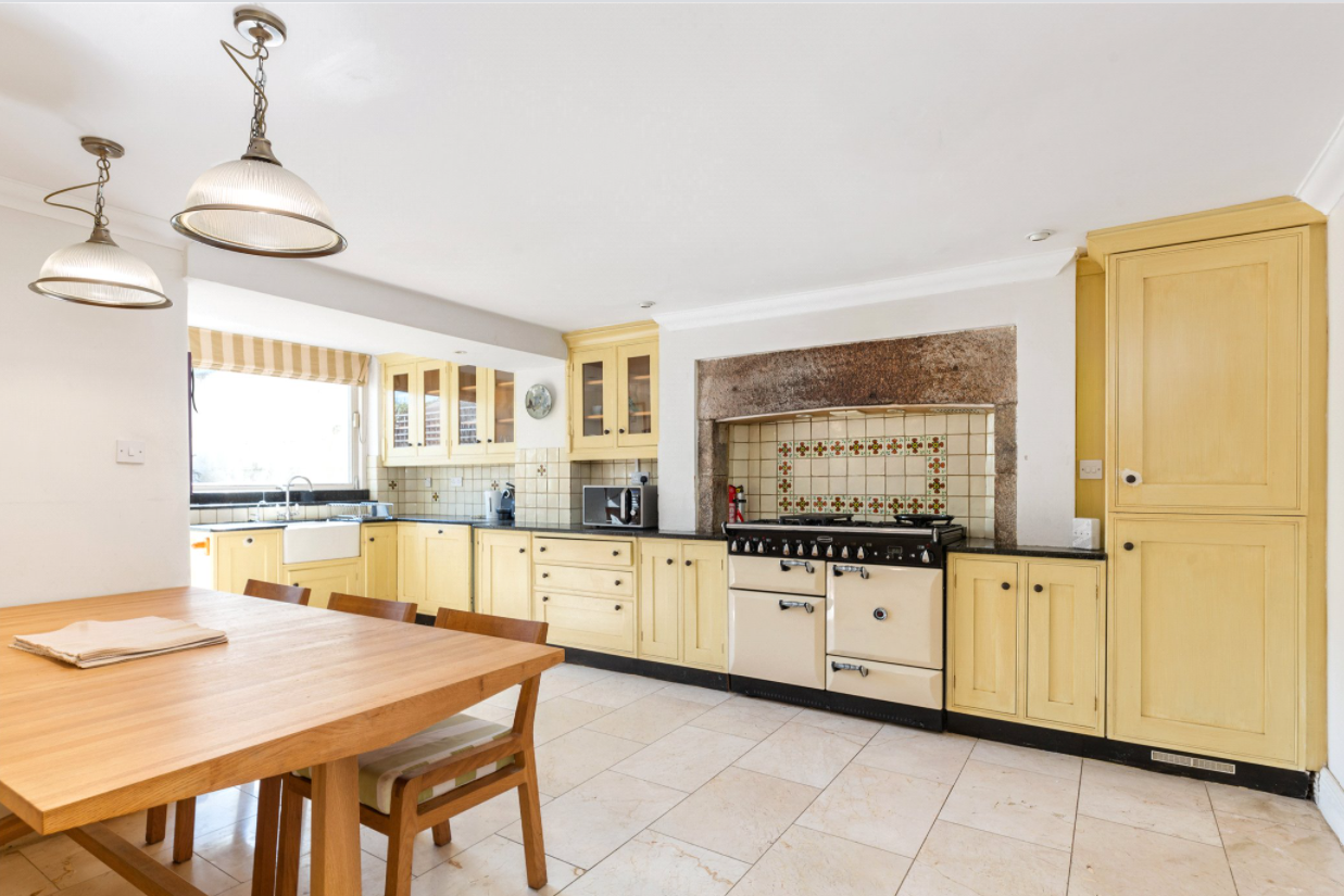 The country-style kitchen and breakfast room sit to the rear, fitted with bespoke units and granite worktops, as well as a range and a Belfast sink. A door leads out to the back garden.