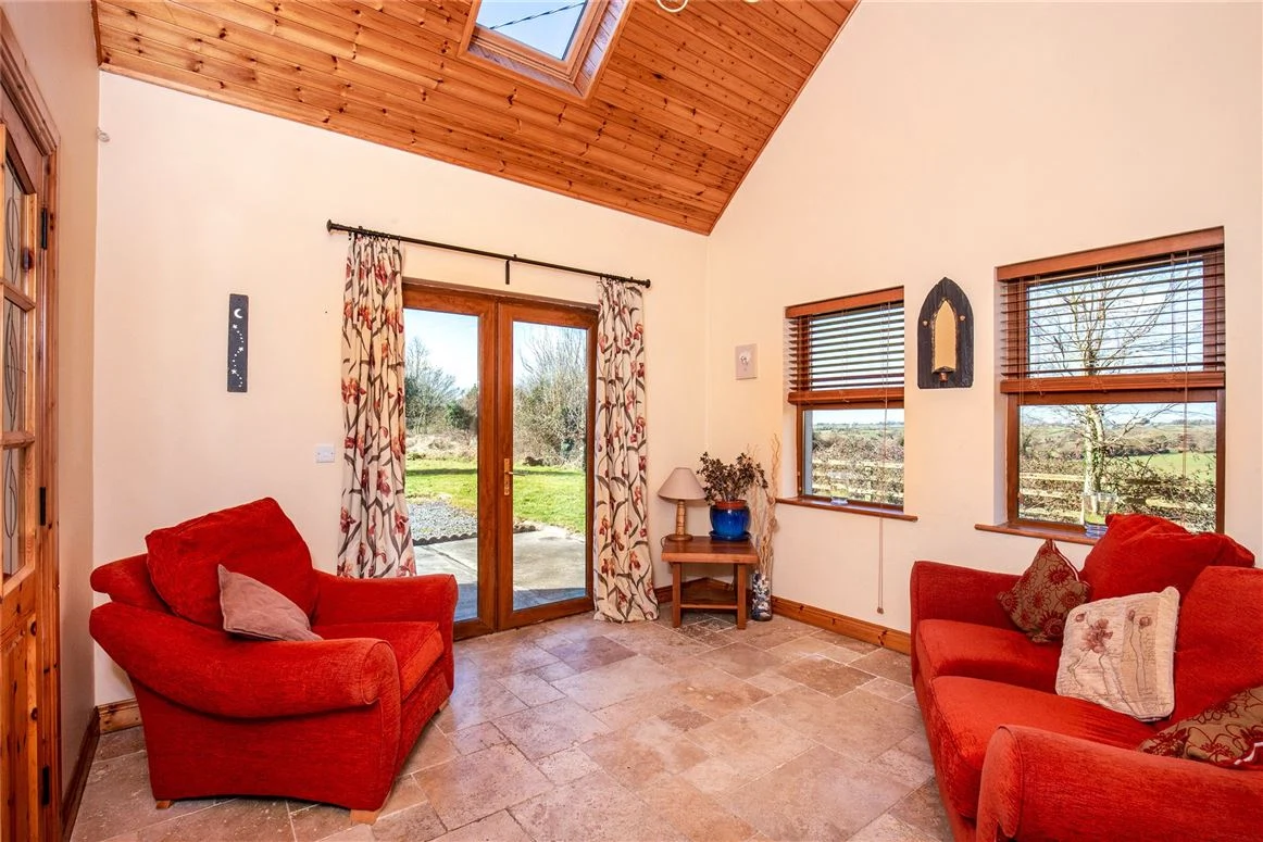 Connected to this room is a second living space, this one has views of the garden on three sides, a high vaulted ceiling and French doors leading out to the garden, and so has a great connection to the outdoors.