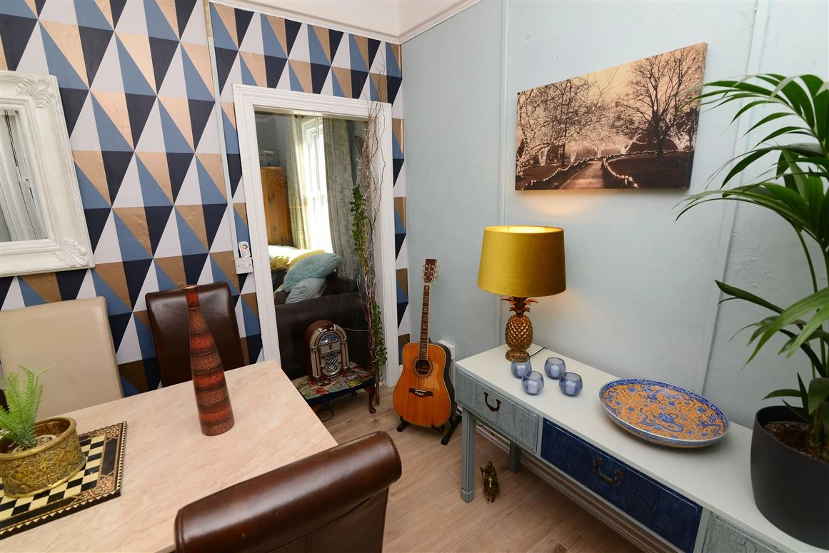 To the back of the house is the open-plan kitchen and dining room. A stove acts as a focal point for the space, with a brick surround while there is plenty of space to fit a dining table, perfect for gatherings.