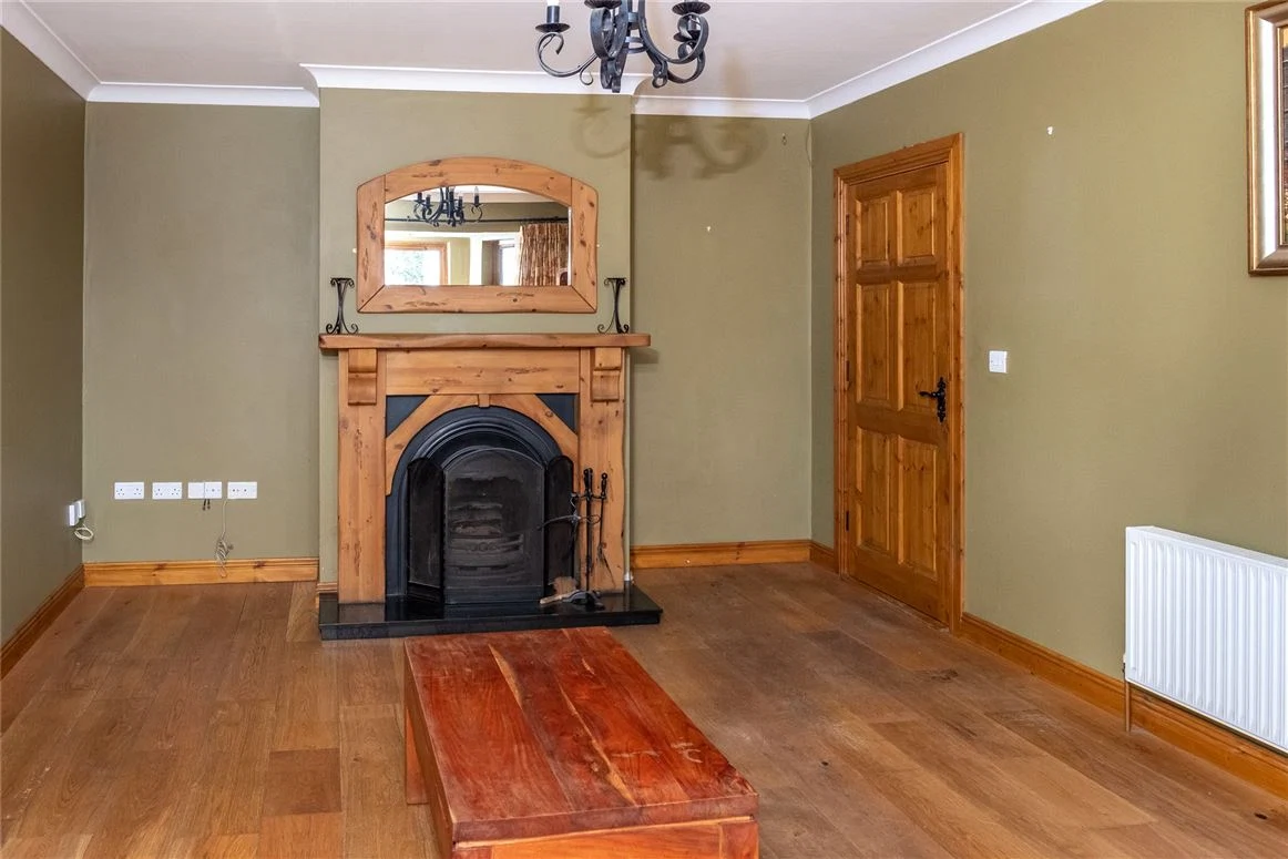 Situated in a picturesque rural location between Loughrea and Gort, Ballymullen is a charming four-bed house. You enter the home into a tiled hallway. To the left of this space is a sitting room with a bay window. Painted in a dusky olive green and featuring a wood and cast iron fireplace, it’s a cosy space.