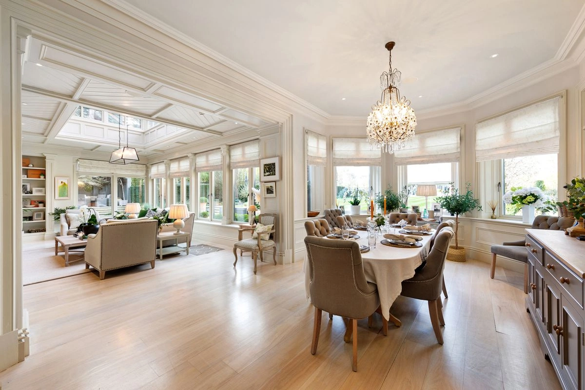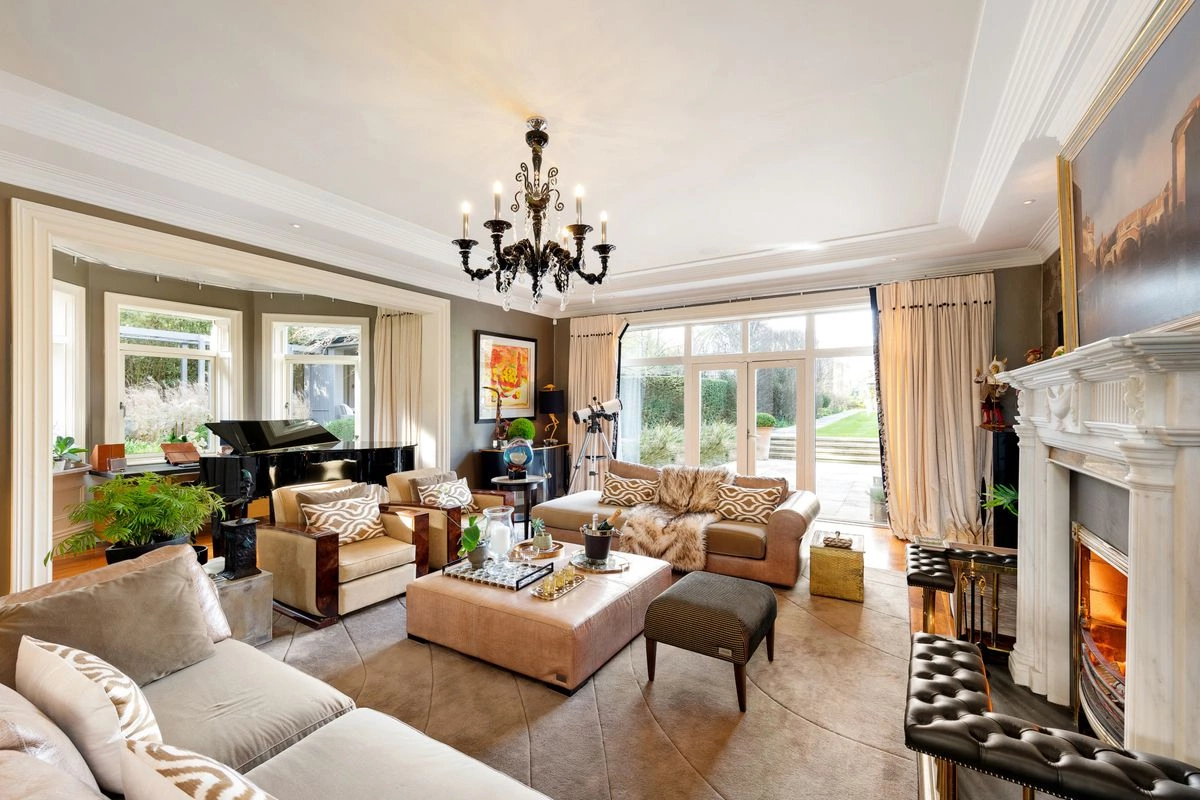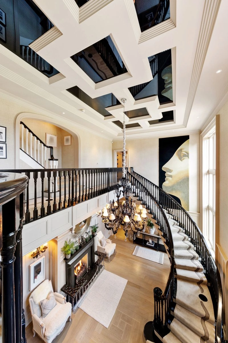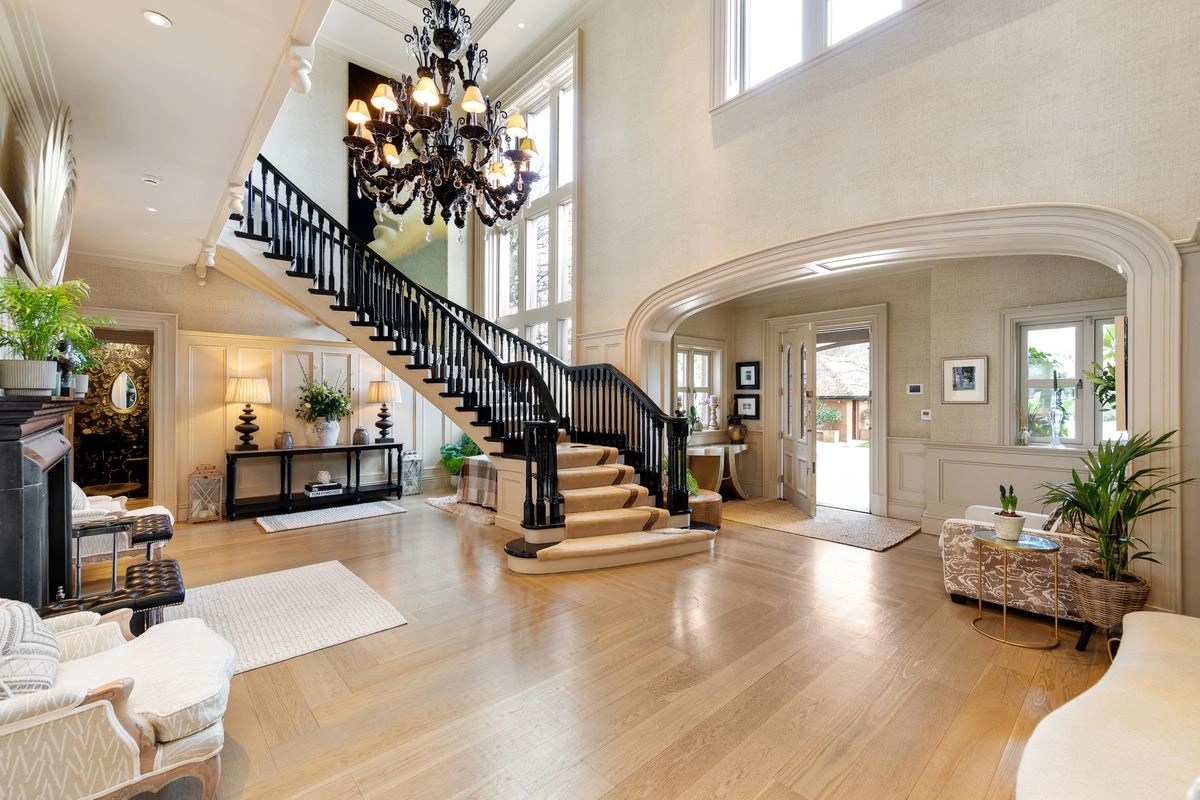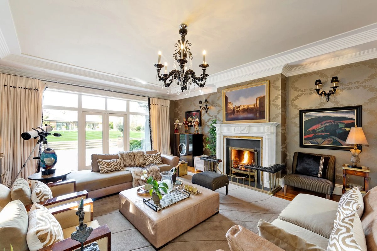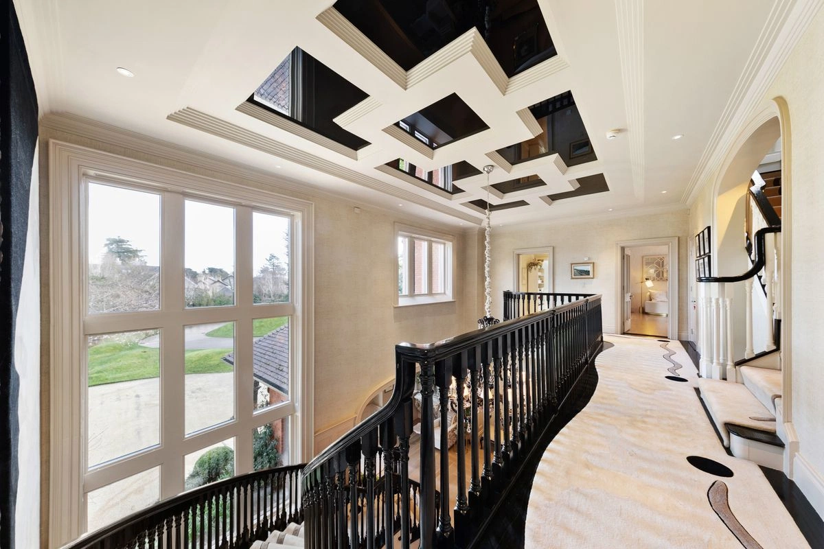 The interior is fresh and contemporary with warm colours helping to create a cosy atmosphere. A black limestone fireplace can be found in the entrance hallway, along with solid oak flooring and wall panelling. A coffered ceiling with black glass inset adds further appeal while the double-height window enhances the drama of the spectacular Barovier and Toso Murano Glass 12-arm “Taif” chandelier.
