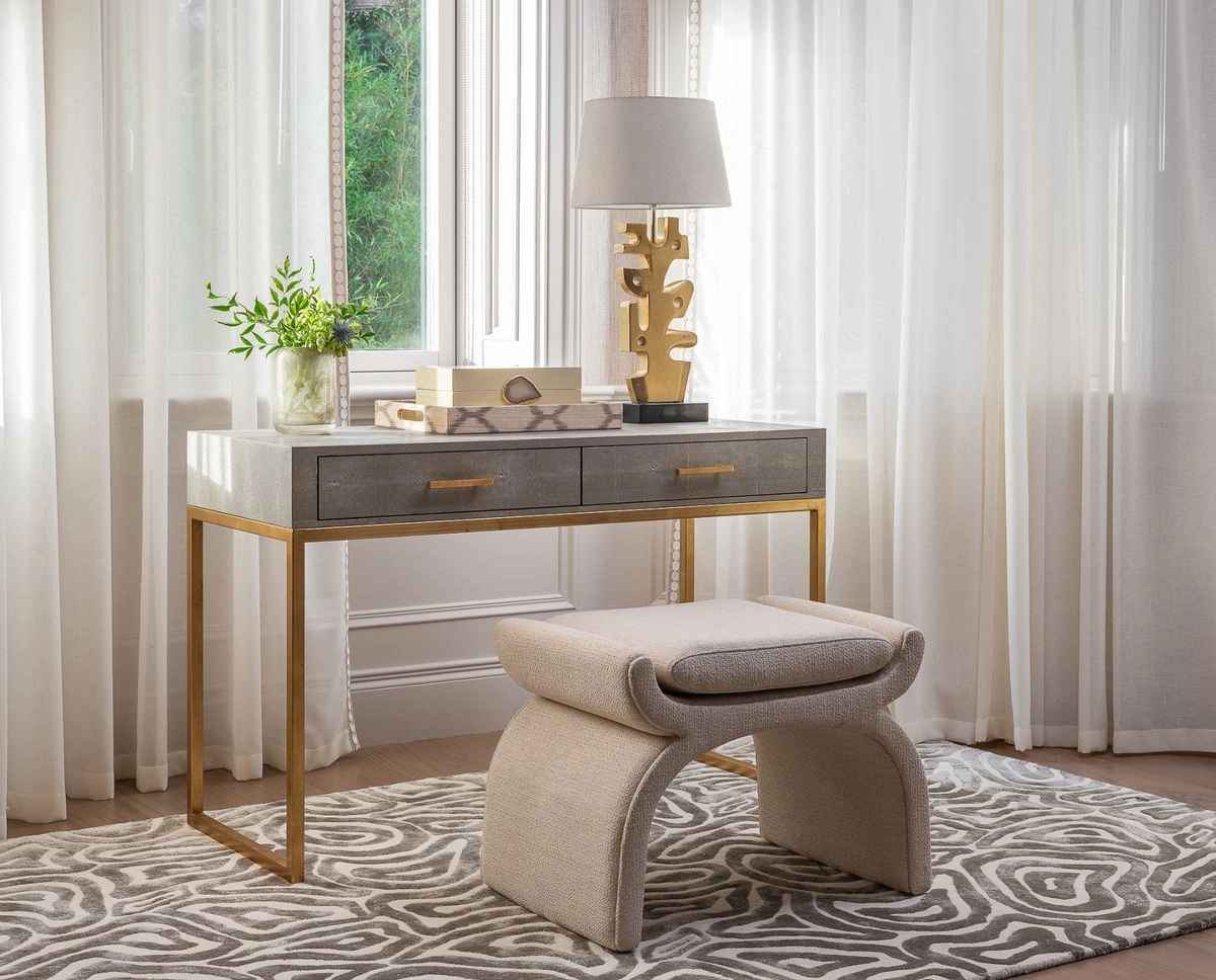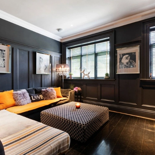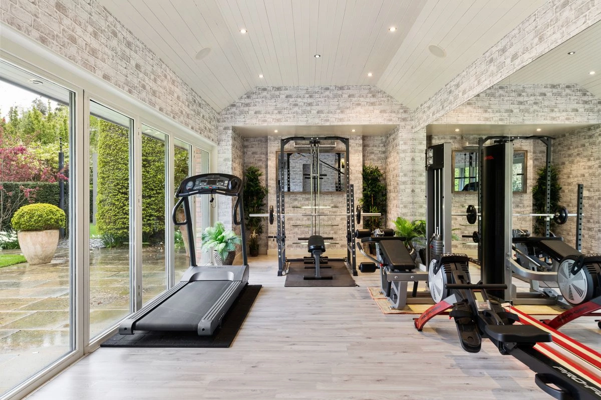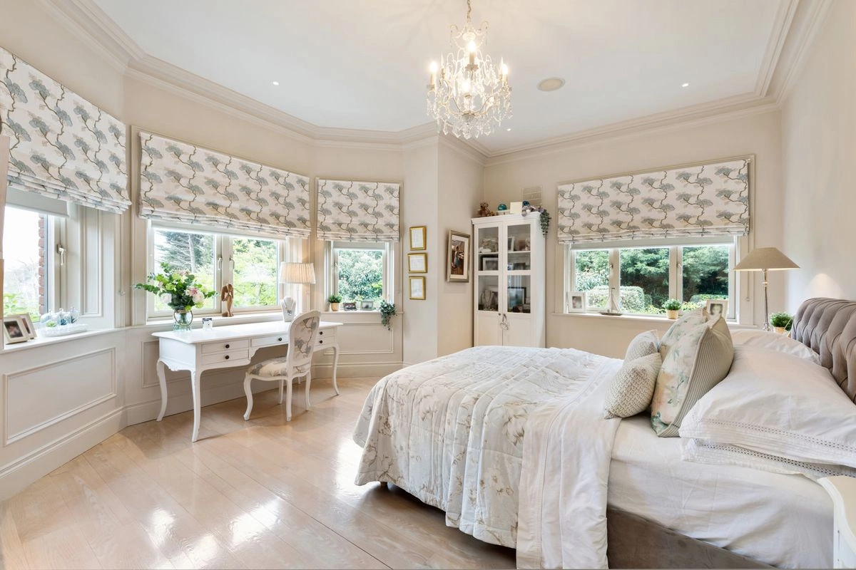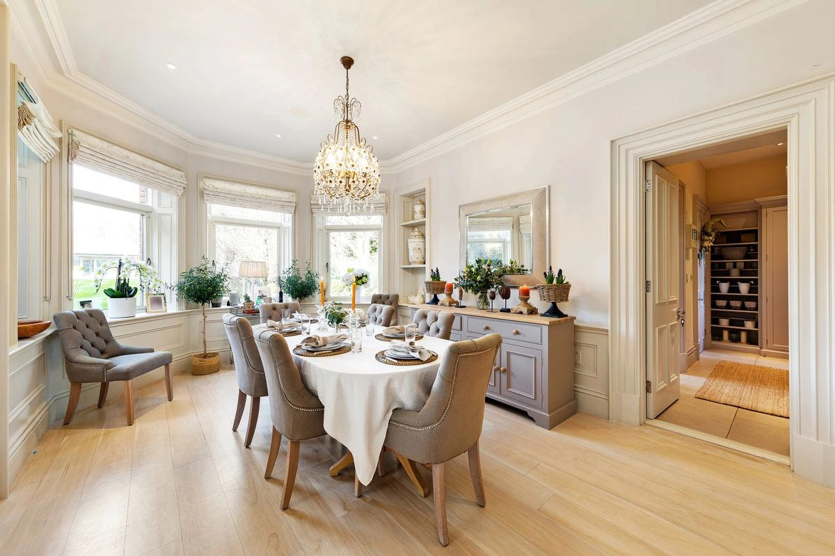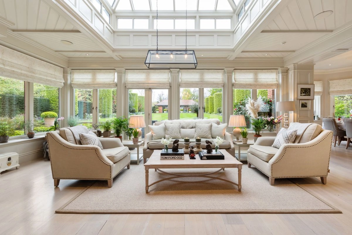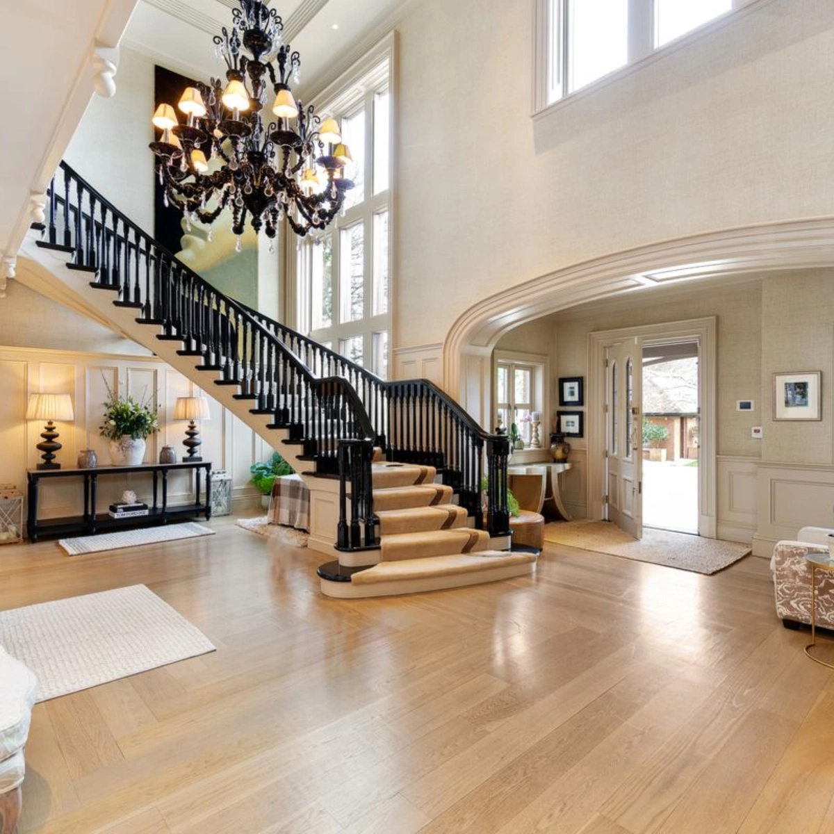 The interior is fresh and contemporary with warm colours helping to create a cosy atmosphere. A black limestone fireplace can be found in the entrance hallway, along with solid oak flooring and wall panelling. A coffered ceiling with black glass inset adds further appeal while the double-height window enhances the drama of the spectacular Barovier and Toso Murano Glass 12-arm “Taif” chandelier.